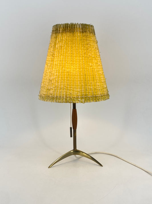 Ausgefallene Tischlampe aus Messing, Teakholz und gelbem Plissee Schirm