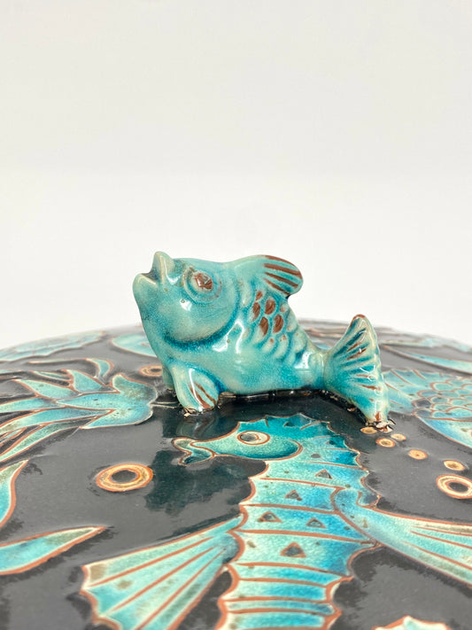 Große Fisch-Deckeldose "4816" von Gustav Heinkel für Karlsruher Majolika, 1937