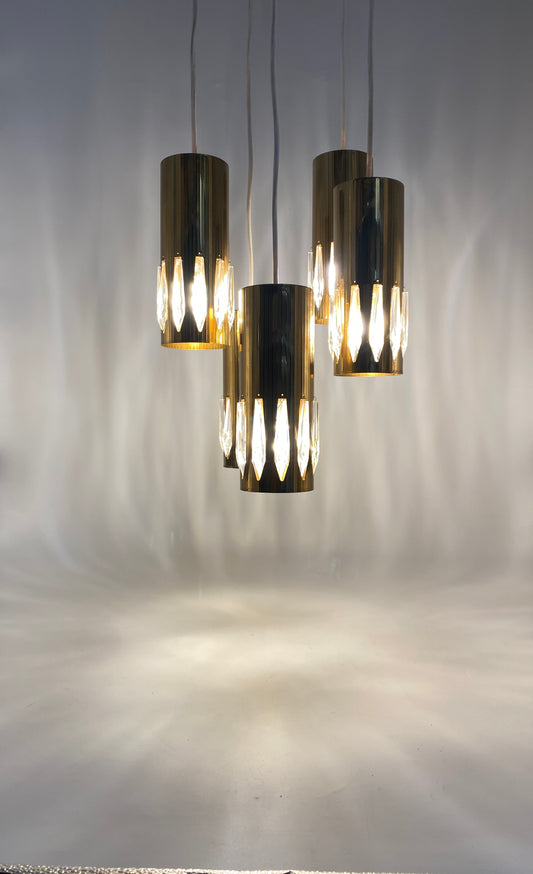 Deckenlampe "Kaskadenlampe" 5-flammig mit goldenen Zylinder-Schirmen und Glas-Kristall-Tropfen, 1960er