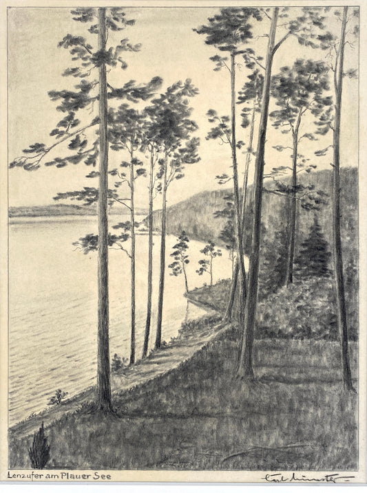 Signierte Kohlezeichnung "Lenzufer am Plauer See" von Carl Münster in Passepartout