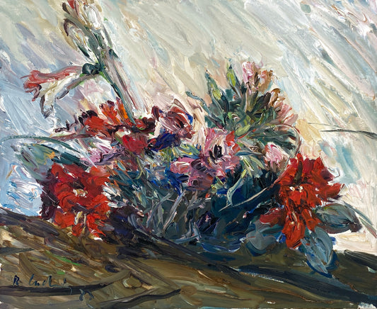 Ölgemälde "Amaryllen und Tulpen und Lilien" von Roland Ladwig auf Leinwand, 1987