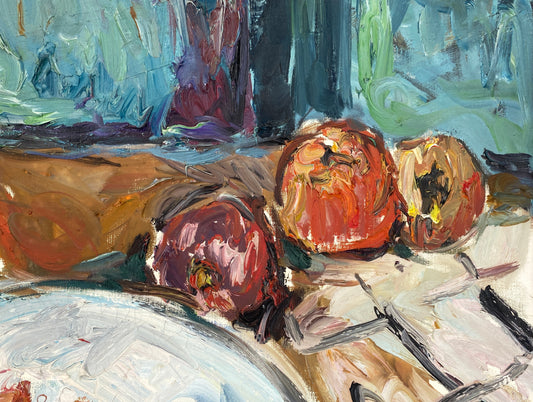 Ölgemälde "Weißer Teller, Äpfel" von Roland Ladwig auf Leinwand