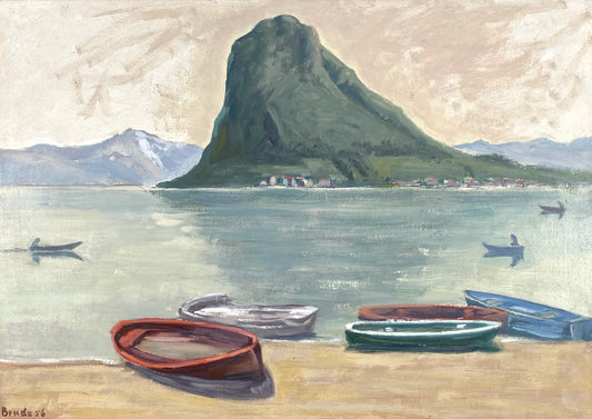 Ölgemälde "Luganer See mit Blick auf den Monte San Salvatore" von Erhard Brude (1874–1959) aus dem Jahr 1956