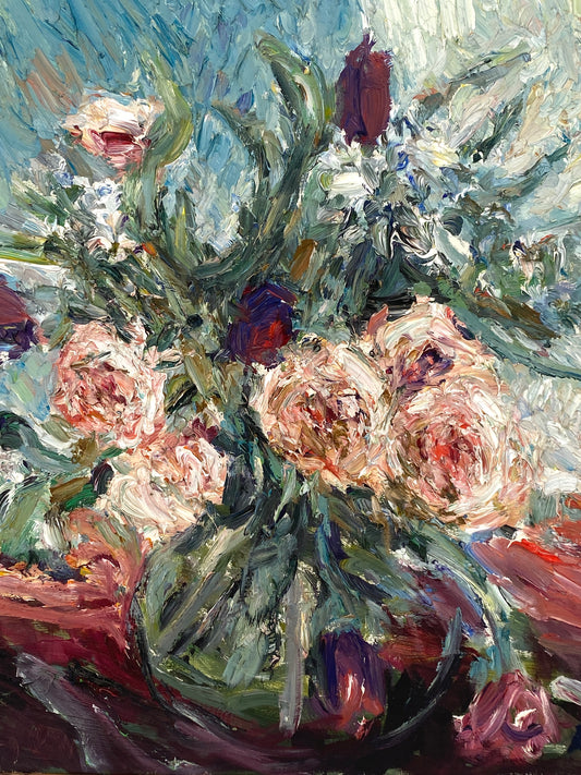 Ölgemälde "Blumenstrauß in Glasvase" von Roland Ladwig auf Leinwand, 1980-1991