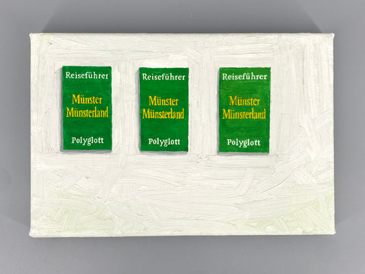 Signiertes Ölgemälde "Drei Reiseführer für Frau Feldmann" auf Leinwand von Peter Zimmermann, 1992