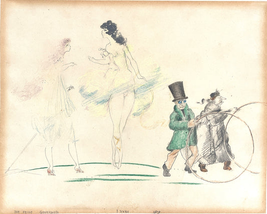 Bunt- und Bleistiftzeichnung "Die feine Governess" von Fritz von Herzmanovsky-Orlando, 1919