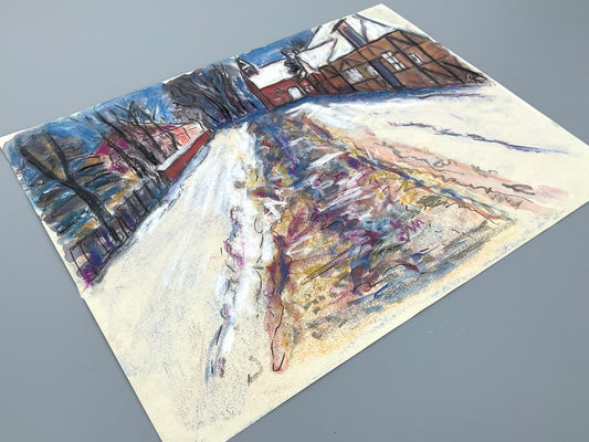 Zartes Pastellgemälde "Straßenansicht im Winter" von Gertrud Kelletat, 1986