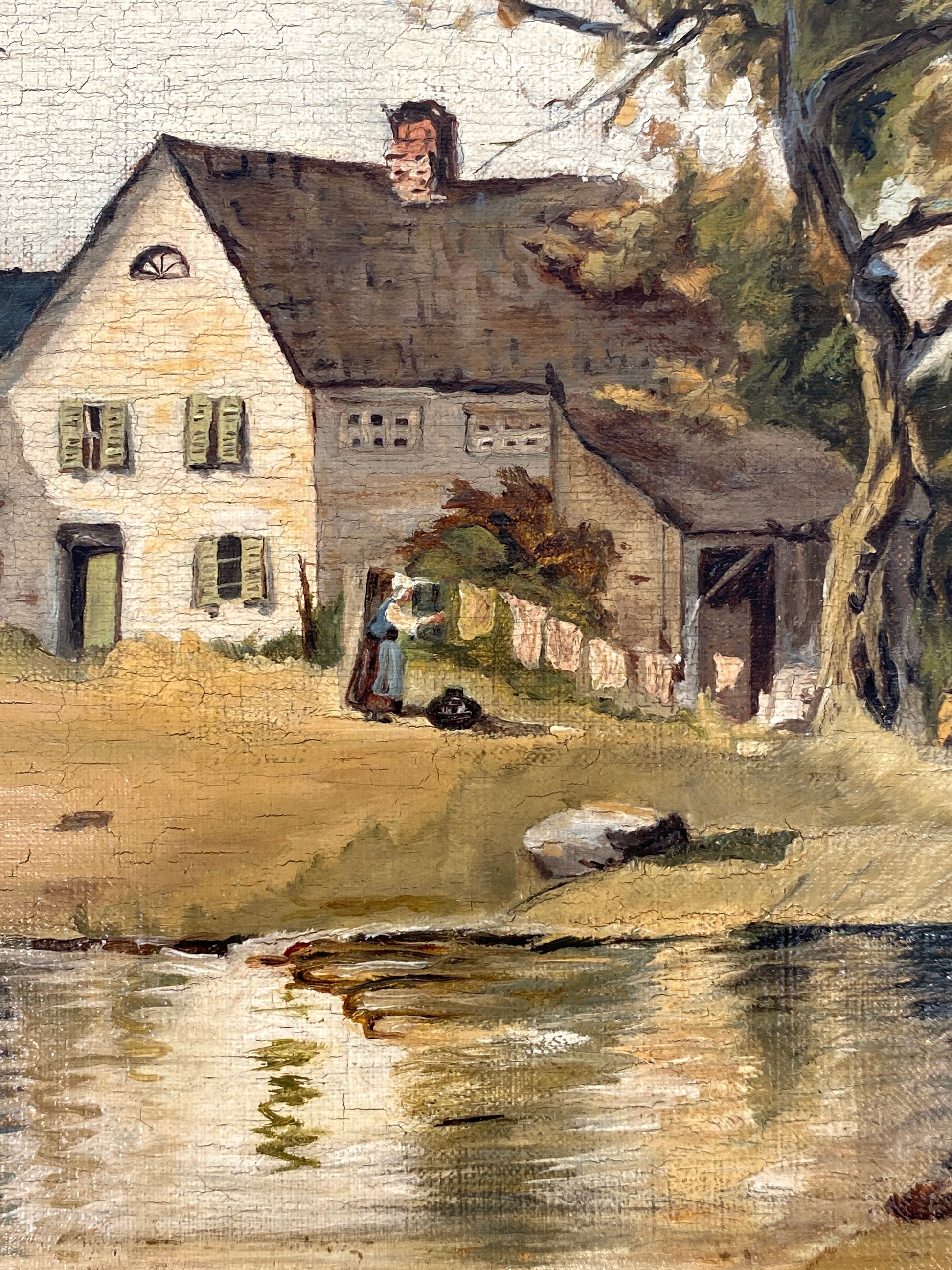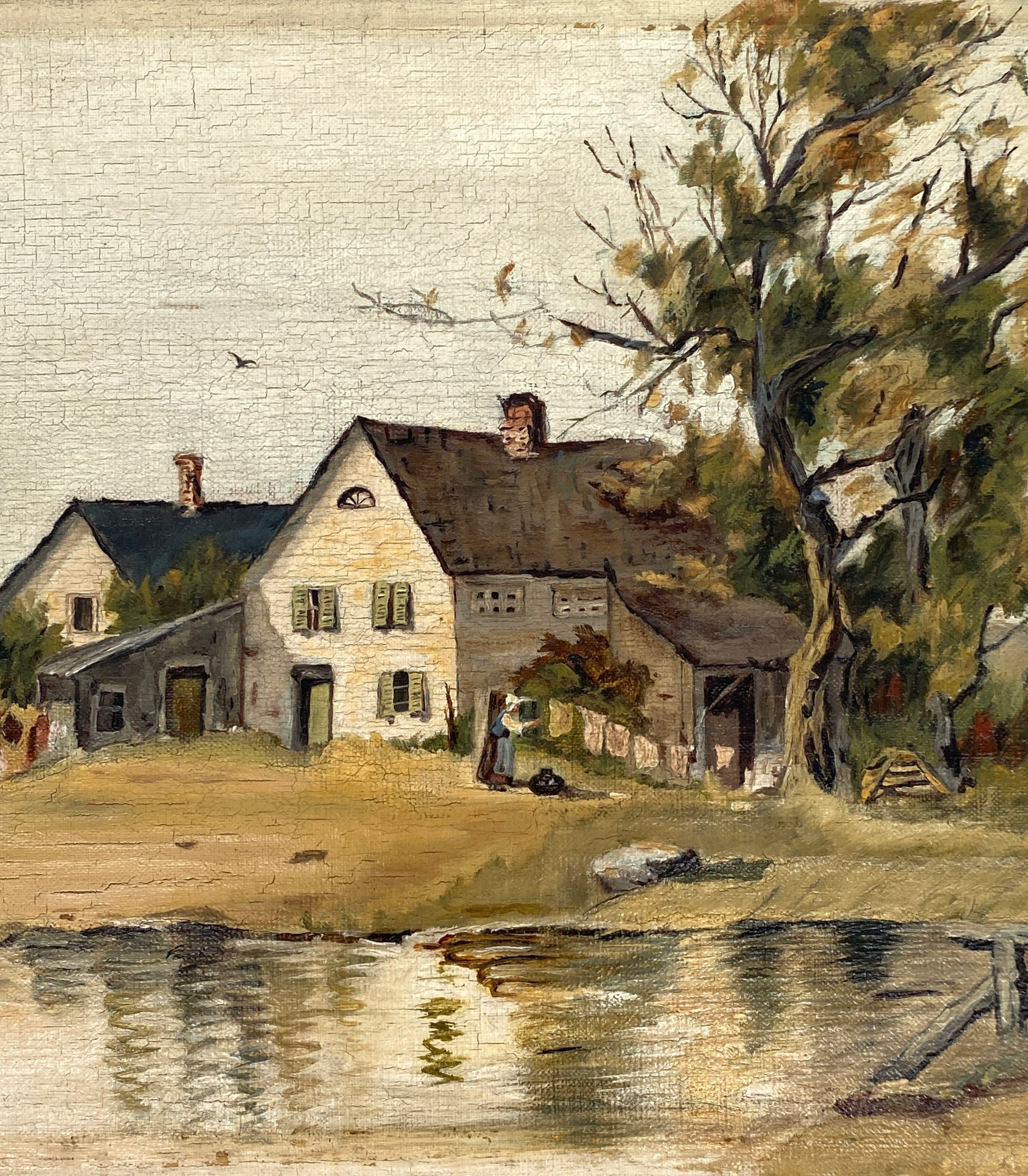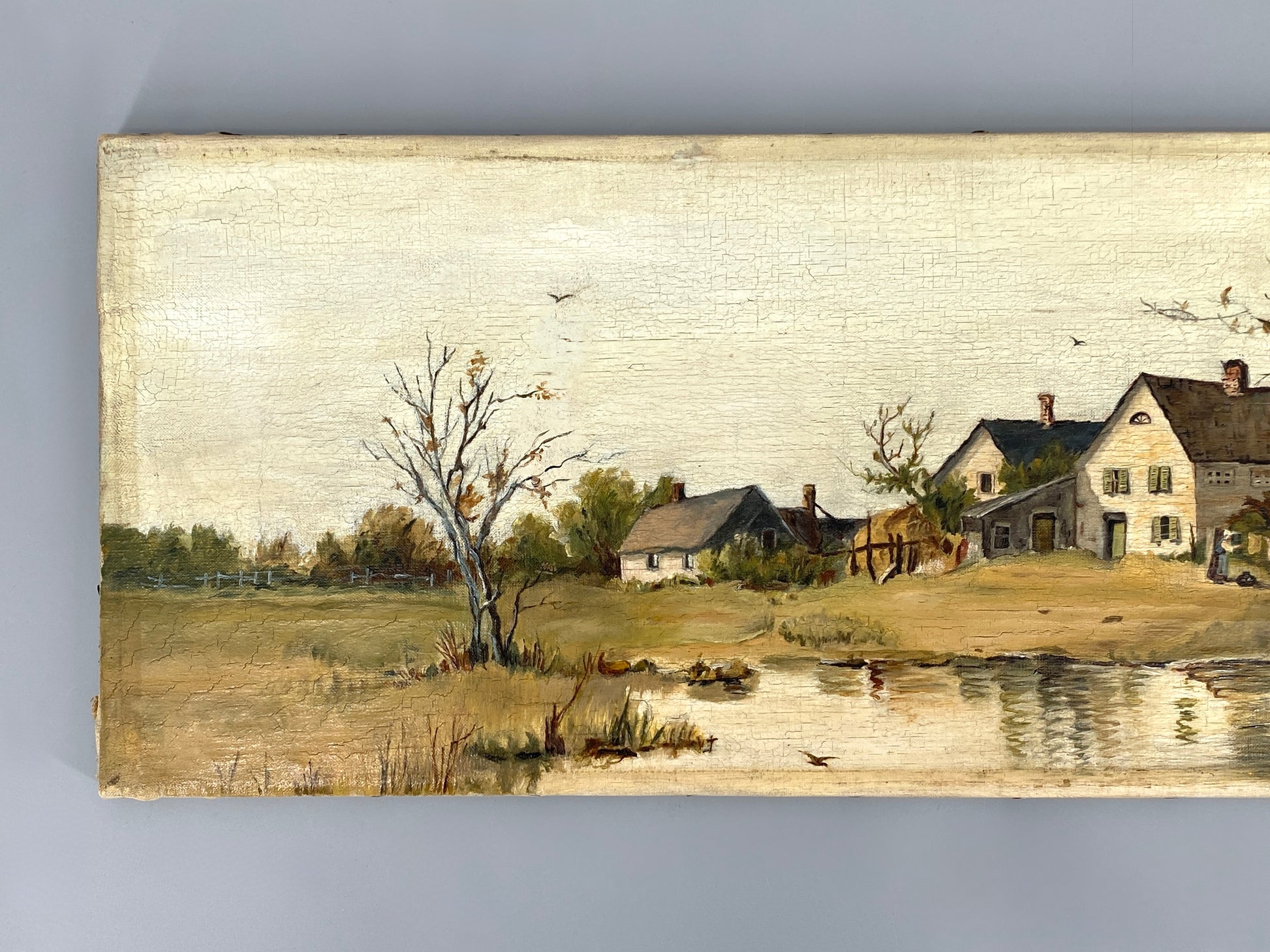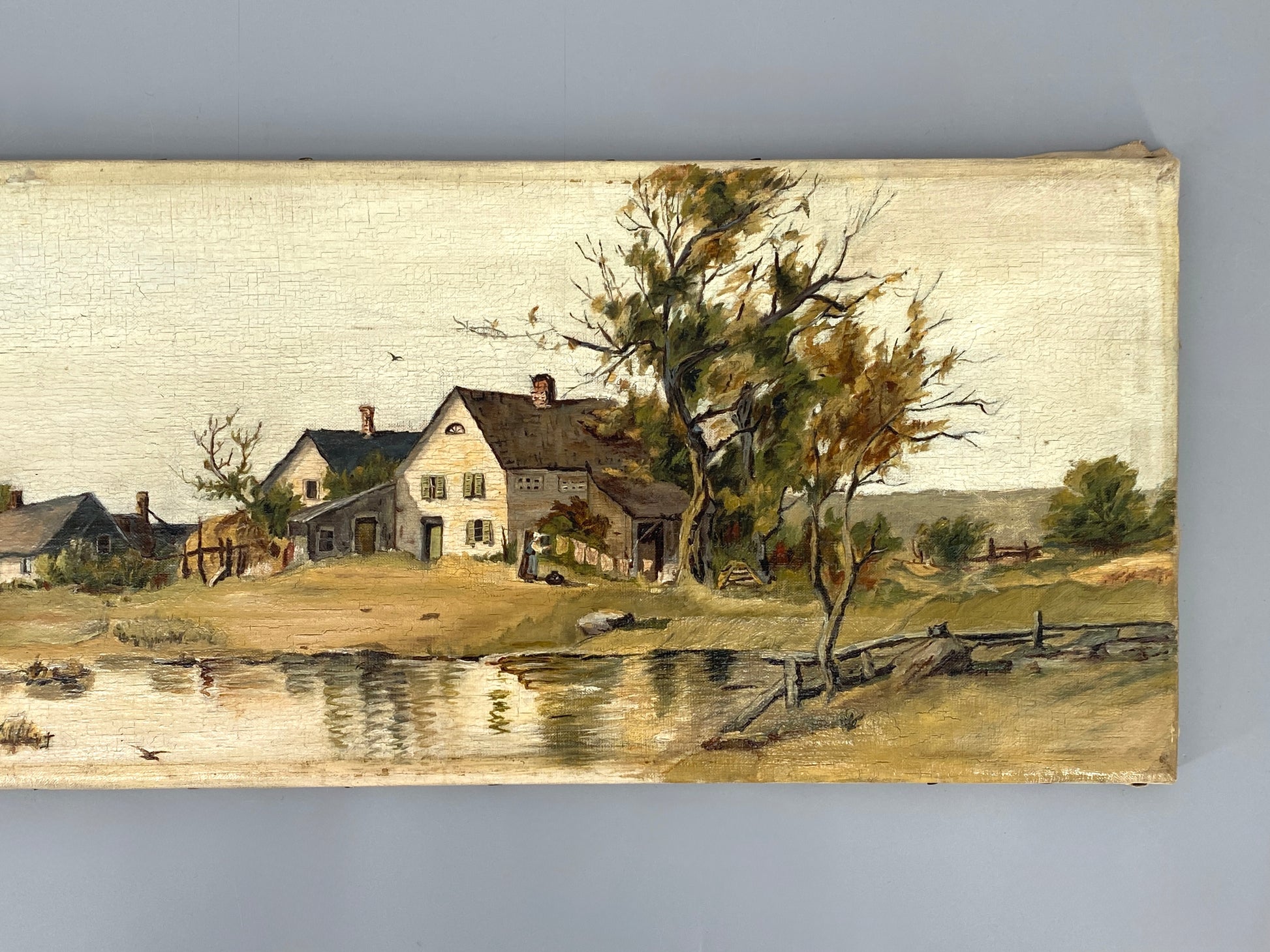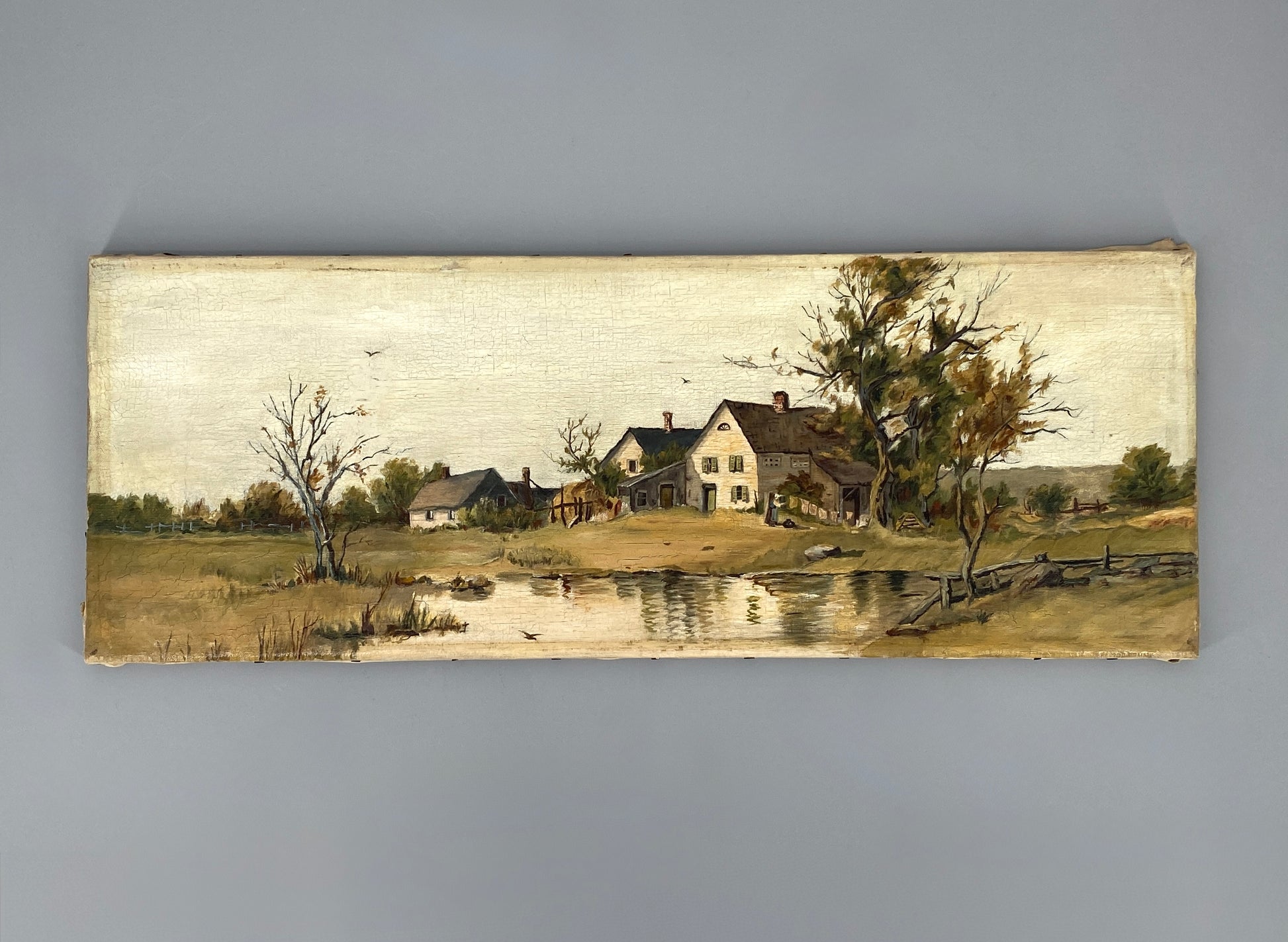* ÖLGEMÄLDE LANDSCHAFT BAUERNHOF LANDGUT SEE WEIHER GENREMALEREI UNIKAT ANTIK