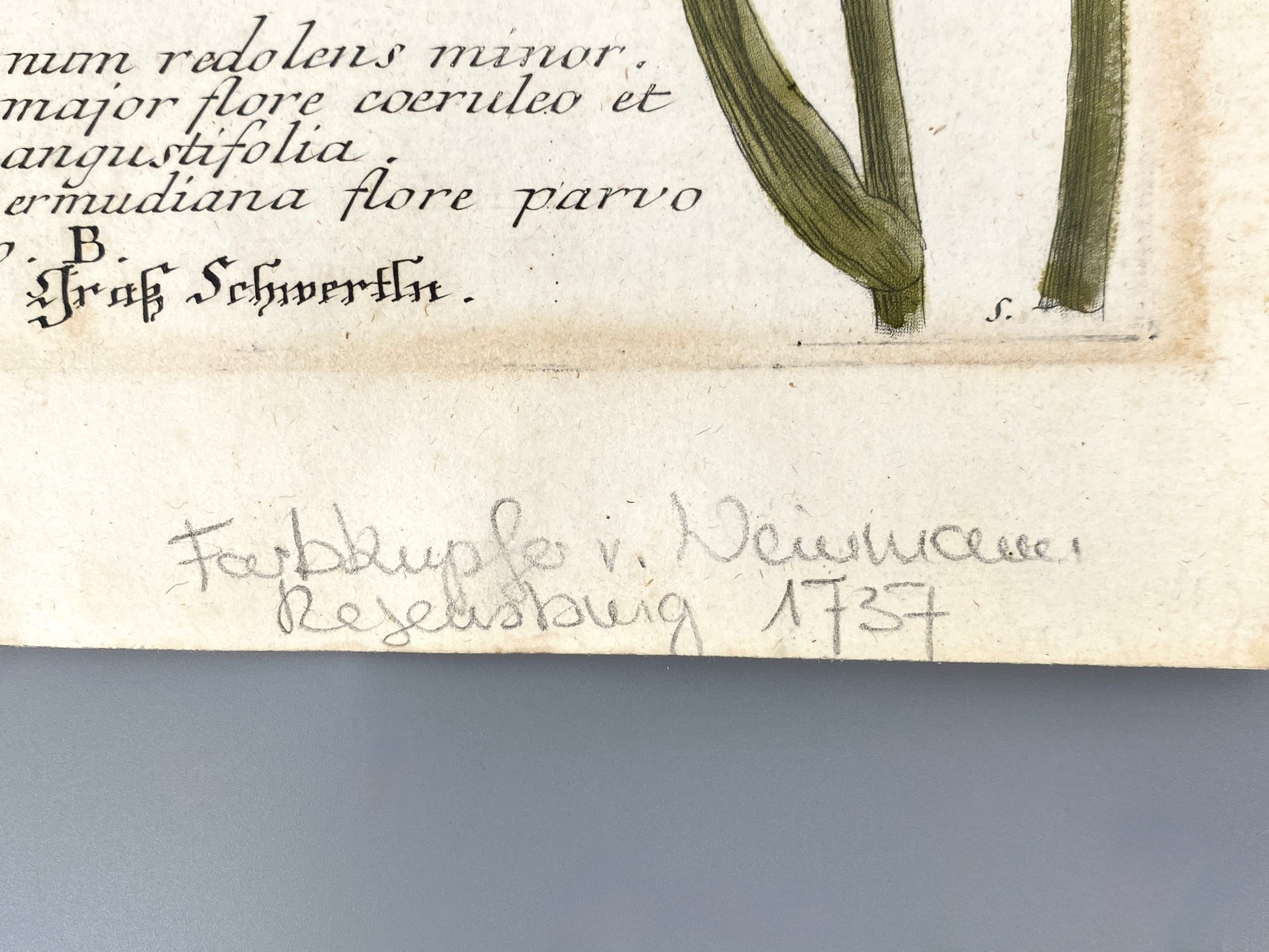 * GRAFIK MEZZOTINTO KUPFERSTICH JOHANN WILHELM WEINMANN GEORGE EHRET SCHWERTLILIEN IRIS ALTKOLORIERT ANTIK BOTANIK PFLANZEN