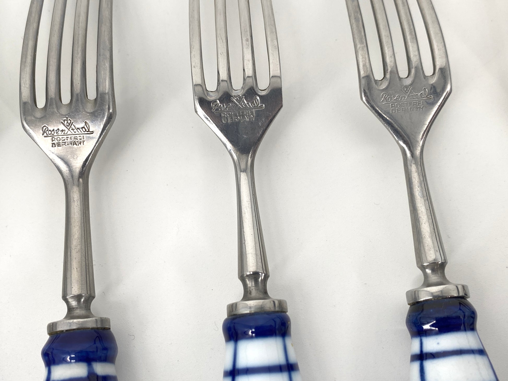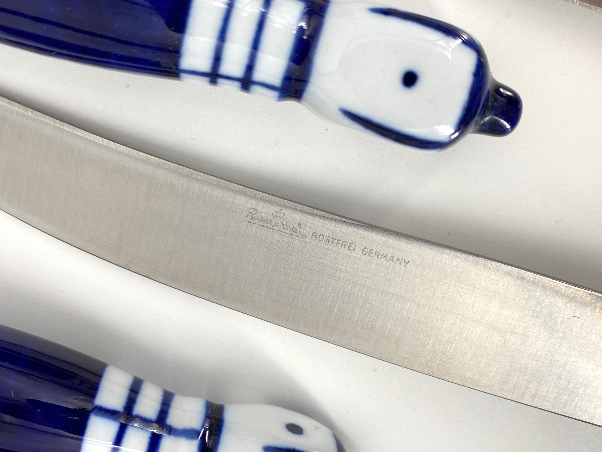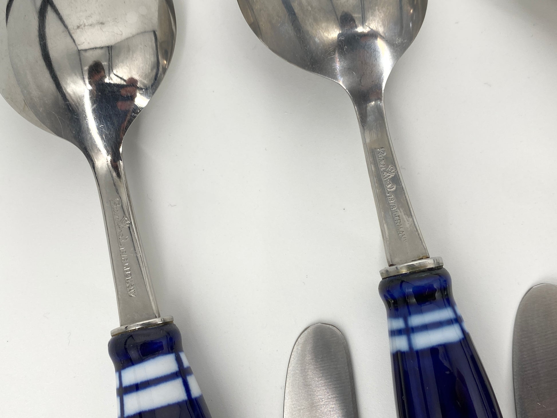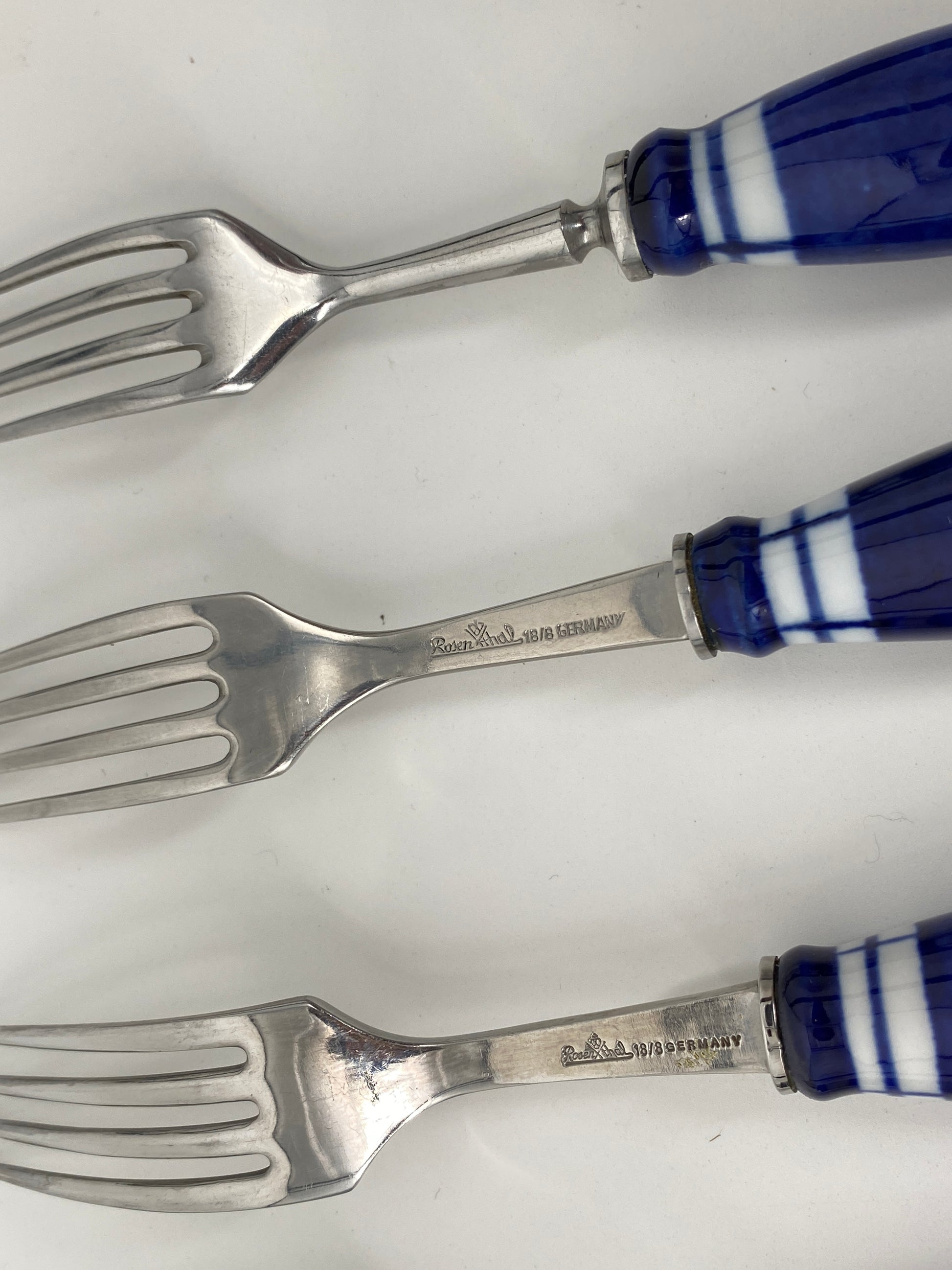 * die Griffstücke sind aus weißem Porzellan mit kobaltblauer Bemalung
