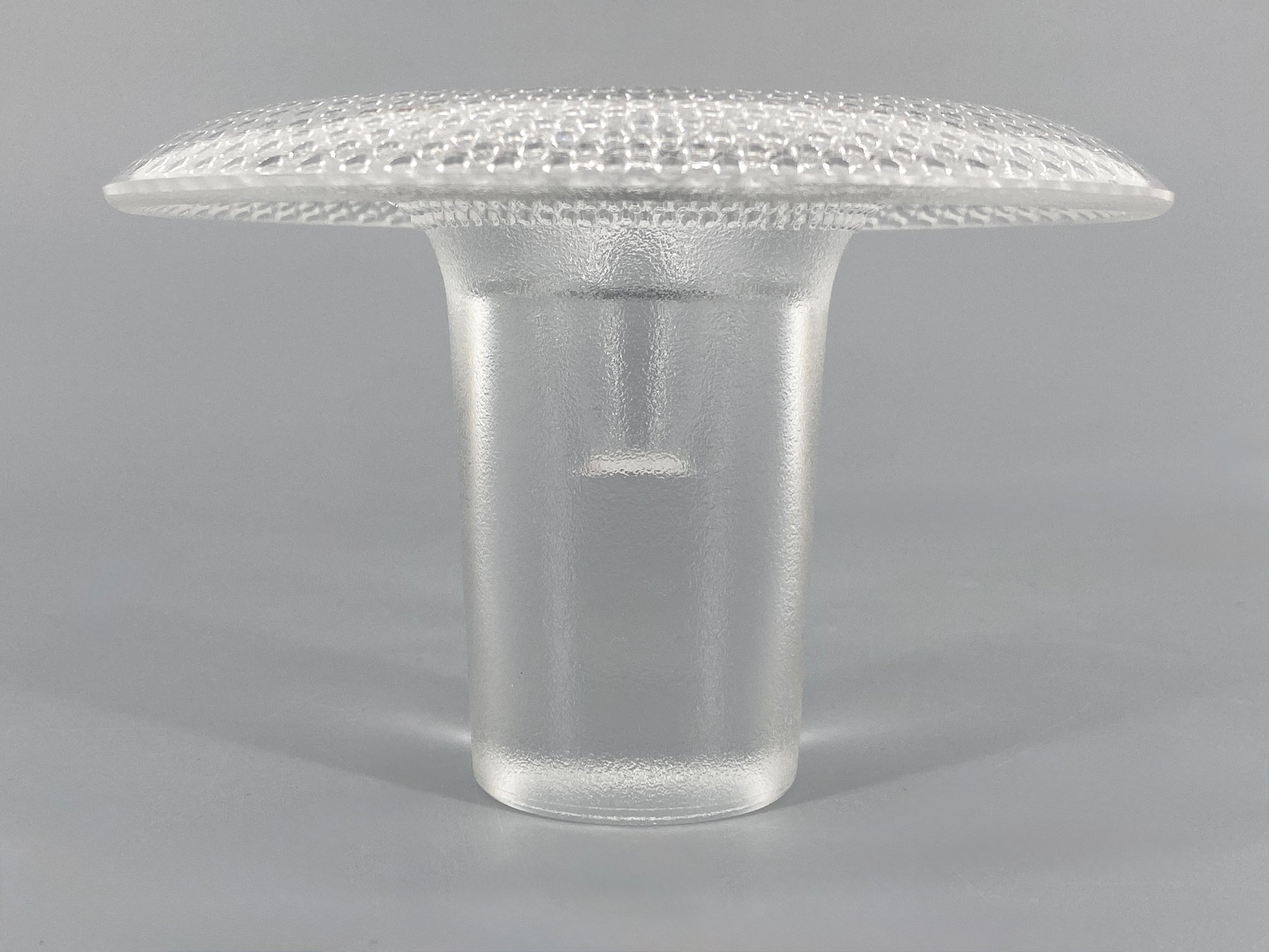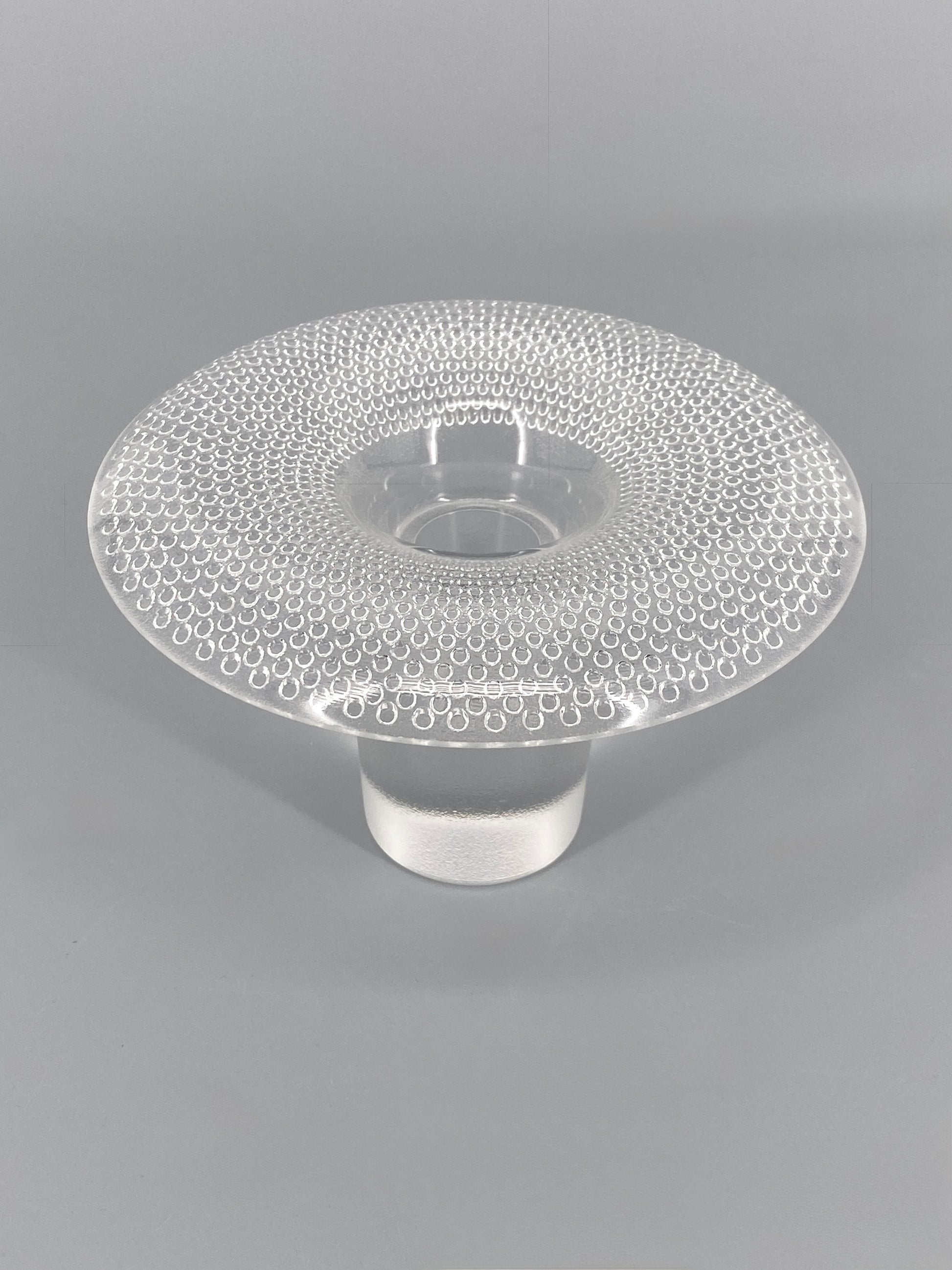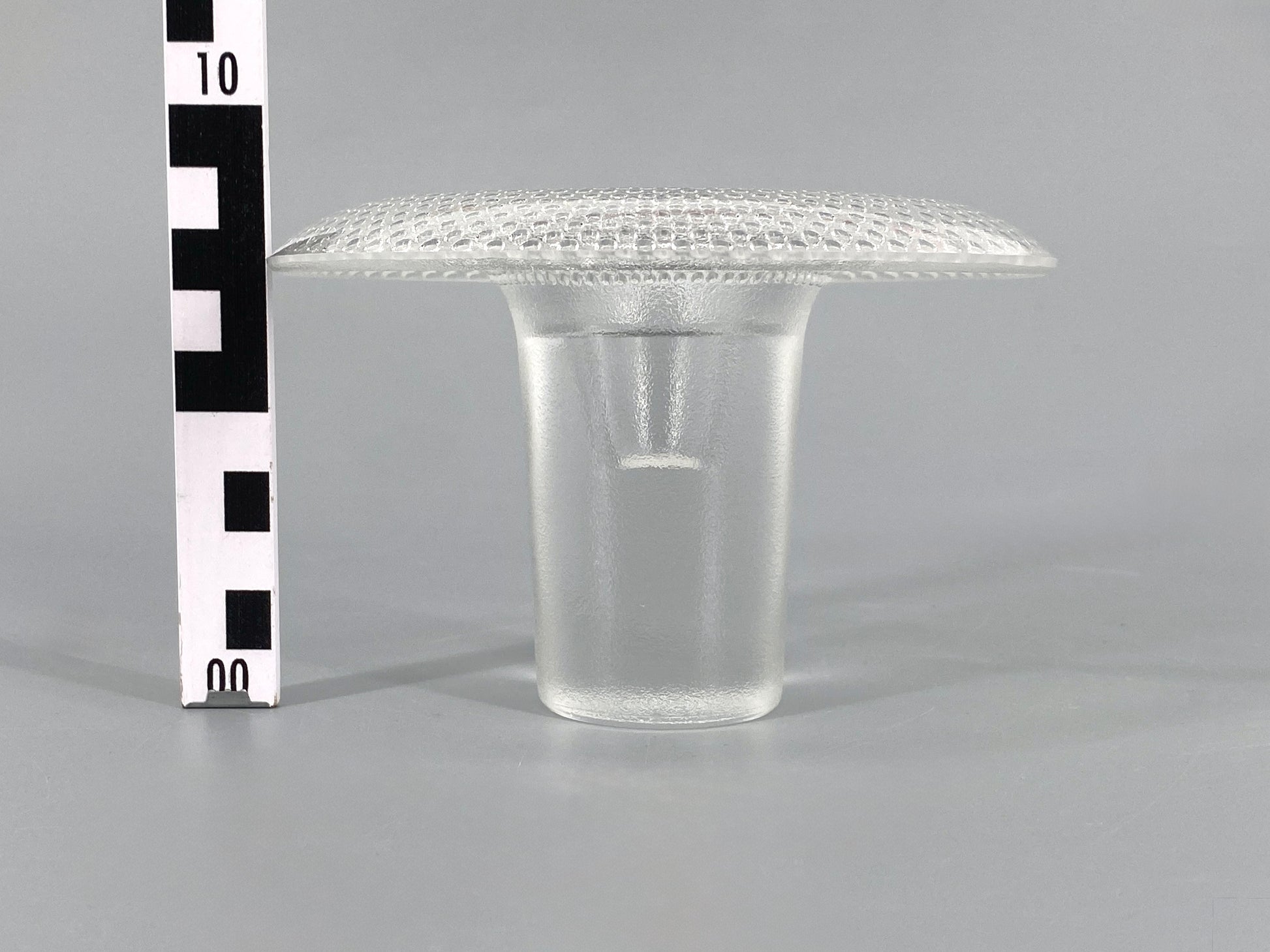 * blumenförmiger Kerzenhalter aus transparentem Glas, oben durch Glaspunkte strukturiert