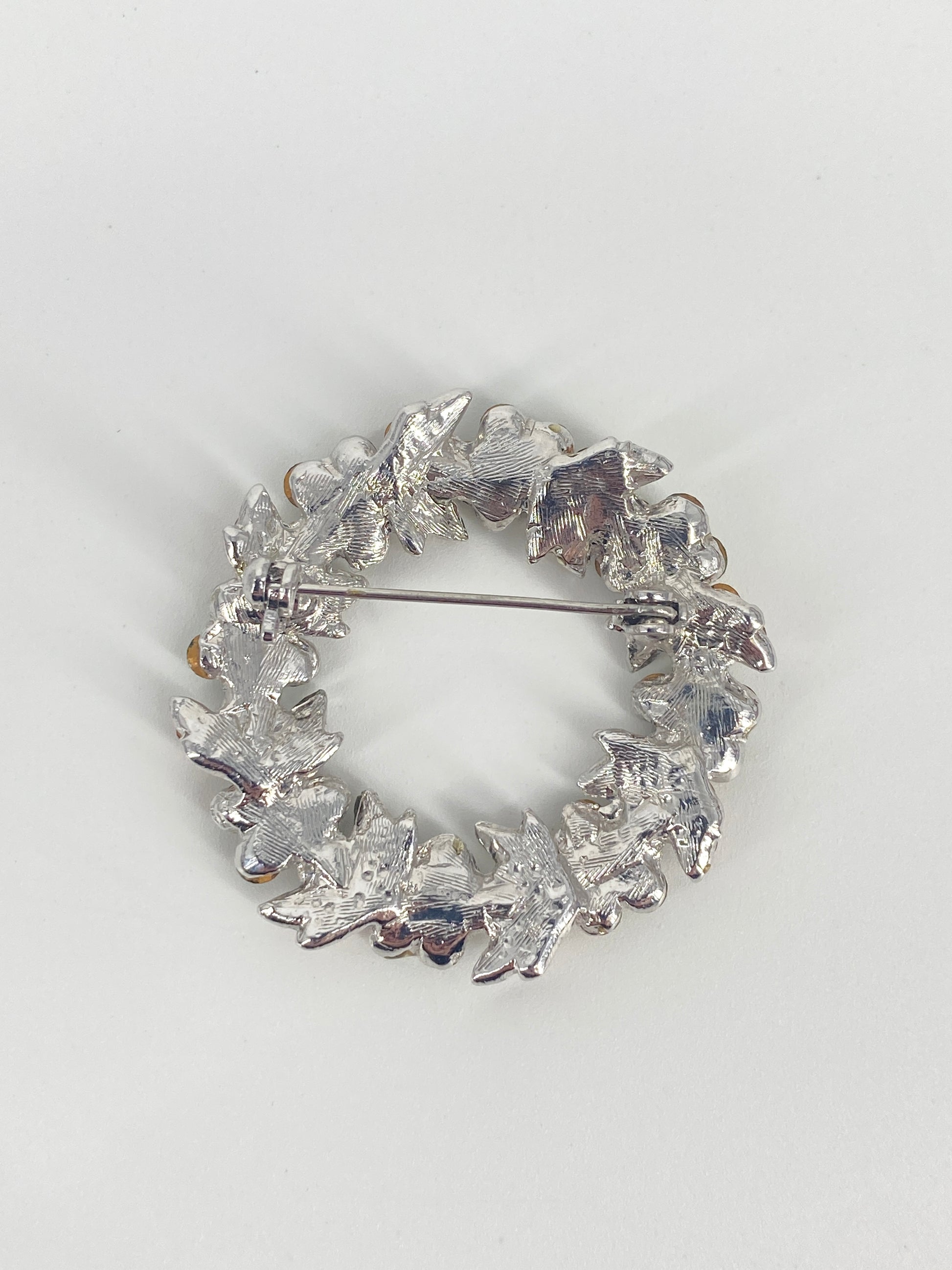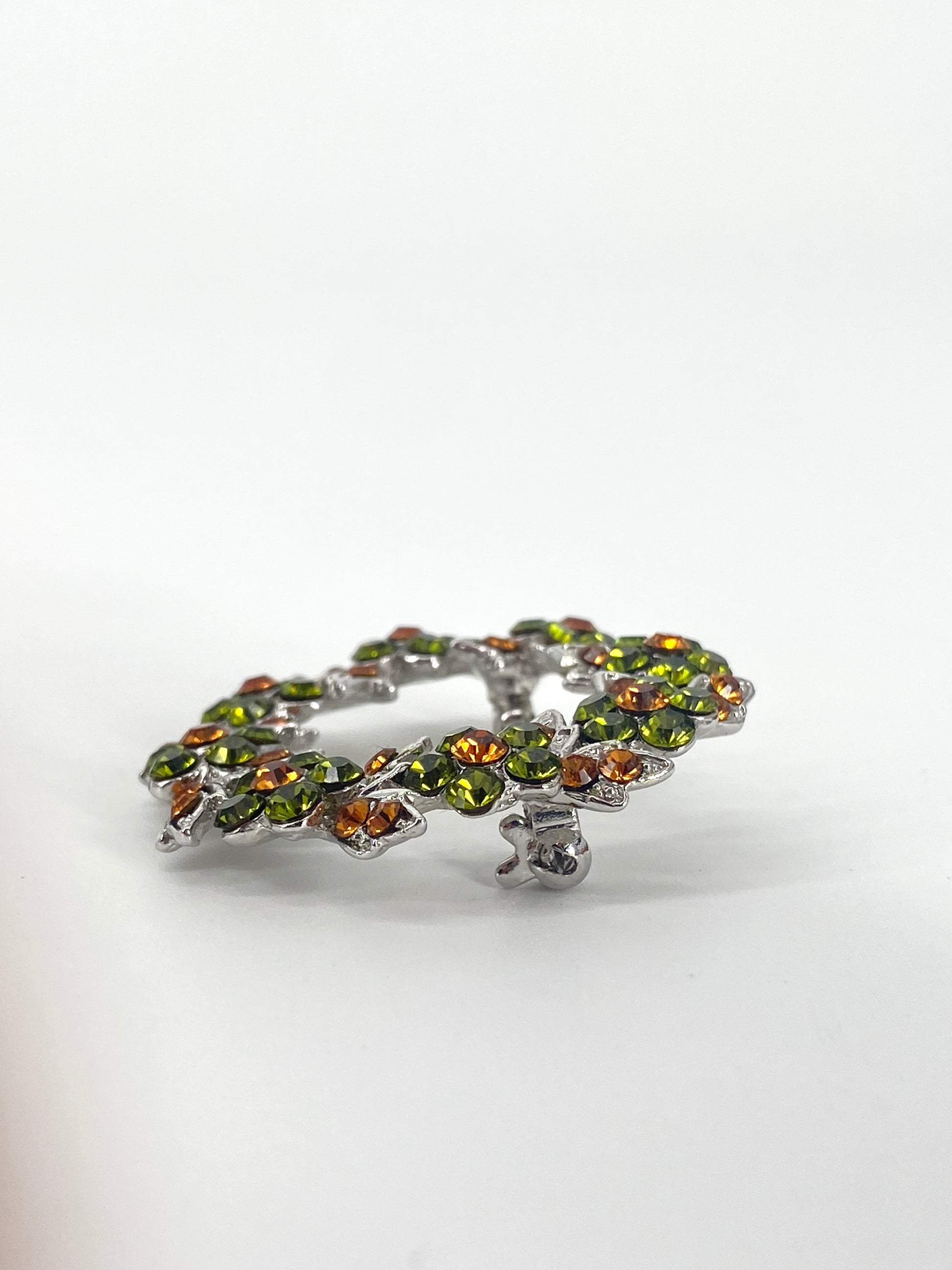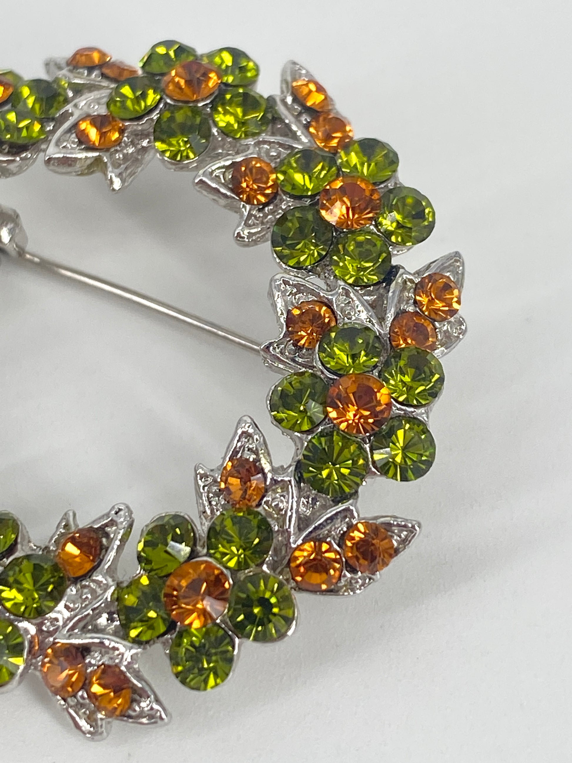 * BLUMENKRANZ BROSCHE METALL SILBER STEINE BESETZT GRÜN ORANGE