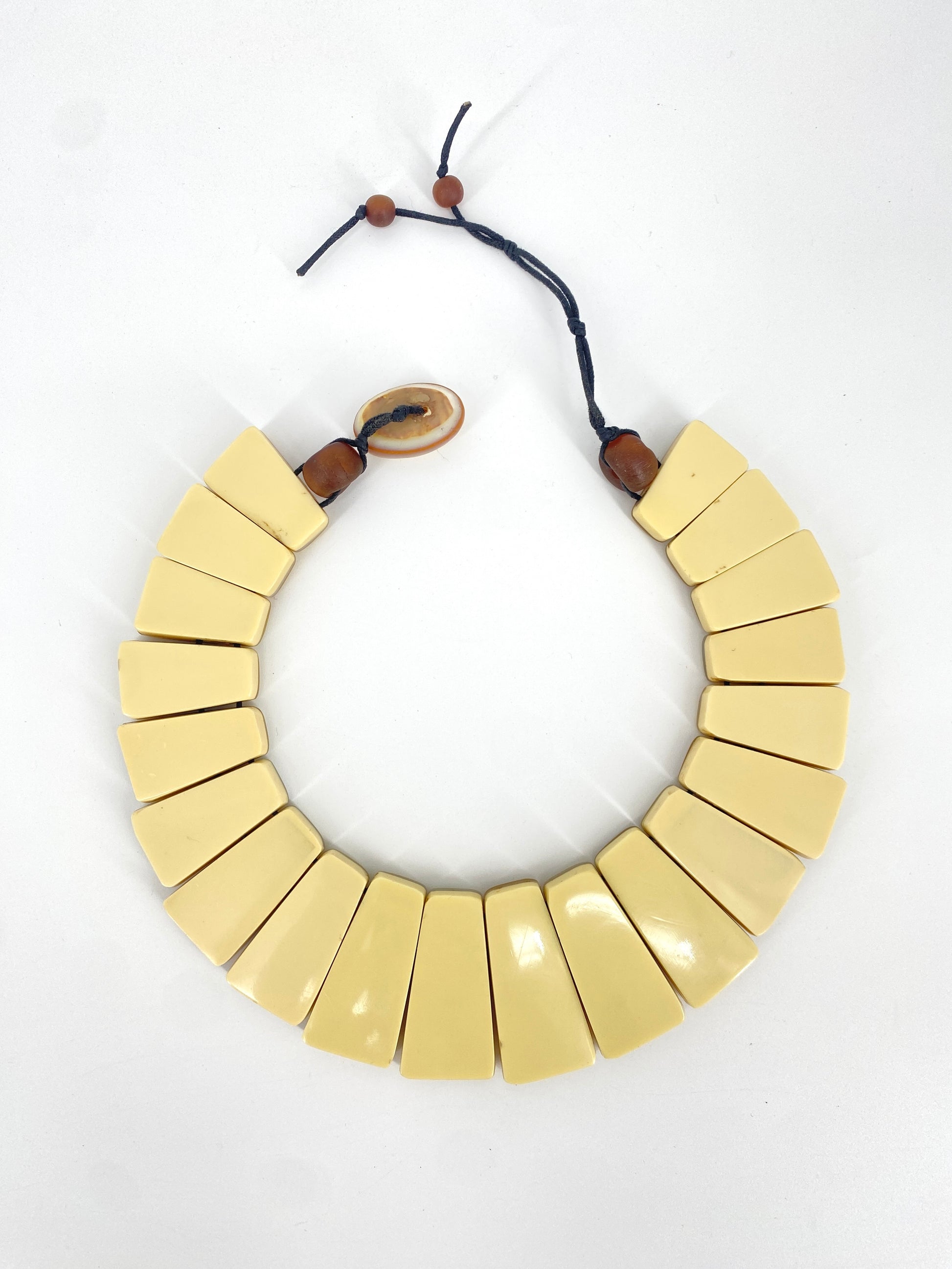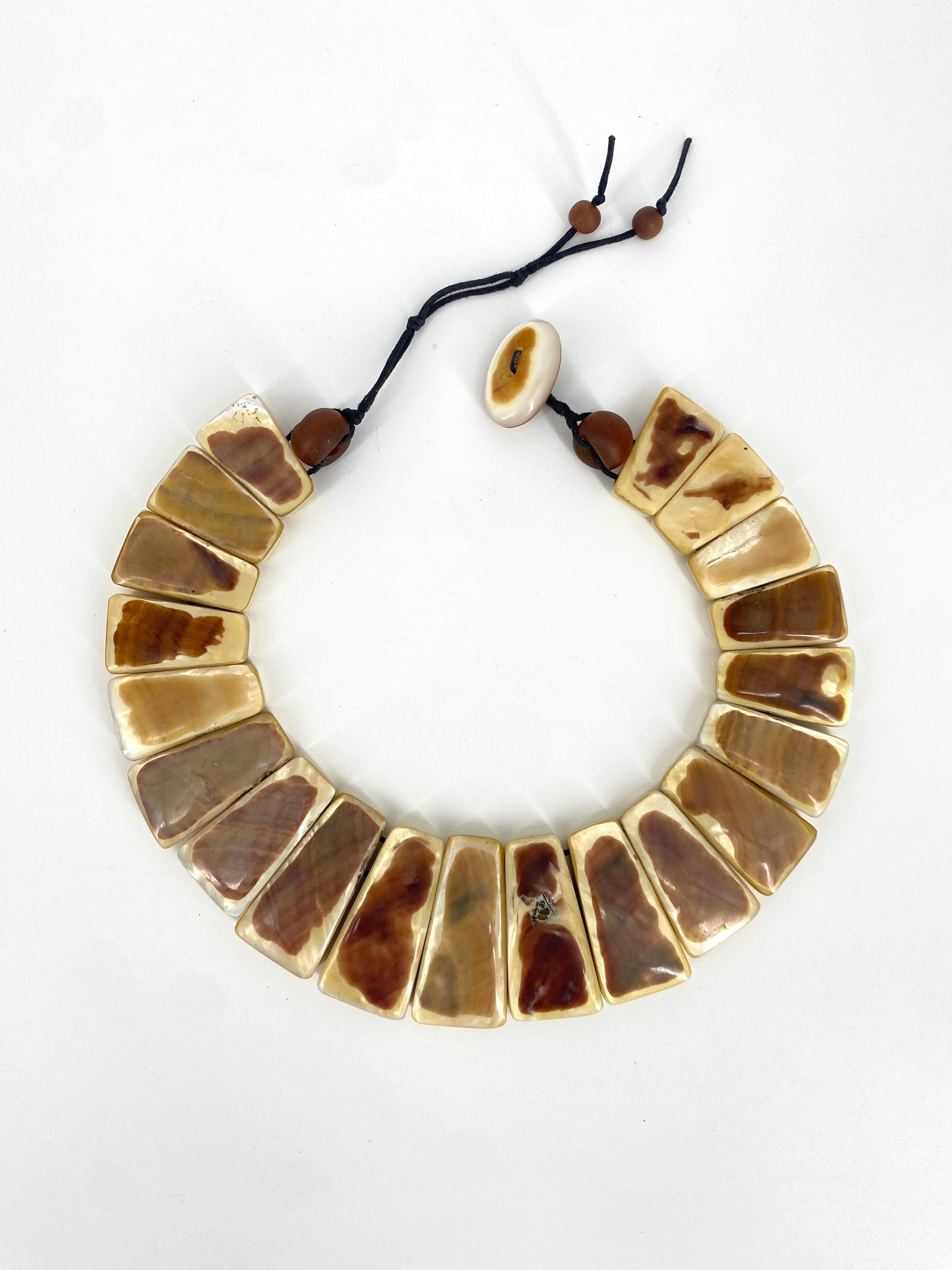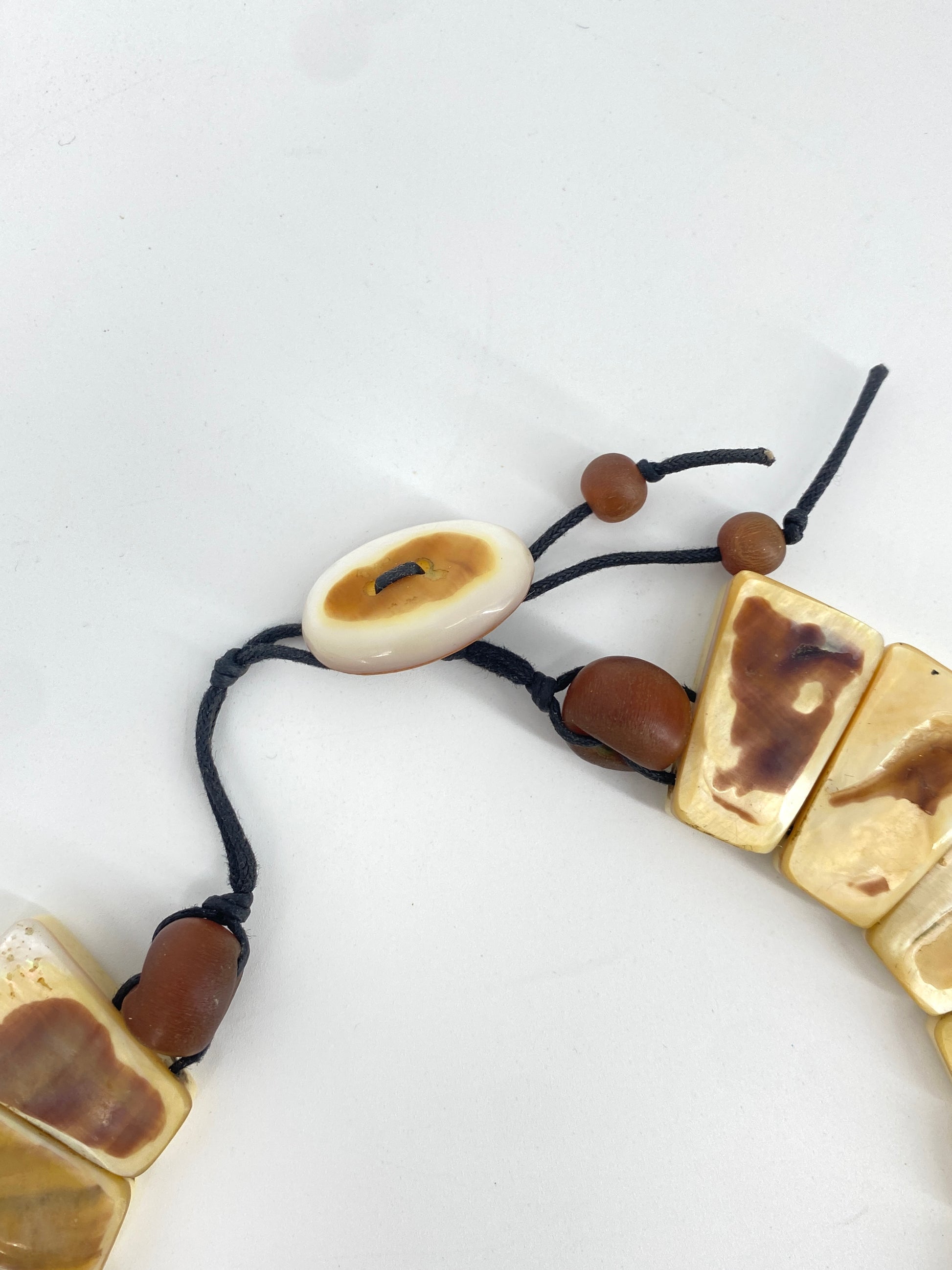 * bei der Kette sind die Steine auf ein schwarzes Band aufgezogen und  mit kleineren, runde, braunen Perlen und einem Verschluss aus einem Perlmuttknopf abgeschlossen