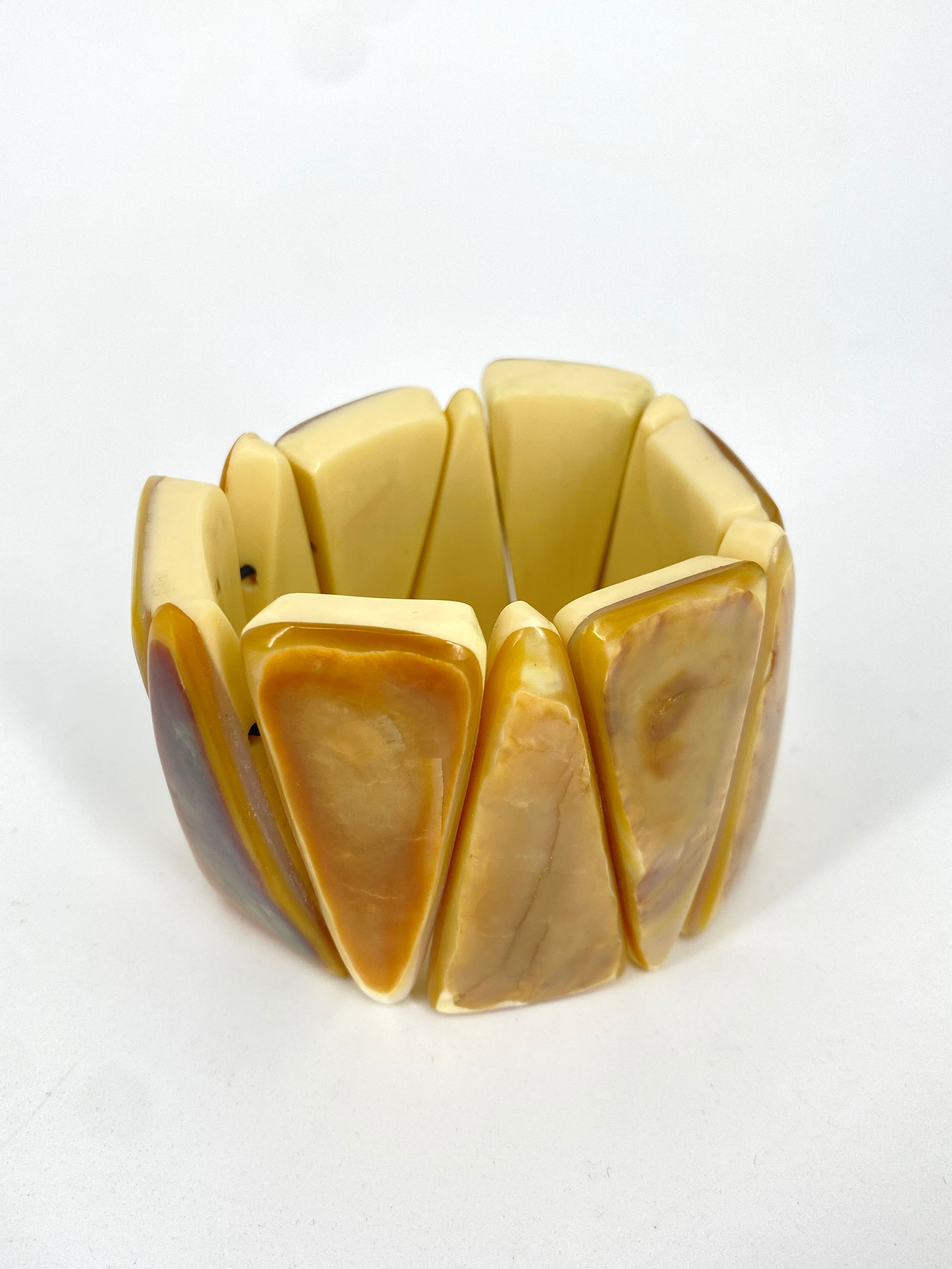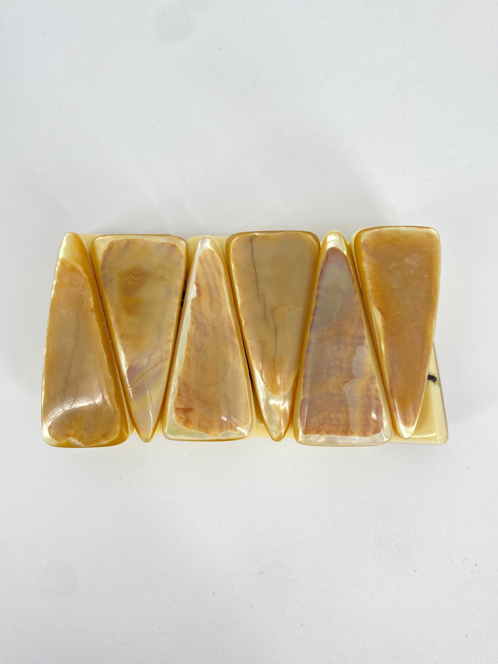 * relativ große und dicke, keilförmige Stücke aus einem harten, cremefarbenen Material mit marmorierter Muschel/Perlmutt-Auflage
