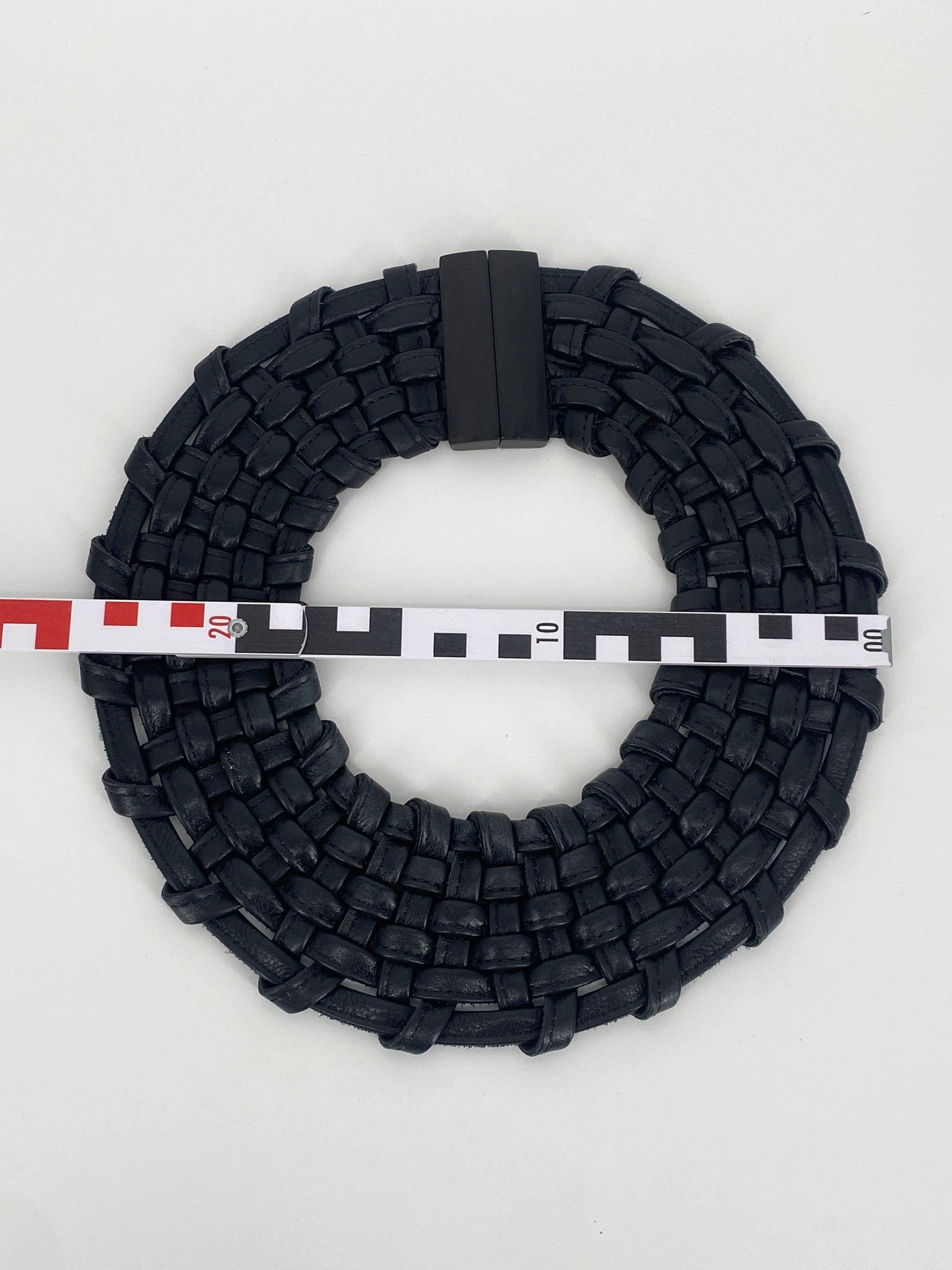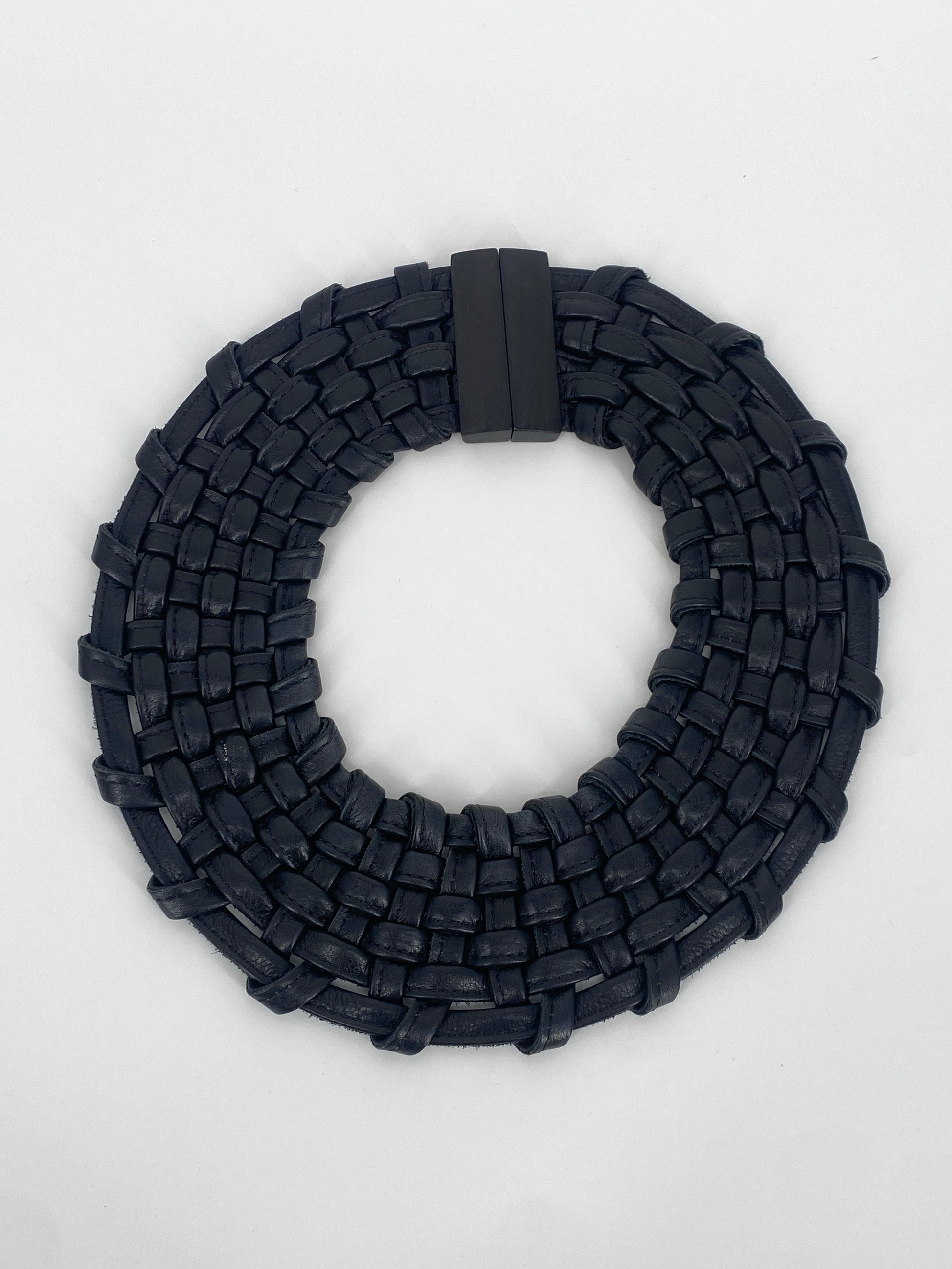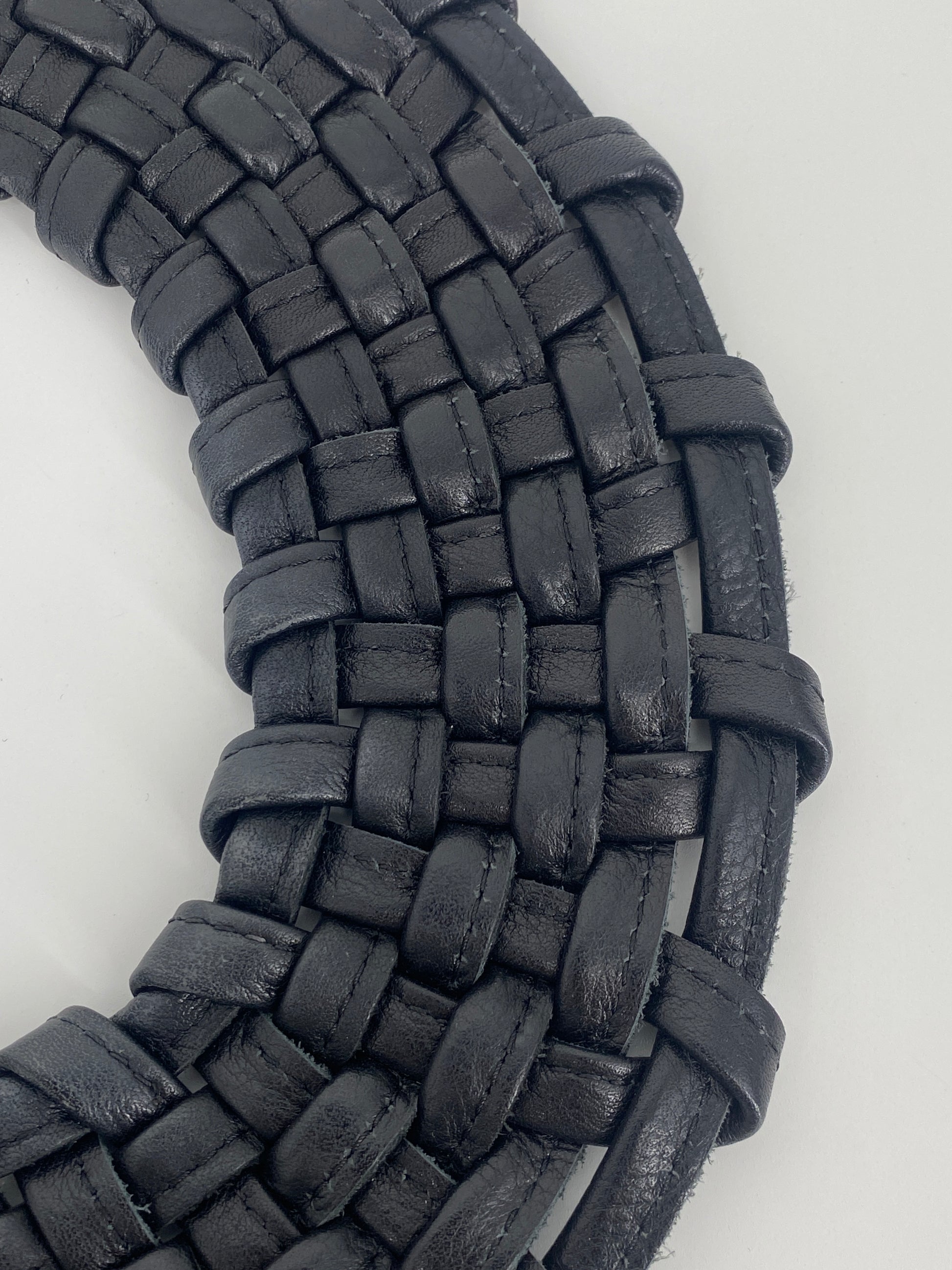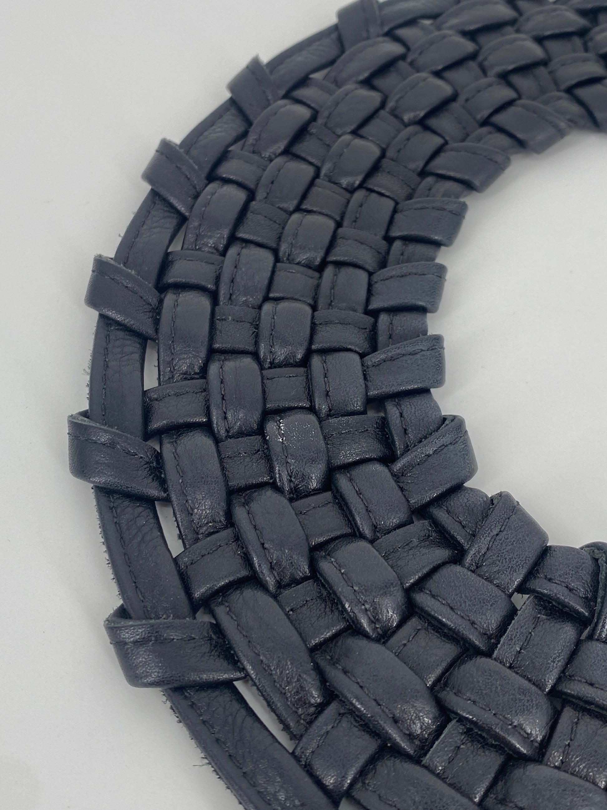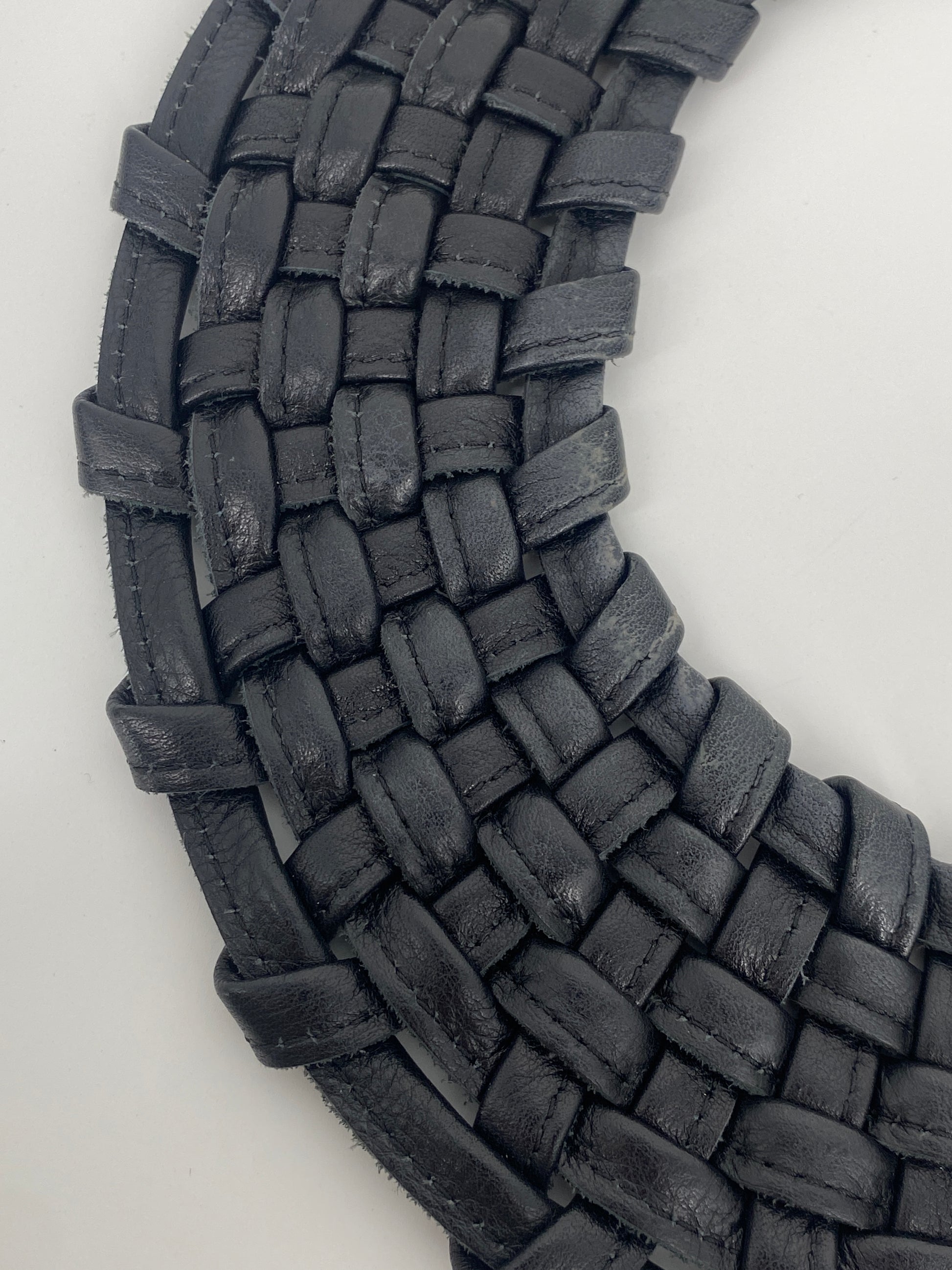 * Collier aus doppelt gelegten, vernähten Lederbändern die zu einem Korbgeflecht ineinander gewobenen sind