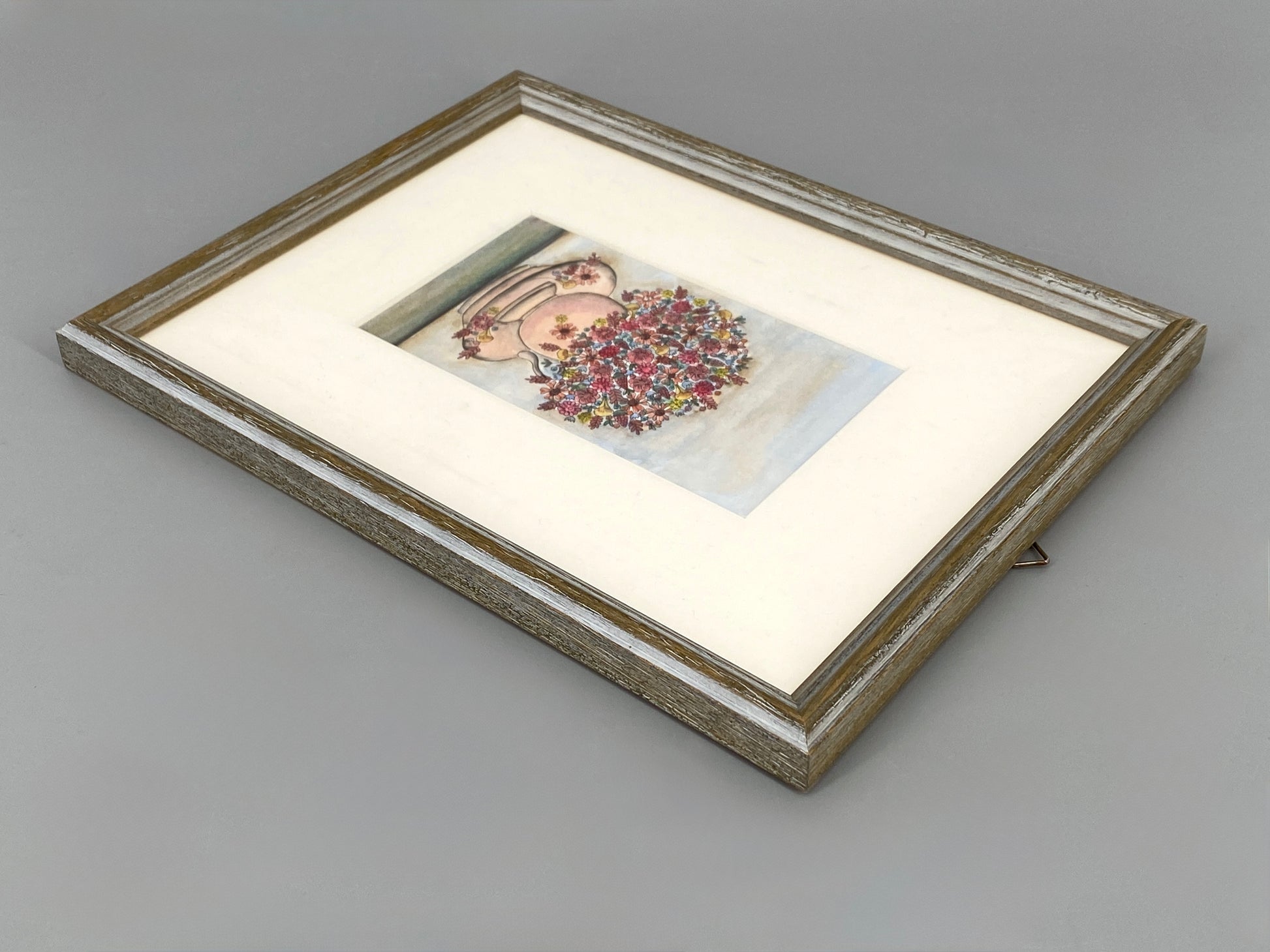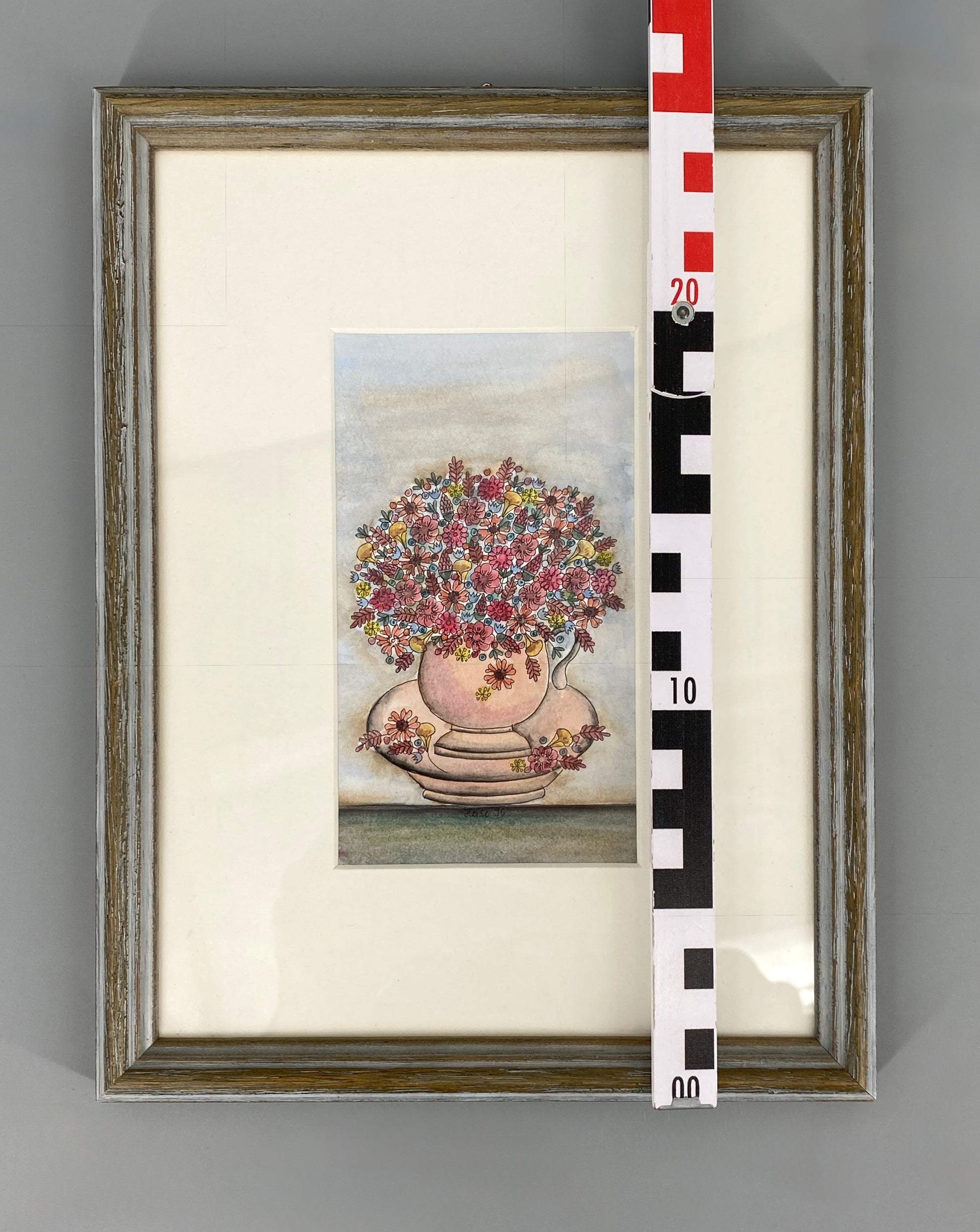 Gerahmtes Aquarellgemälde mit Tuschekonturen "Blumentässchen" von Hannelore Heise, 1996