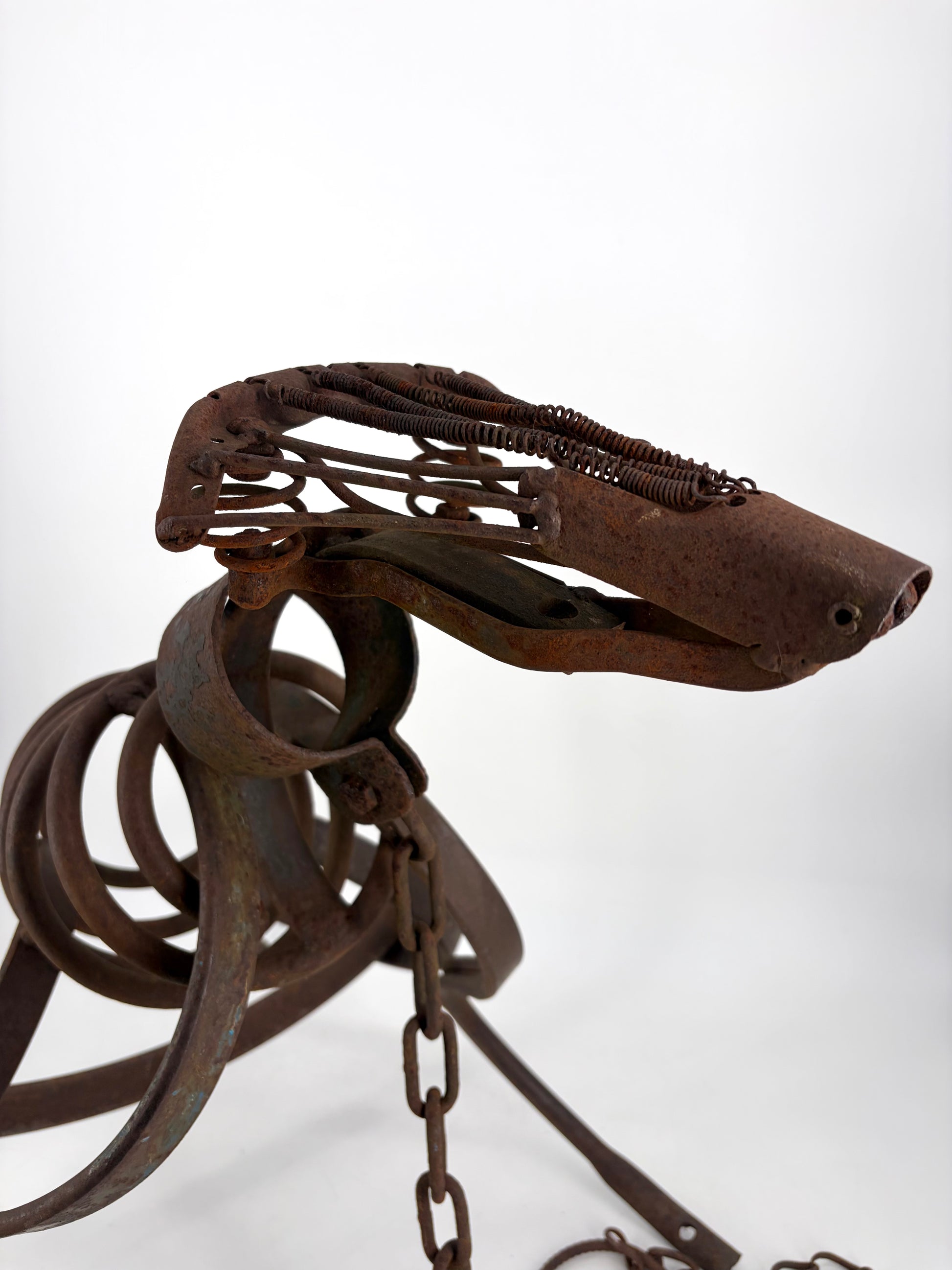 * die Rippen bestehen aus einer alten Sprungfeder eines PKWs, der Kopf aus einem altem Fahrradsattel.