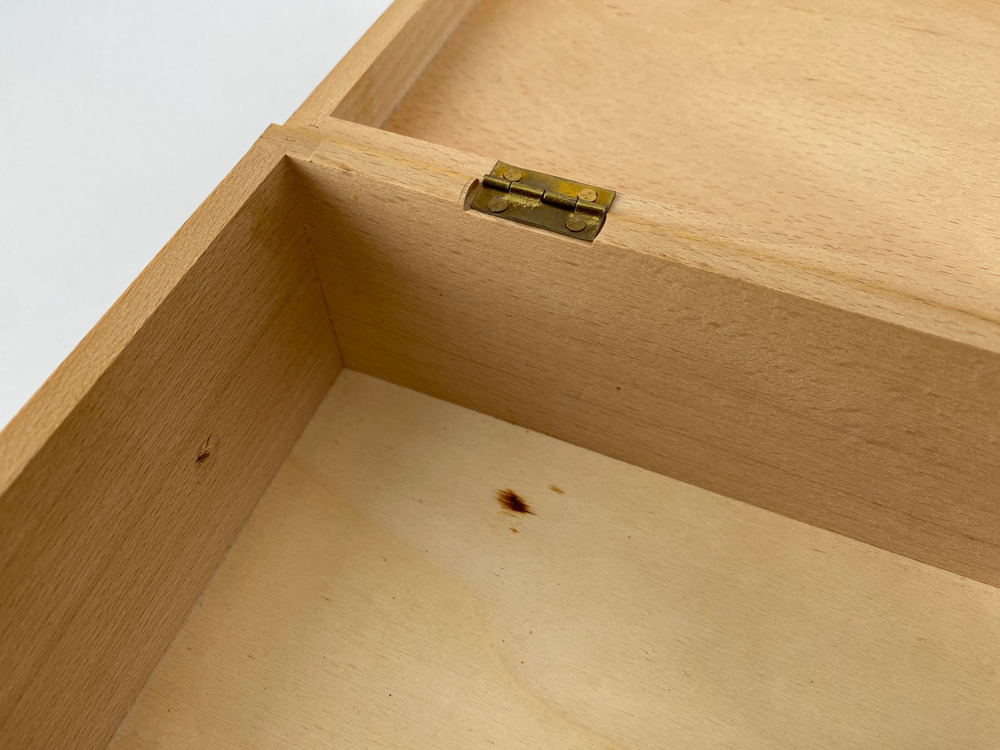 * Deckel zum aufklappen mit kleinem Holzgriff und angewinkelten Kanten