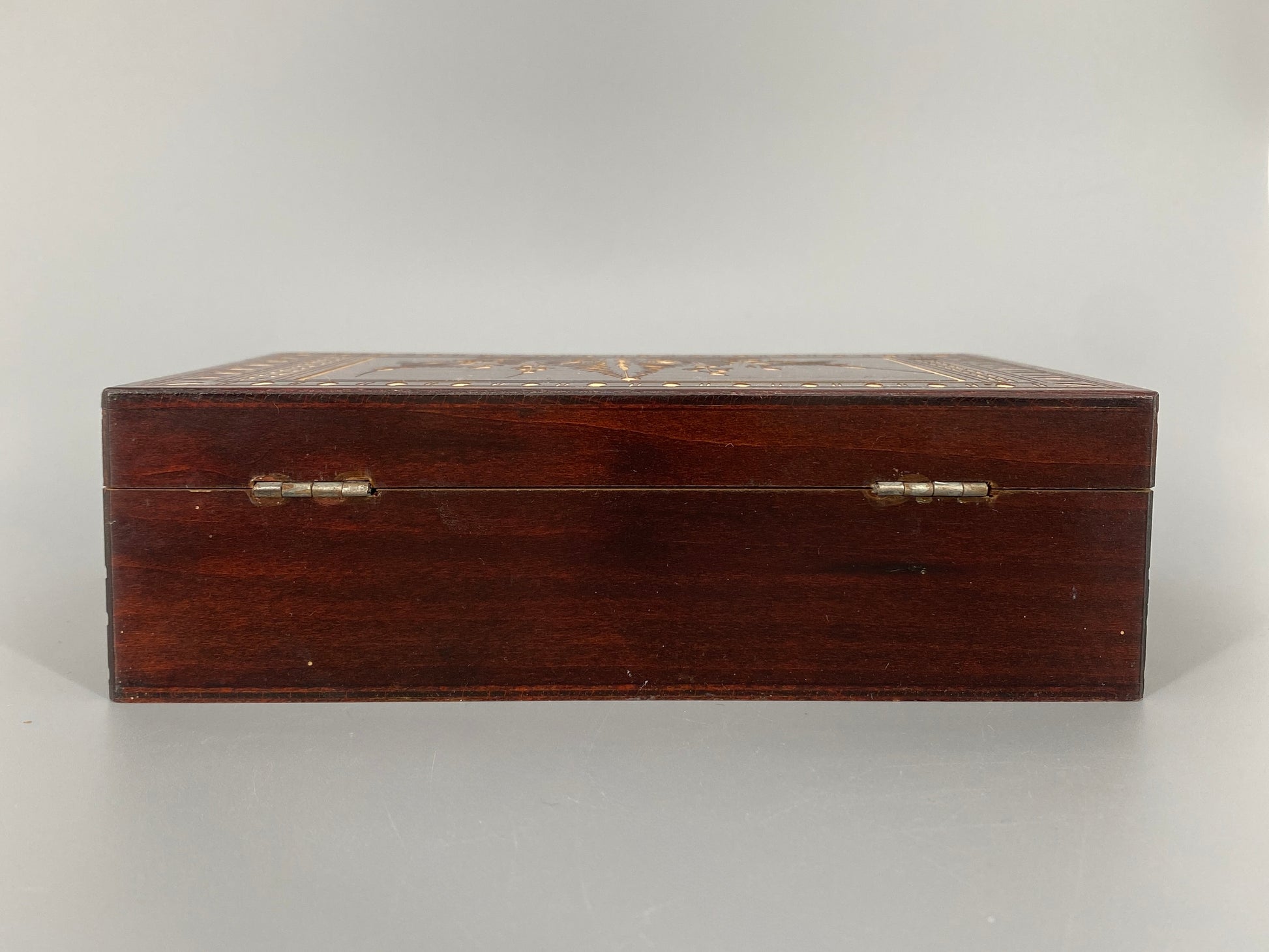 * dunkelbraun lackierte Holzschatulle mit Schnitzarbeiten in Form floraler Ornamente
