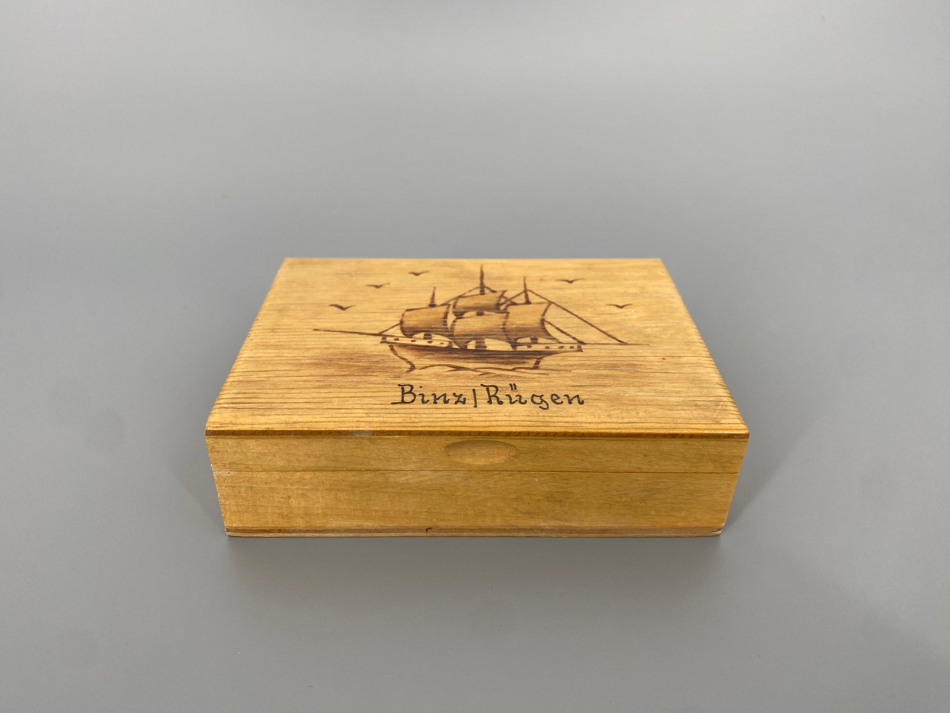 * kleine Holzschatulle mit Segelbootmotiv und Aufschrift „Binz | Rügen“
