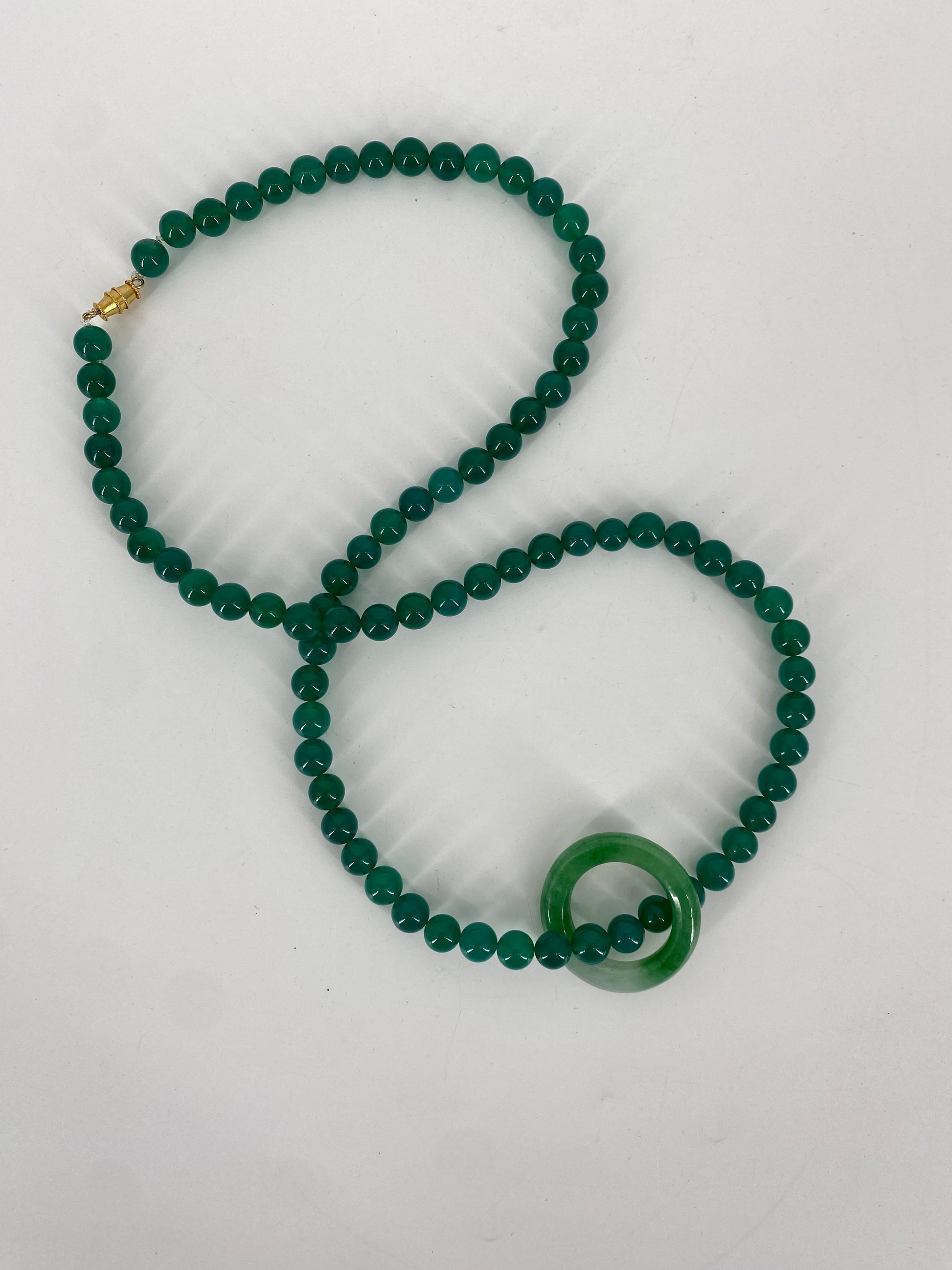 * eine dunkelgrüne Edelsteinkette mit ringförmigem Anhänger und goldenem Drehverschluss