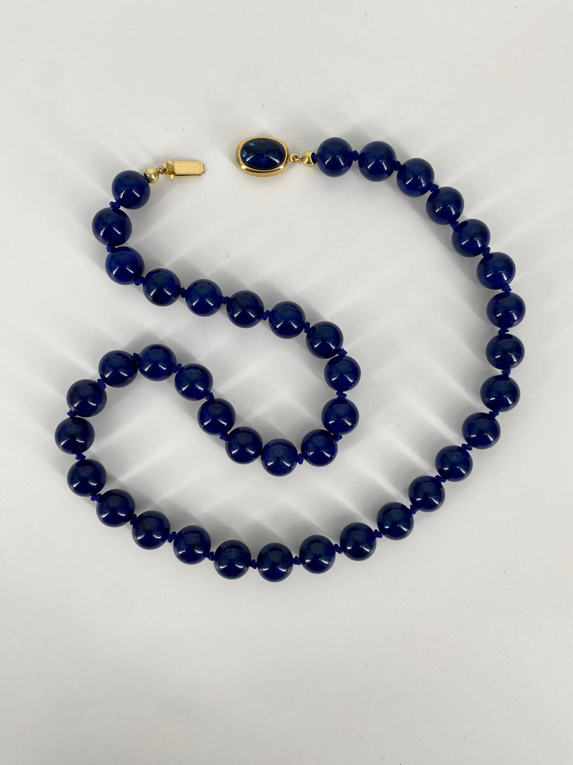 * eine aus dicken dunkelblauen Edelsteinperlen mit goldenem Verschluss und handgefertigter Knotung aus dunkelblauem Faden zwischen den einzelnen Perlen