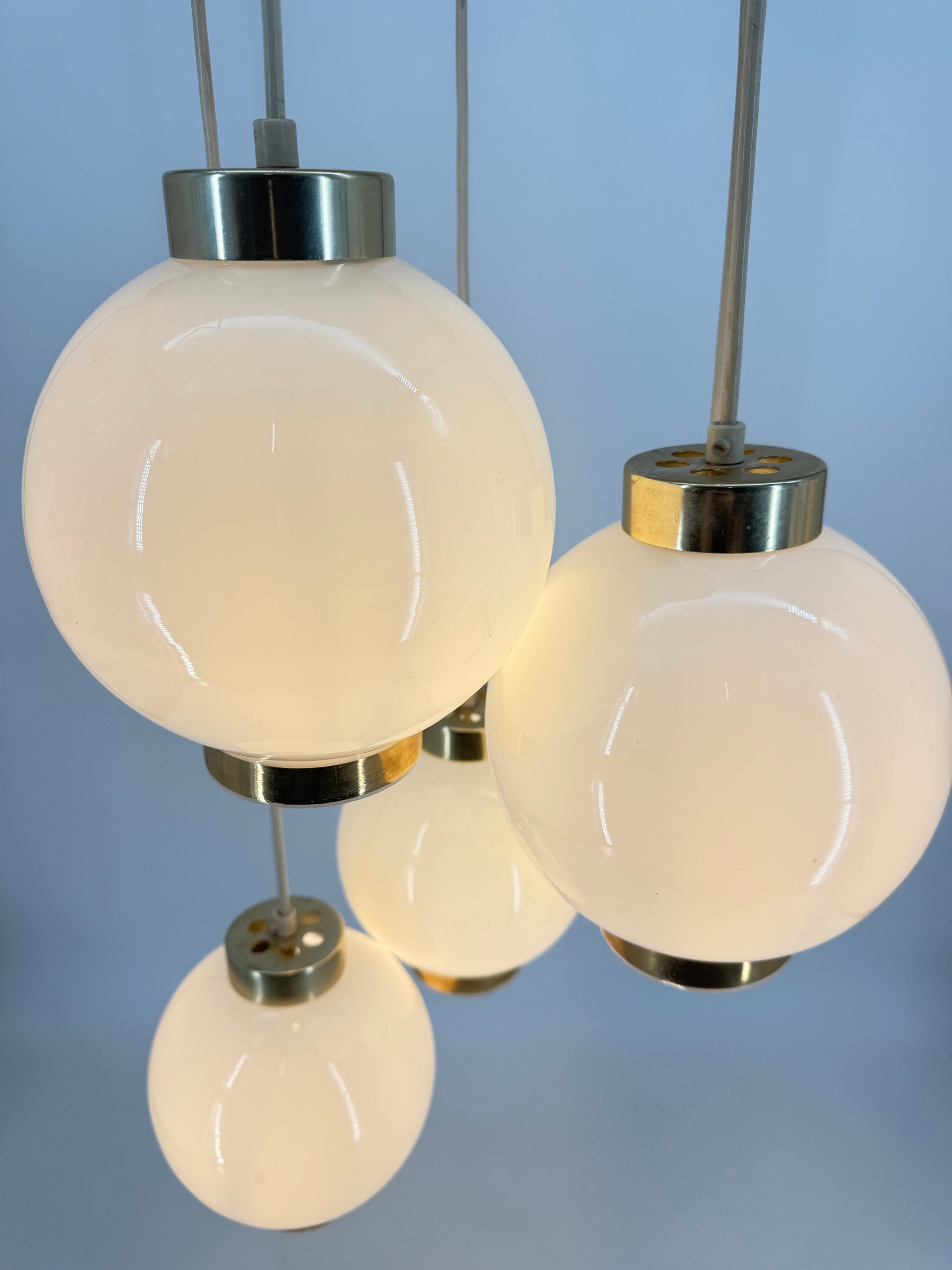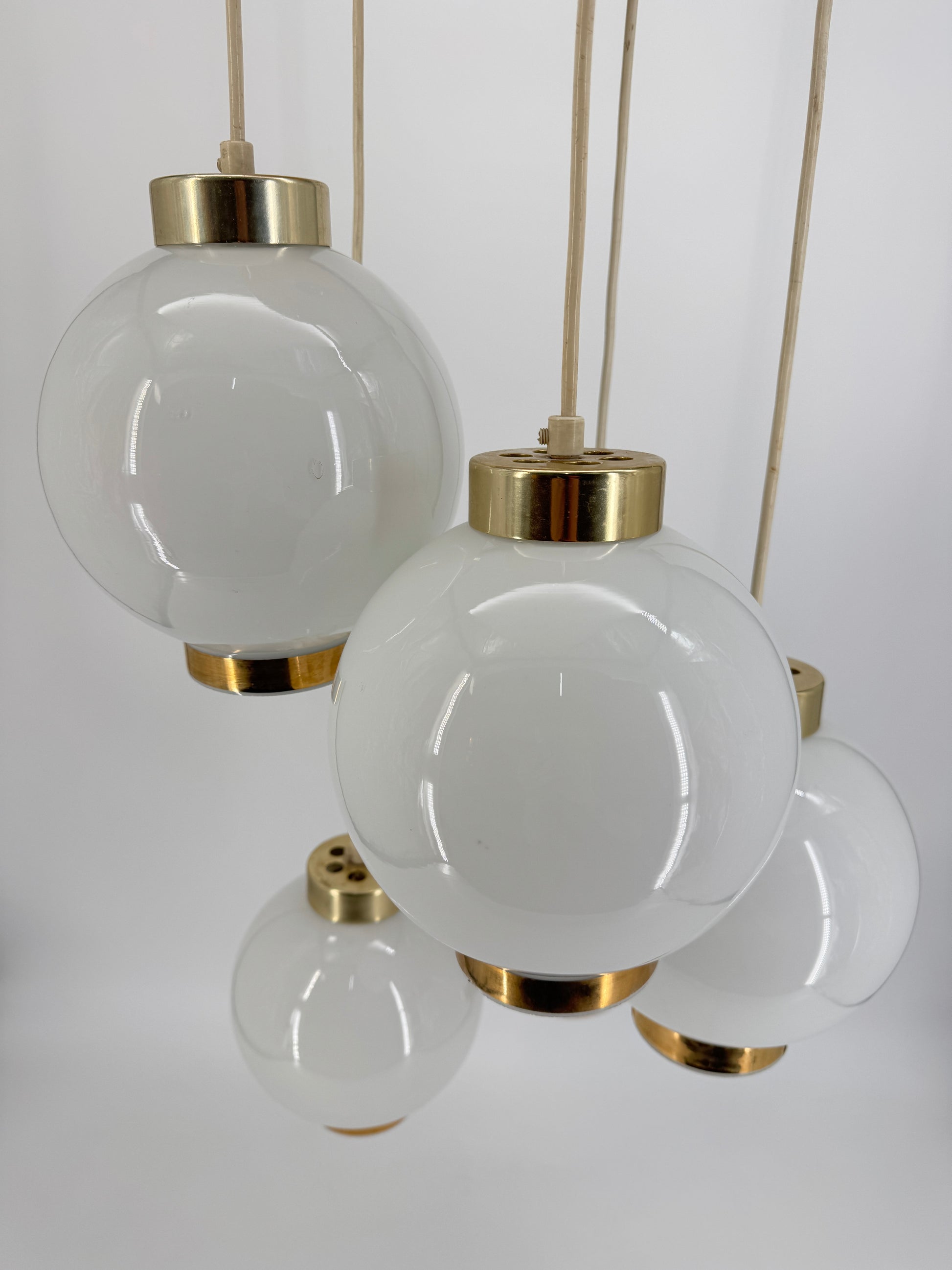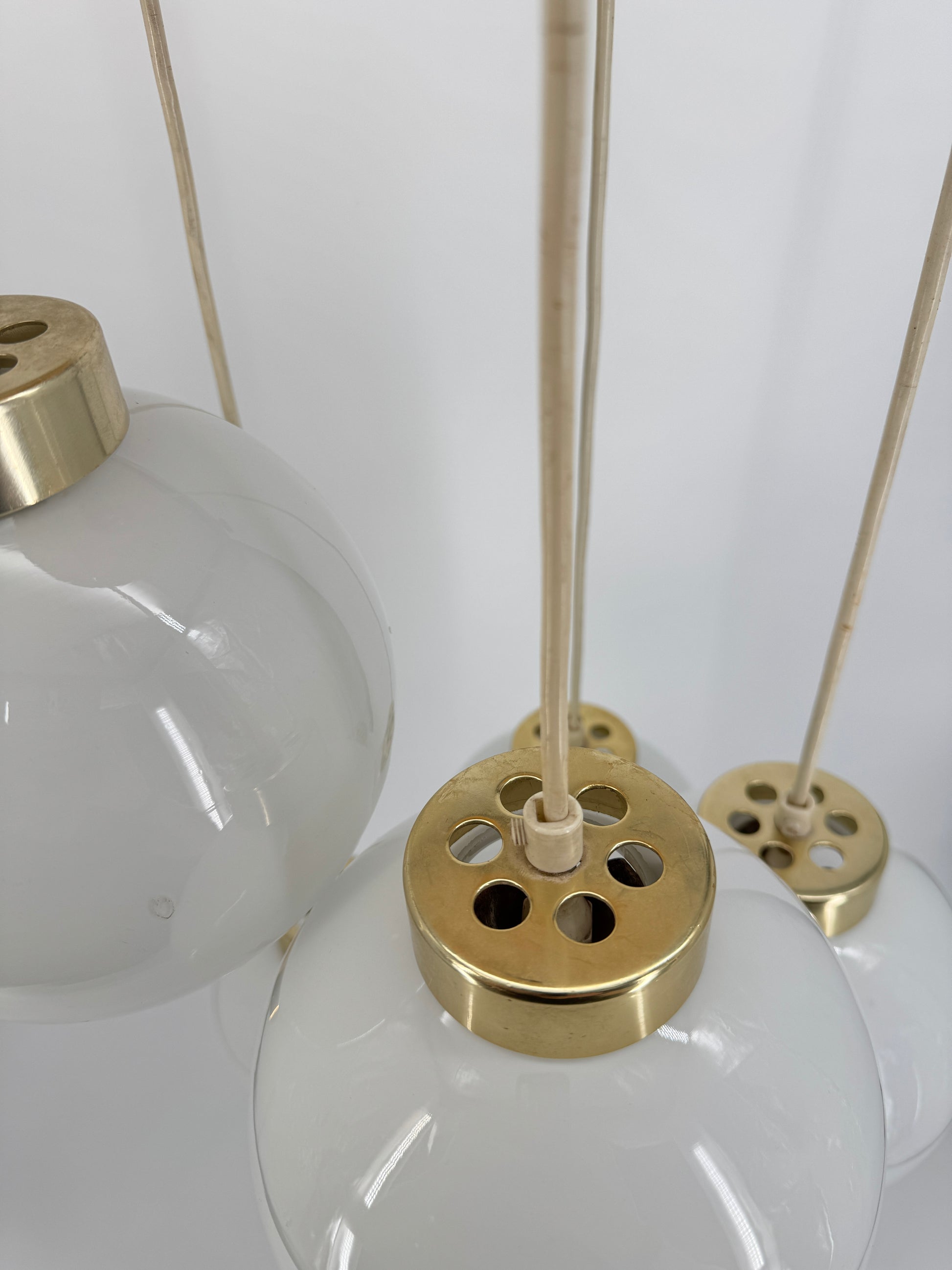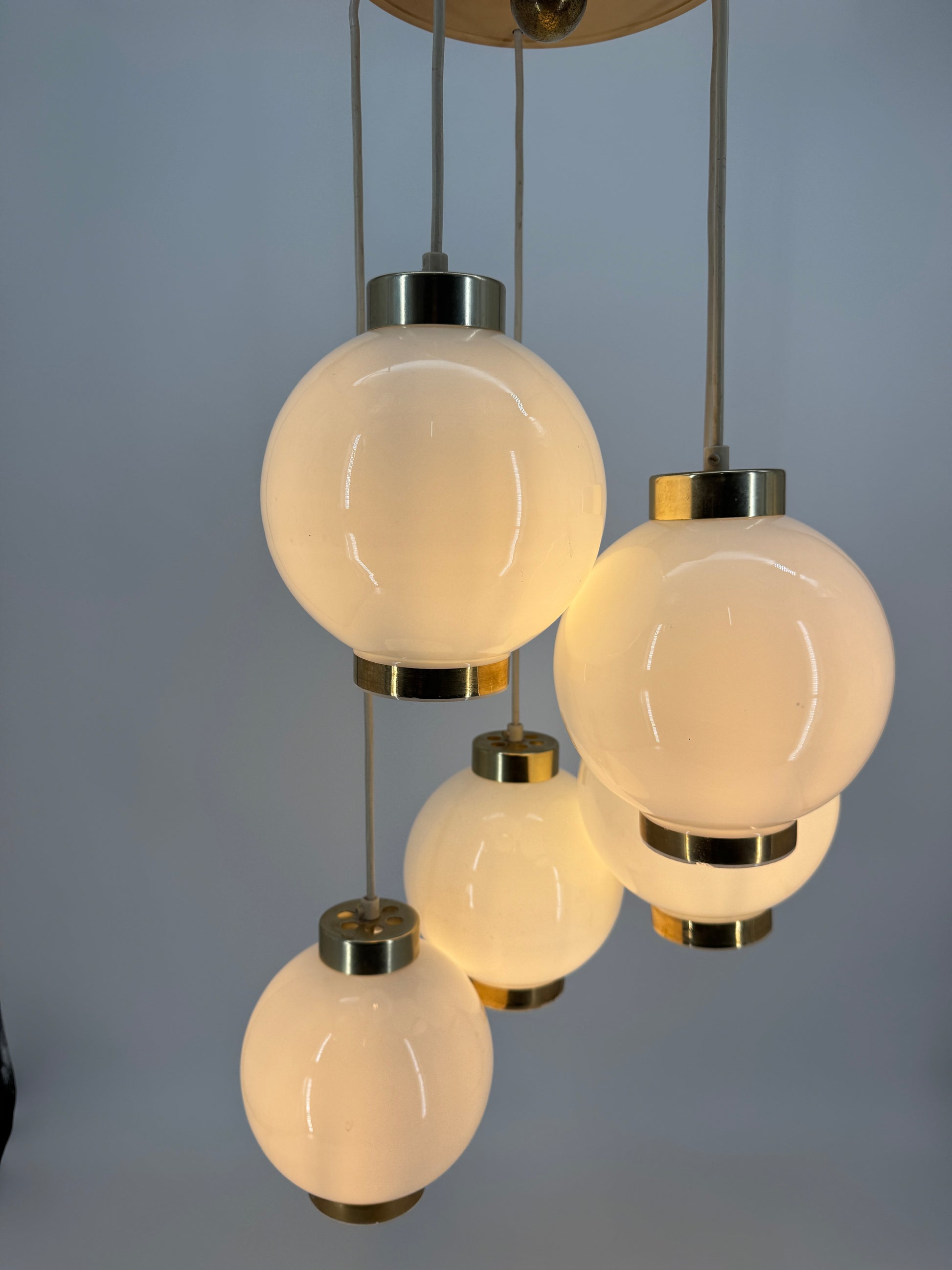 MID CENTURY PENDELLEUCHTE FÜNF WEIßE GLASKUGELN MESSING 60ER VINTAGE