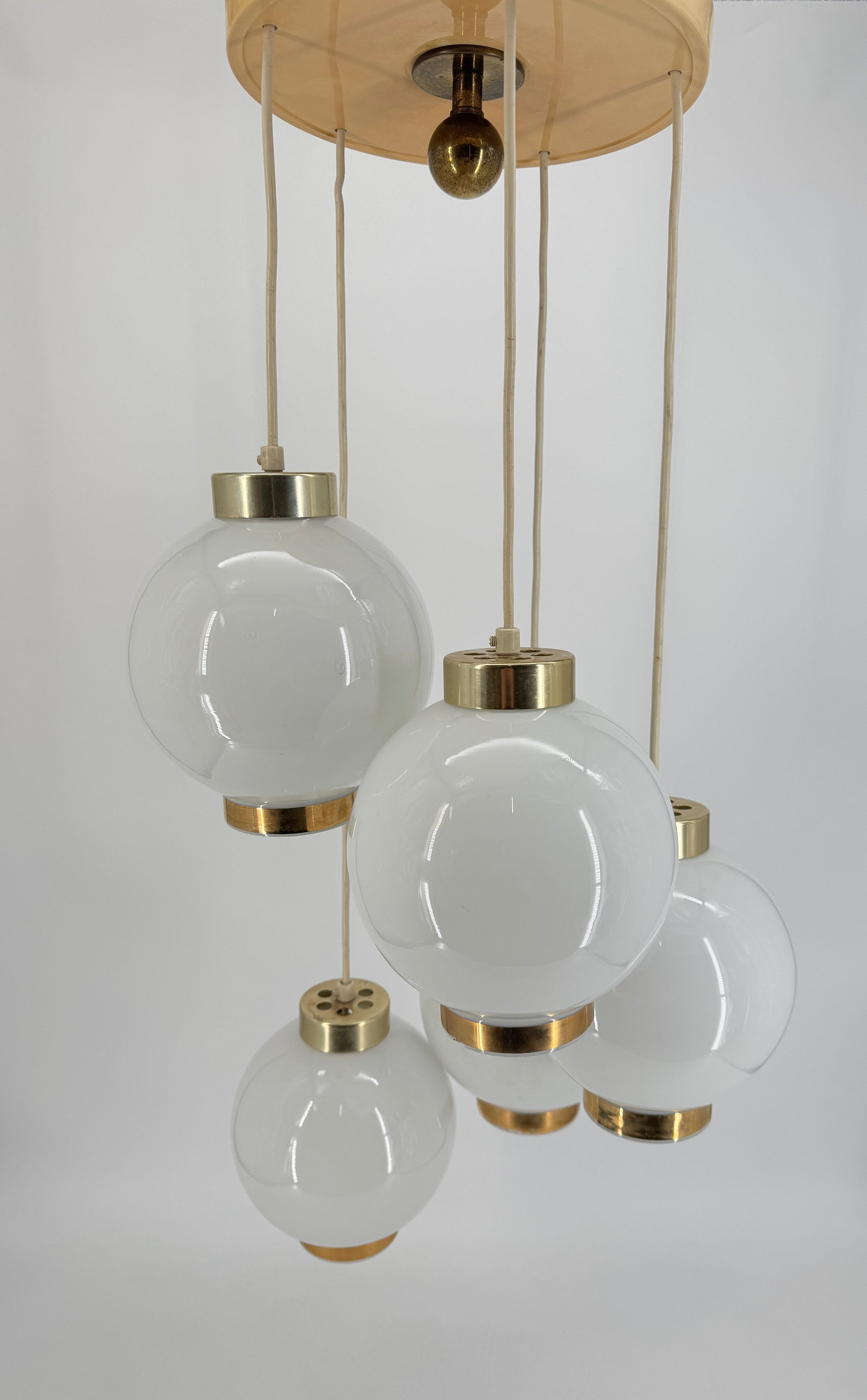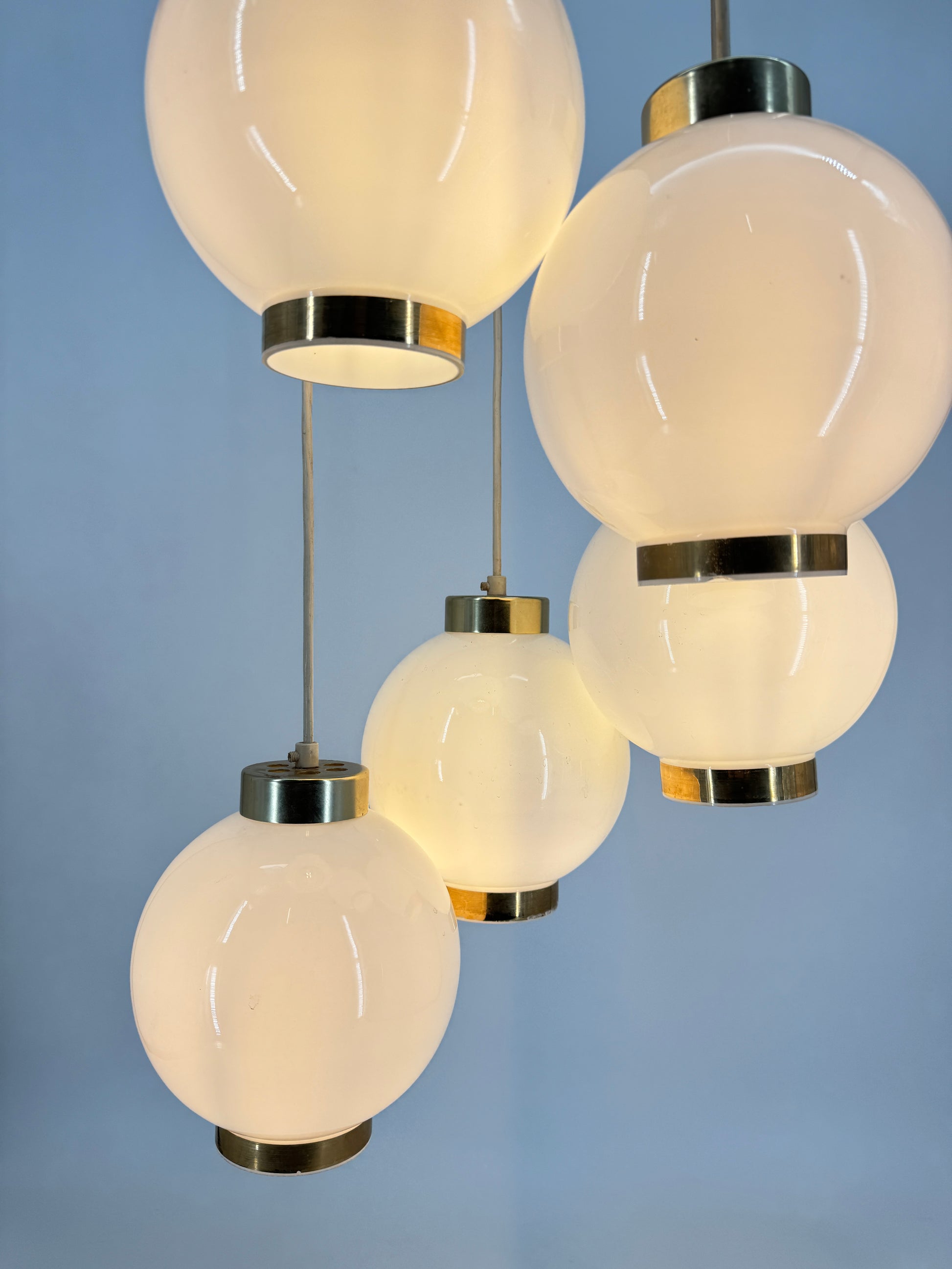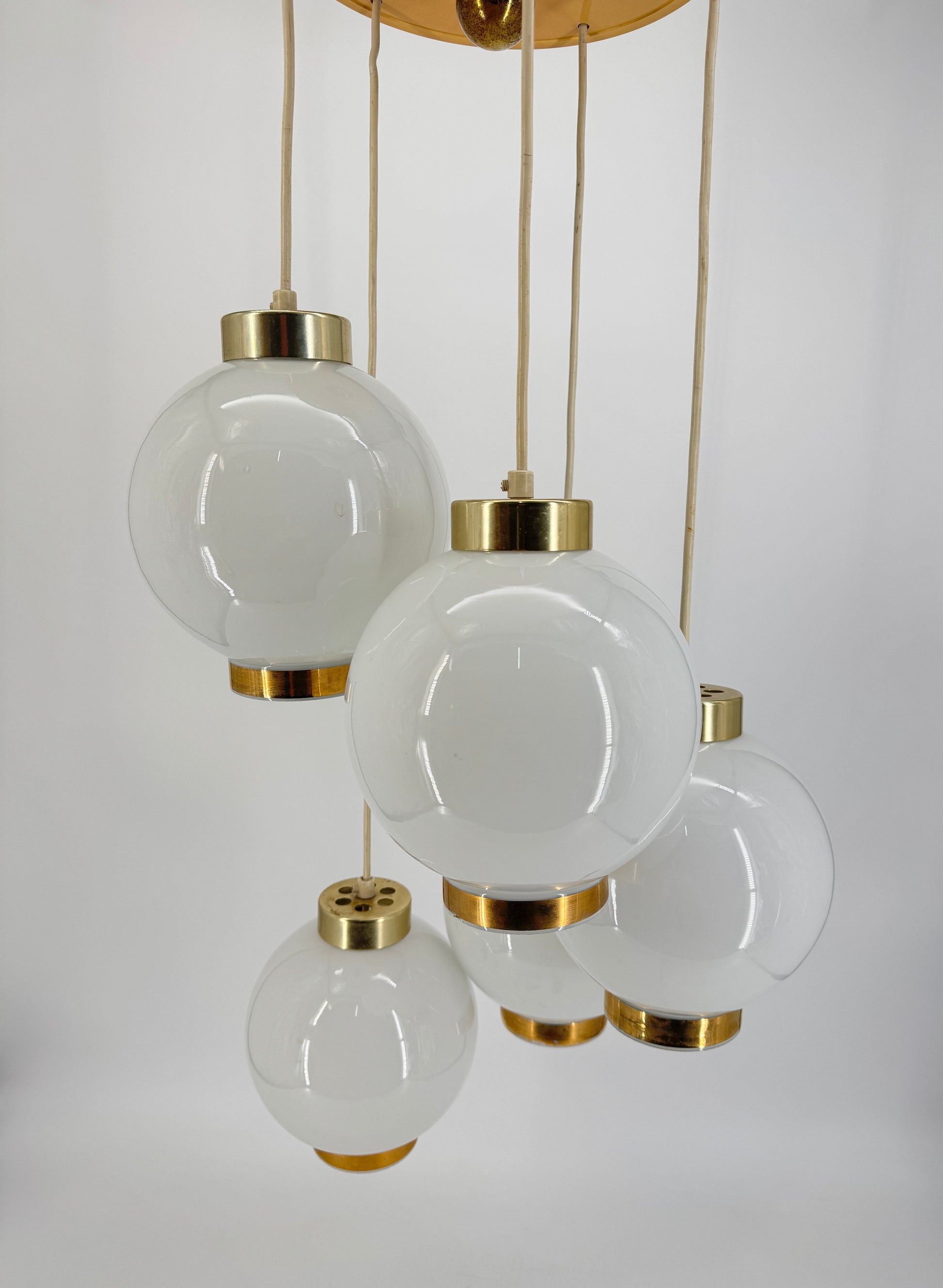 MID CENTURY PENDELLEUCHTE FÜNF WEIßE GLASKUGELN MESSING 60ER VINTAGE