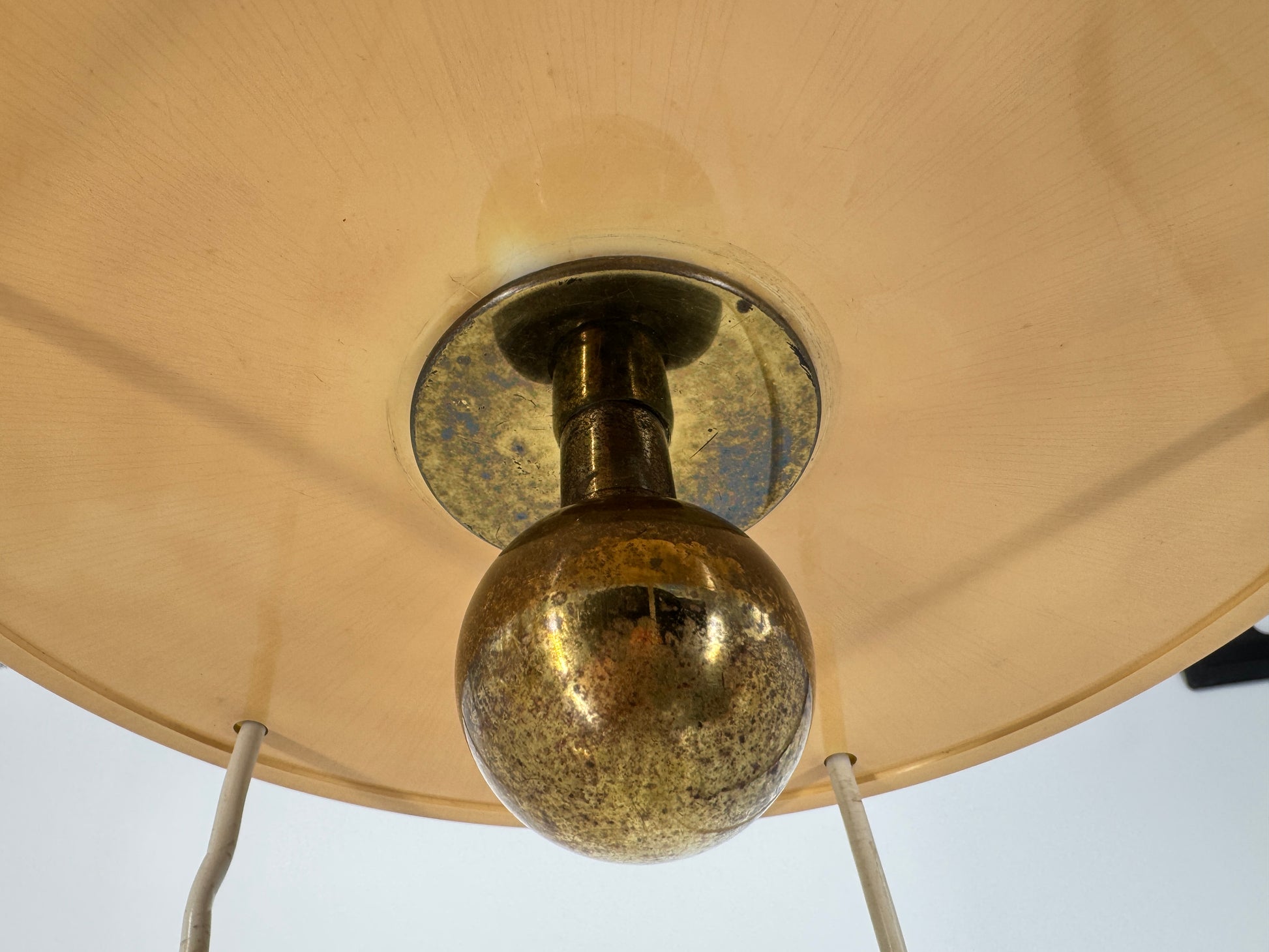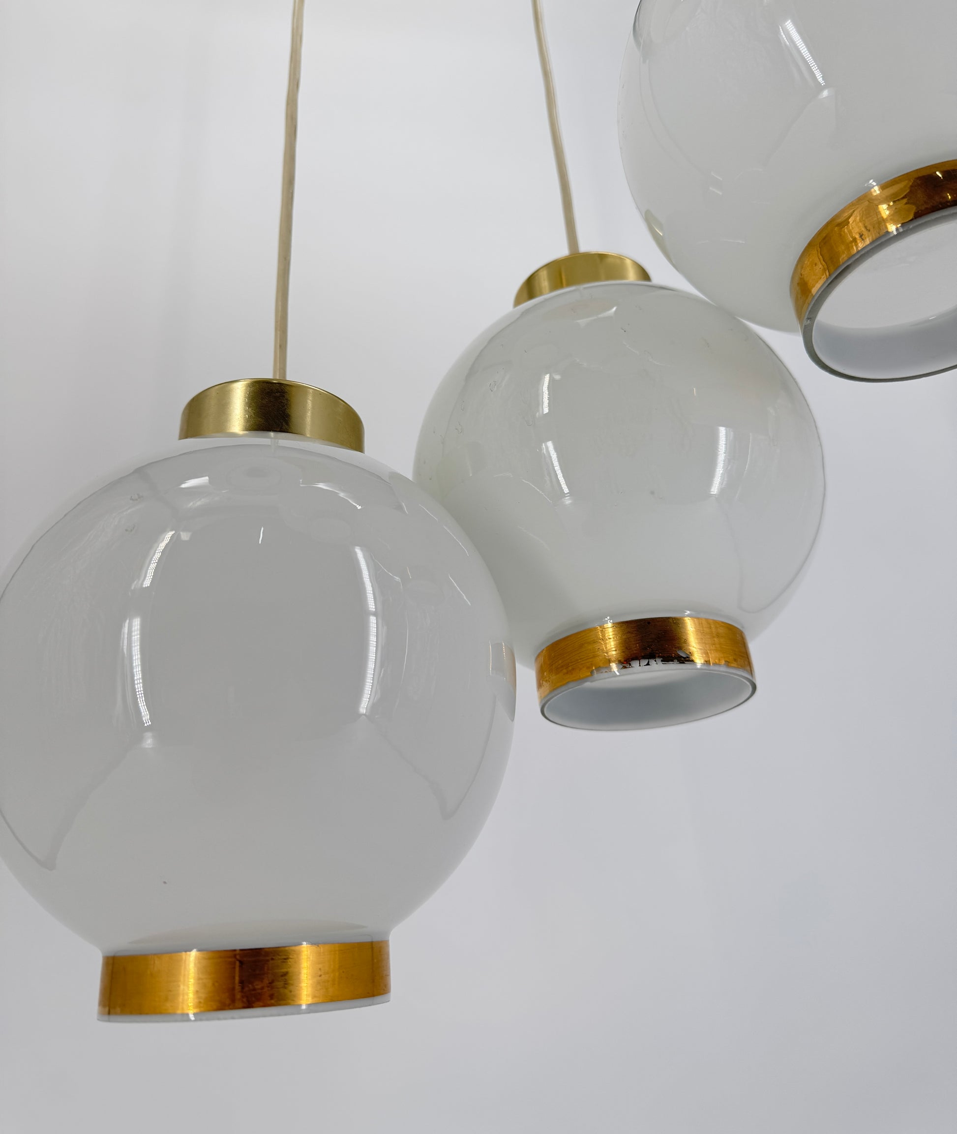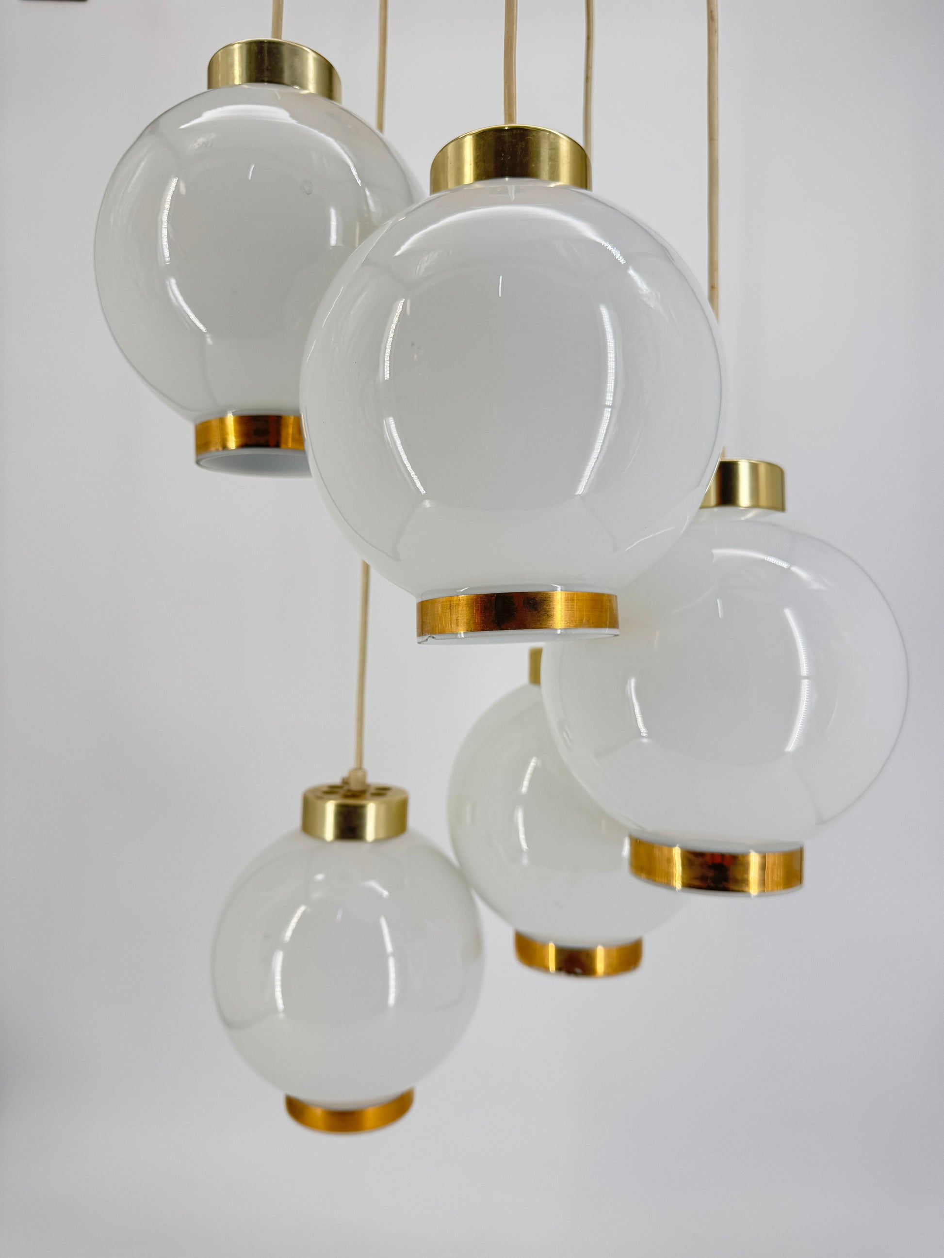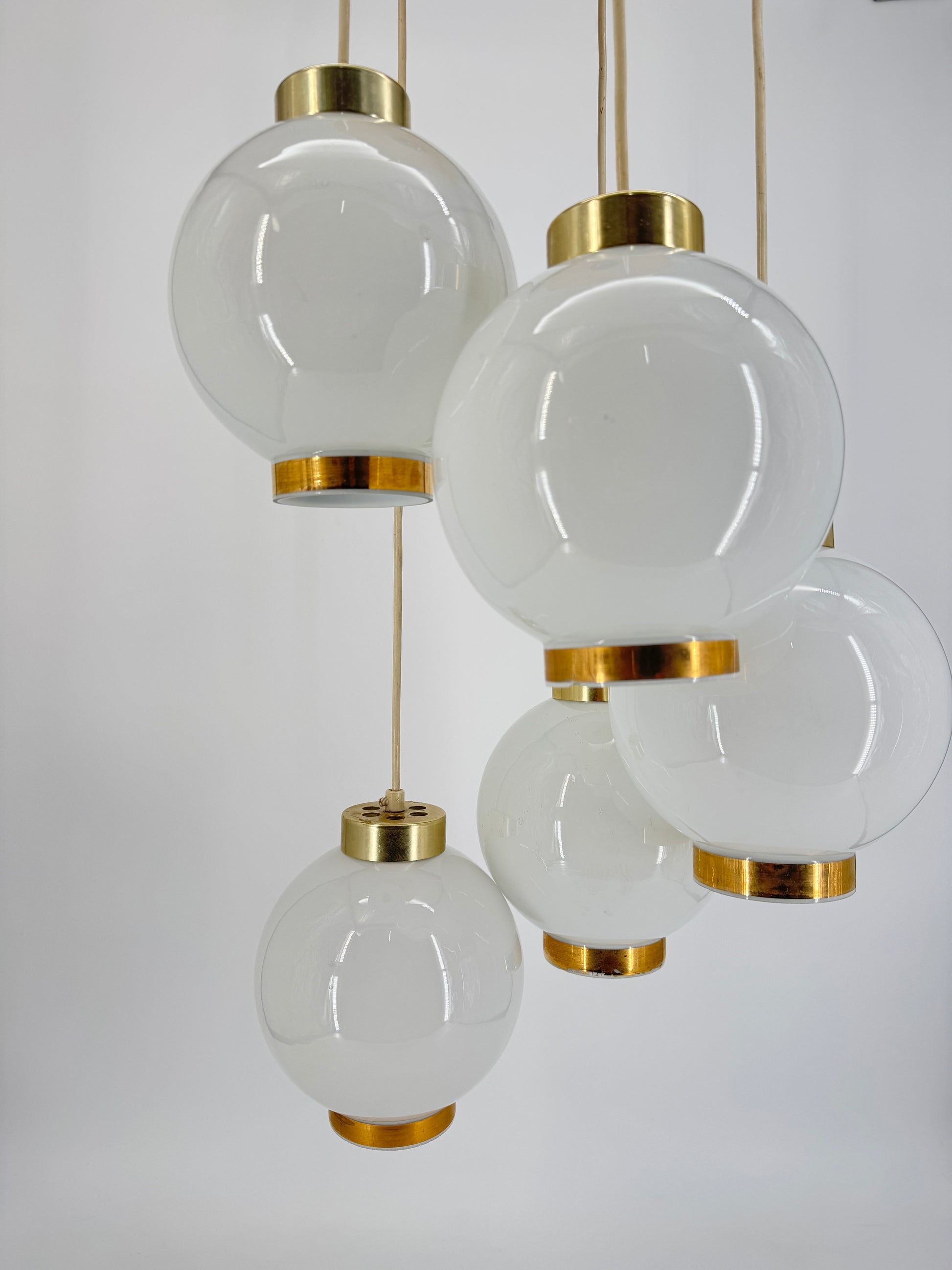 MID CENTURY PENDELLEUCHTE FÜNF WEIßE GLASKUGELN MESSING 60ER VINTAGE
