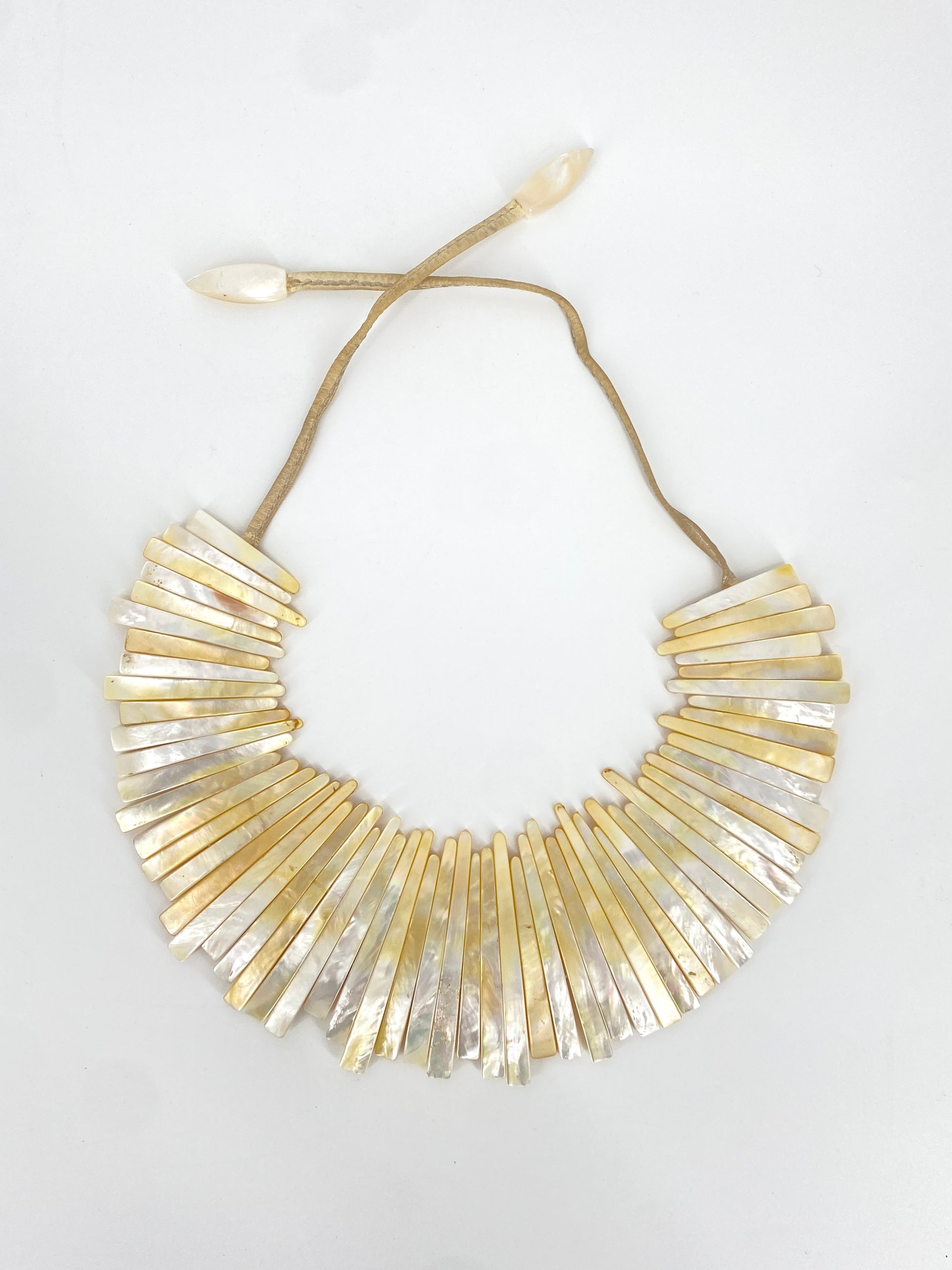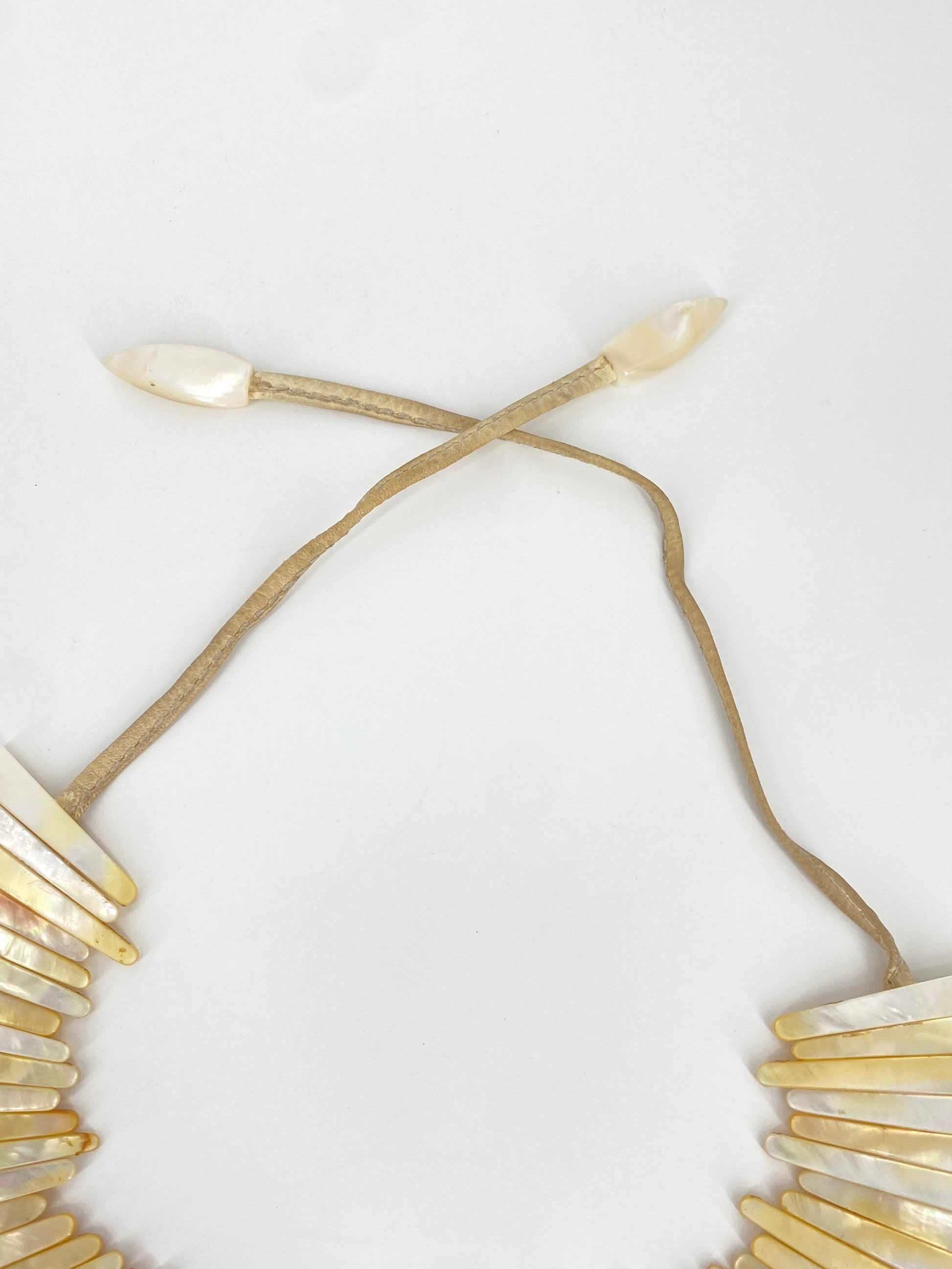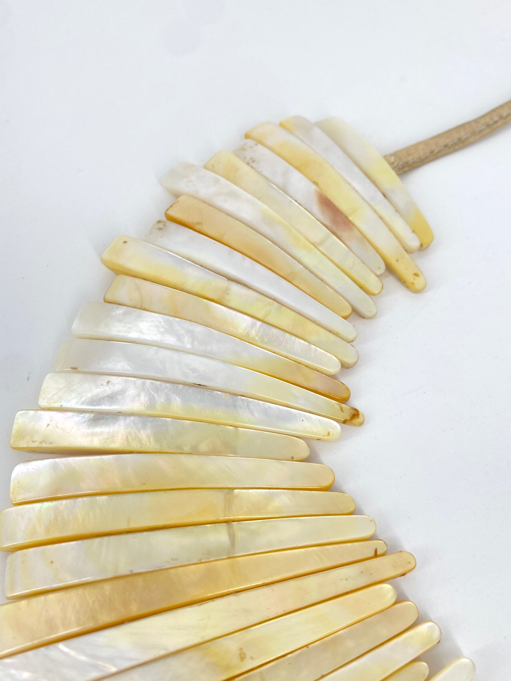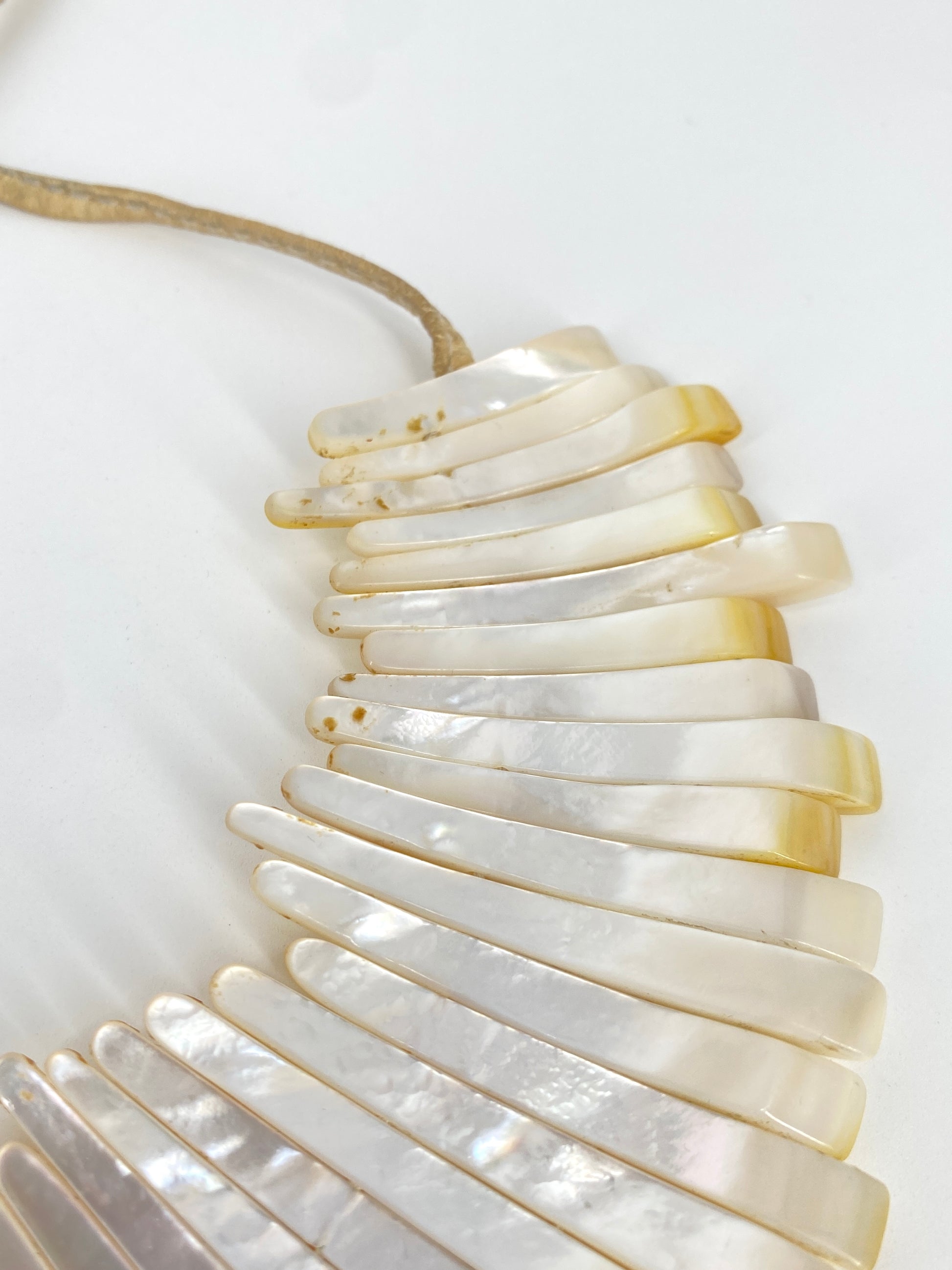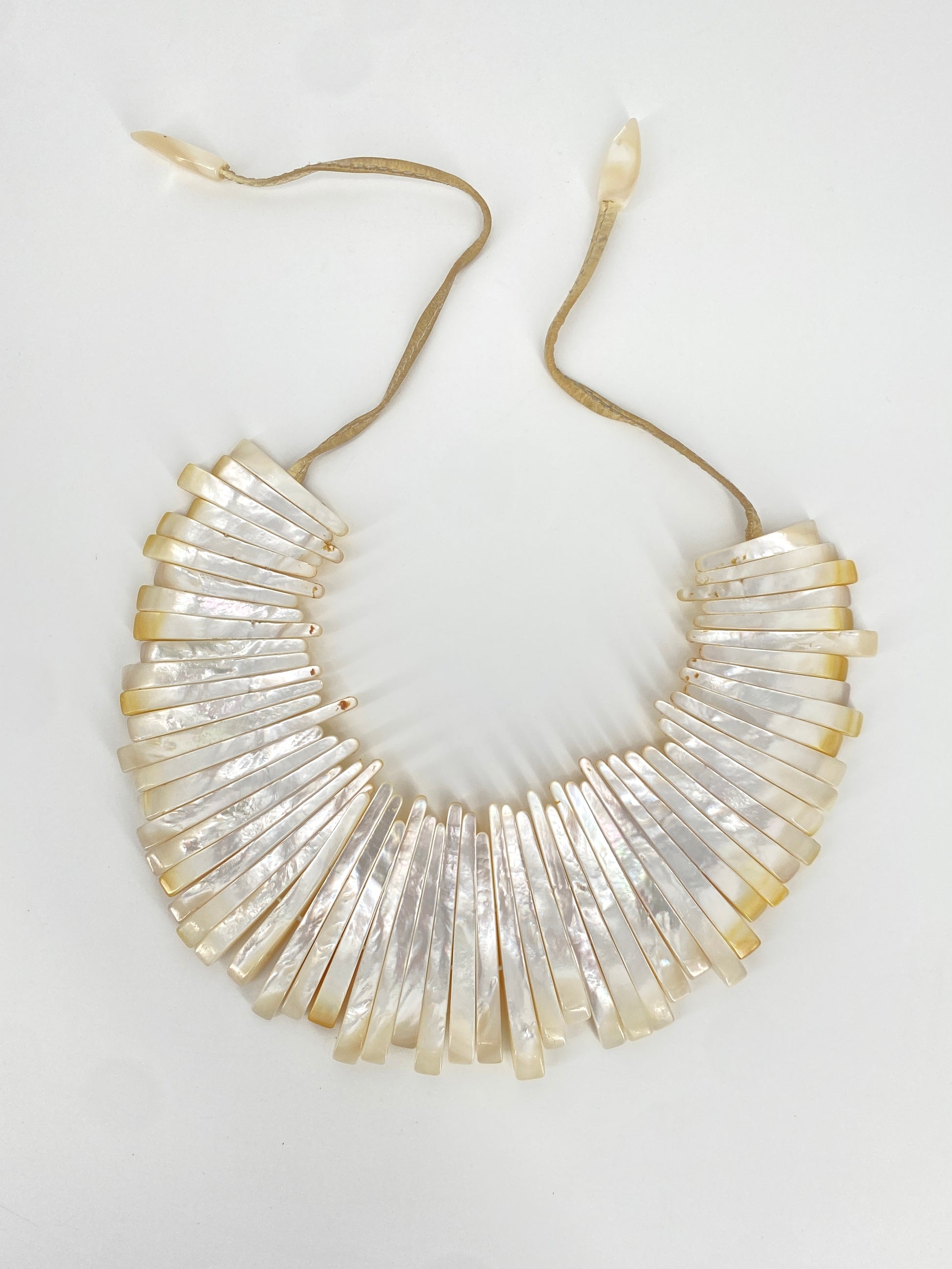 * Collier aus 59 leicht gebogenen Perlmutt Streifen mit einem beigen Lederband mit jeweils nochmal einem Perlmuttstück am Ende