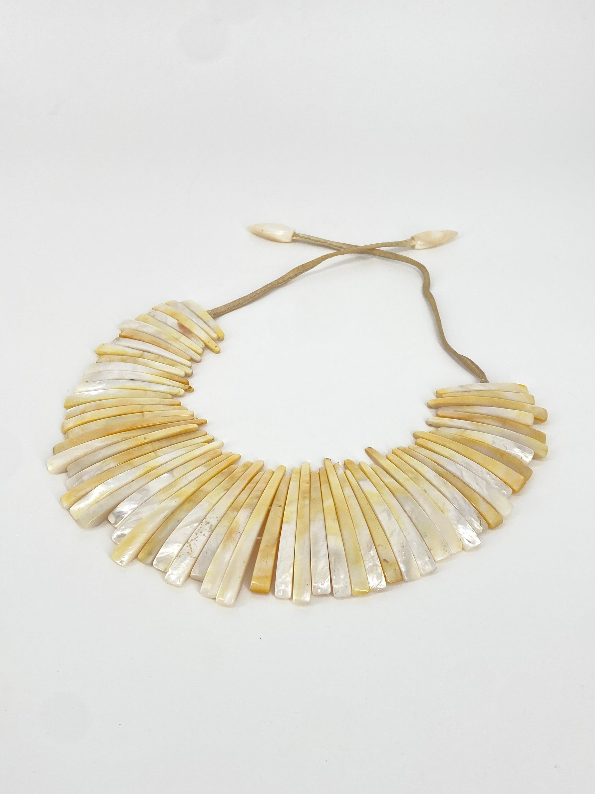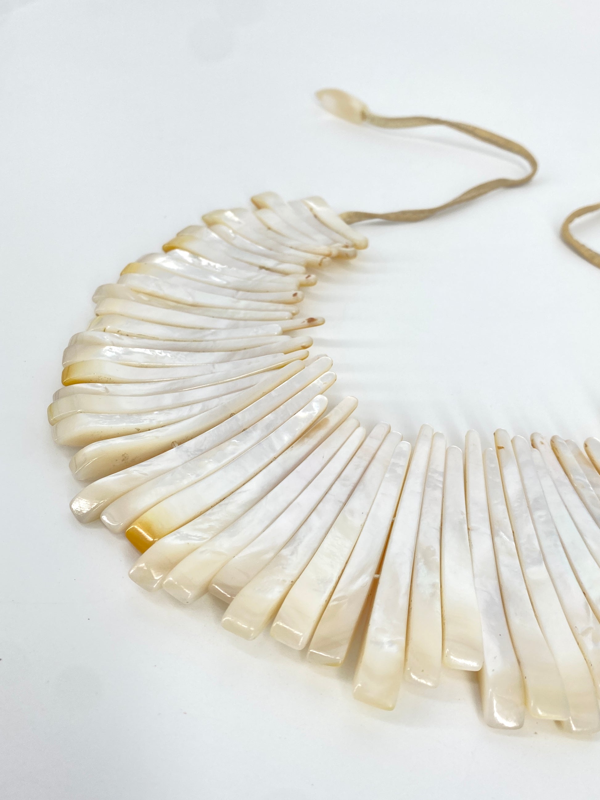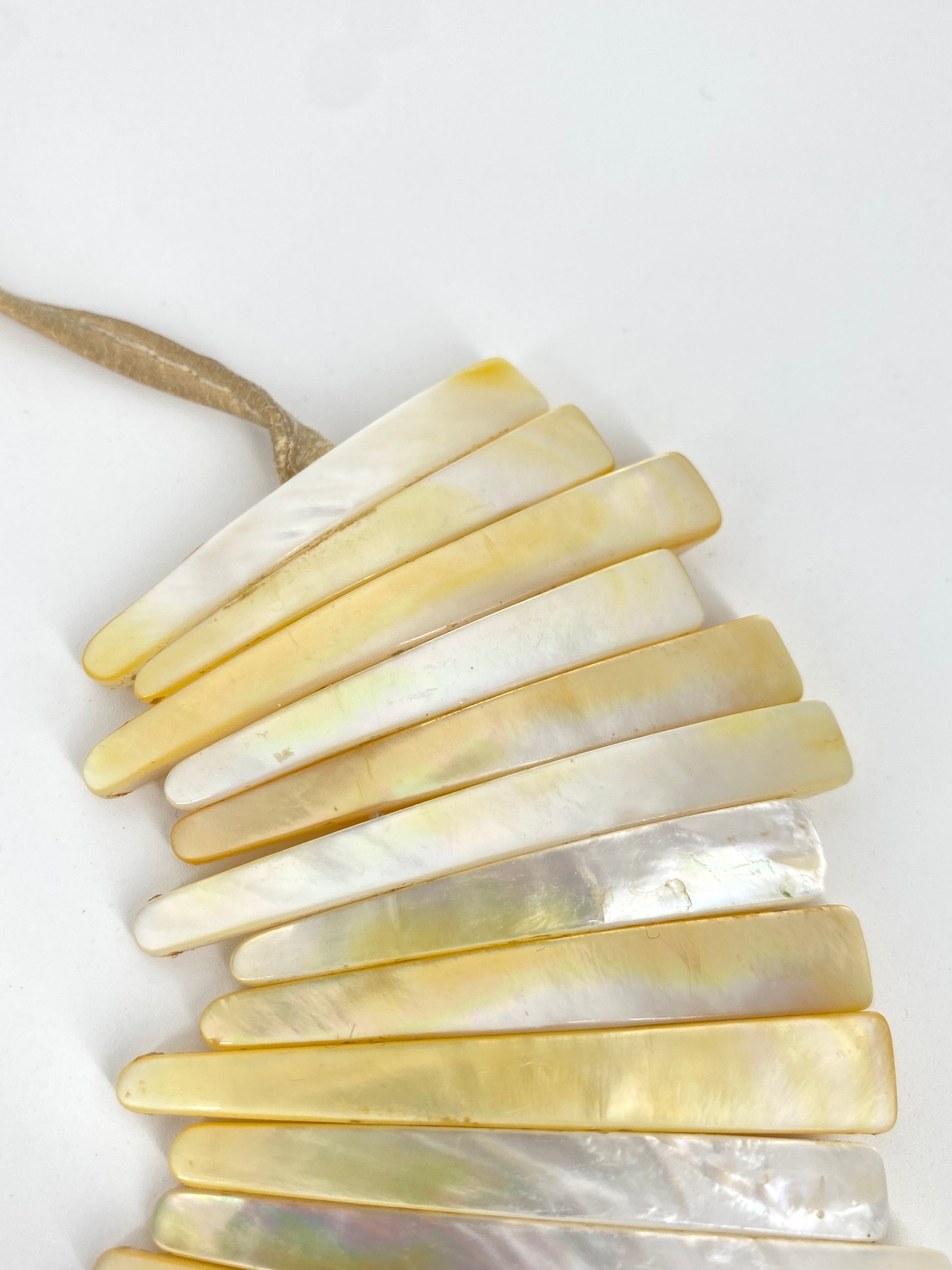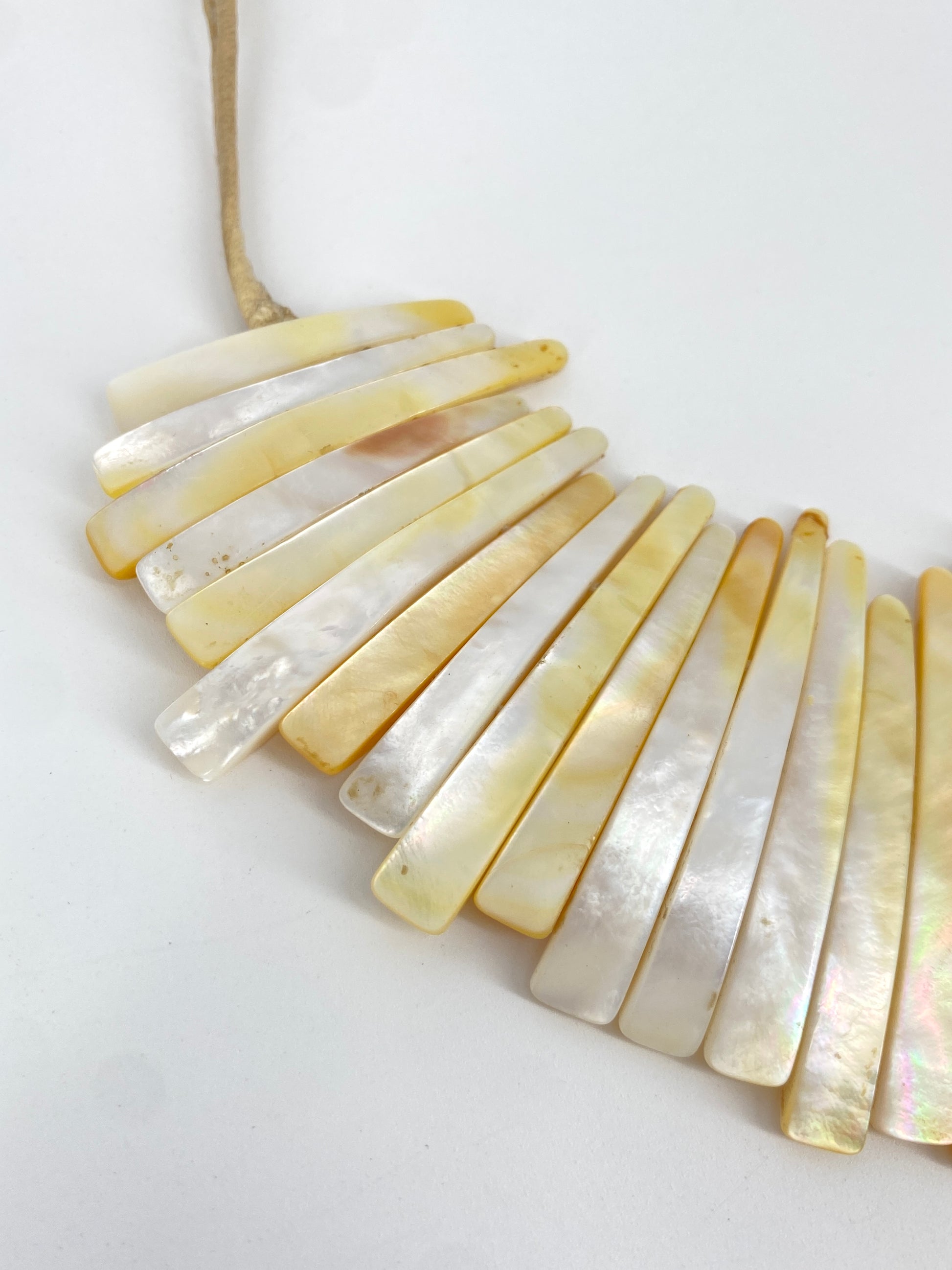 * Collier aus 59 leicht gebogenen Perlmutt Streifen mit einem beigen Lederband mit jeweils nochmal einem Perlmuttstück am Ende
