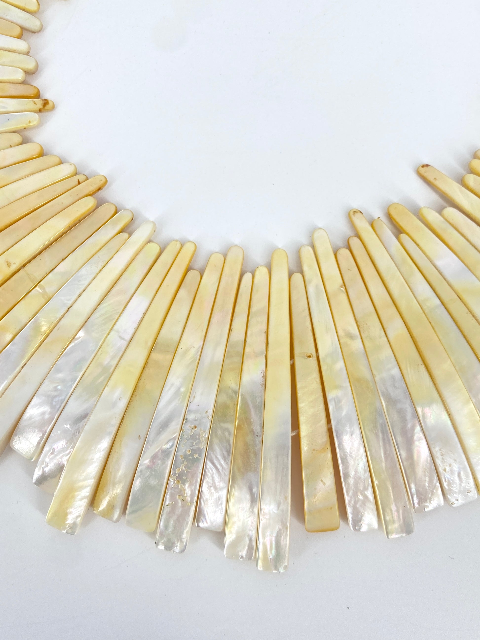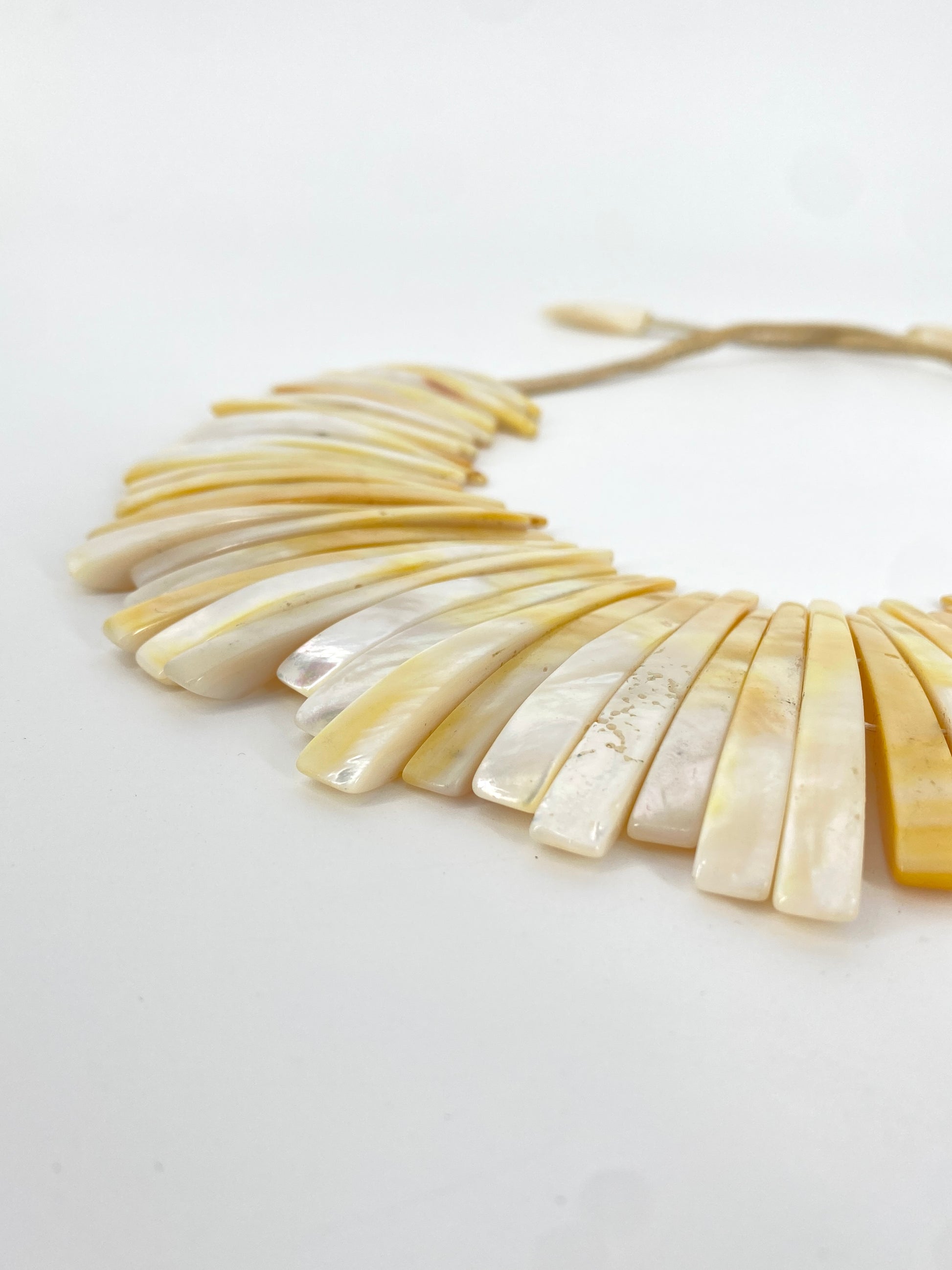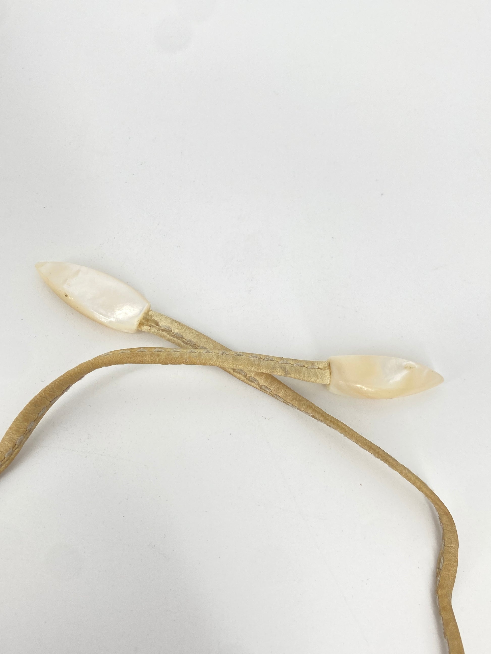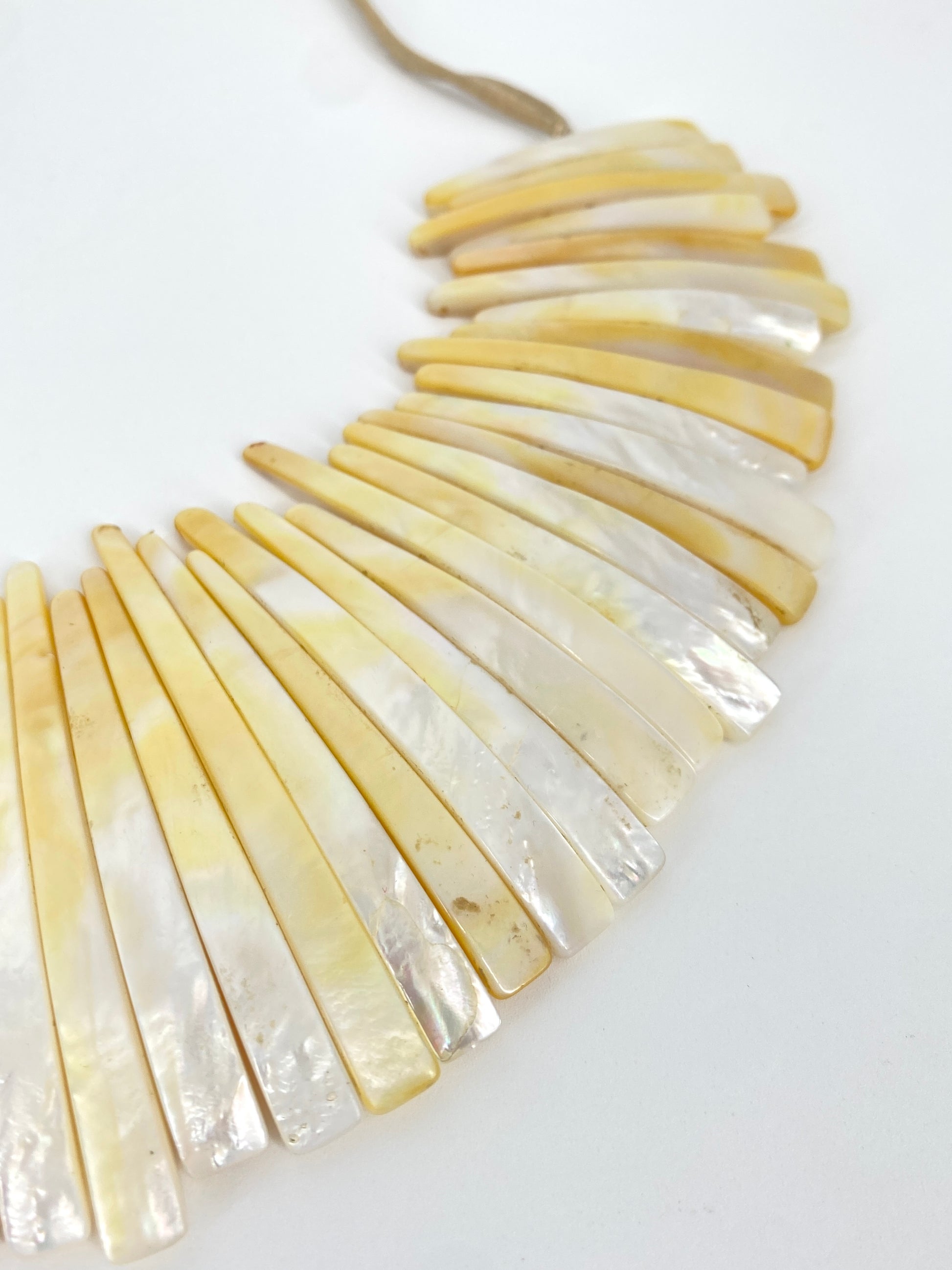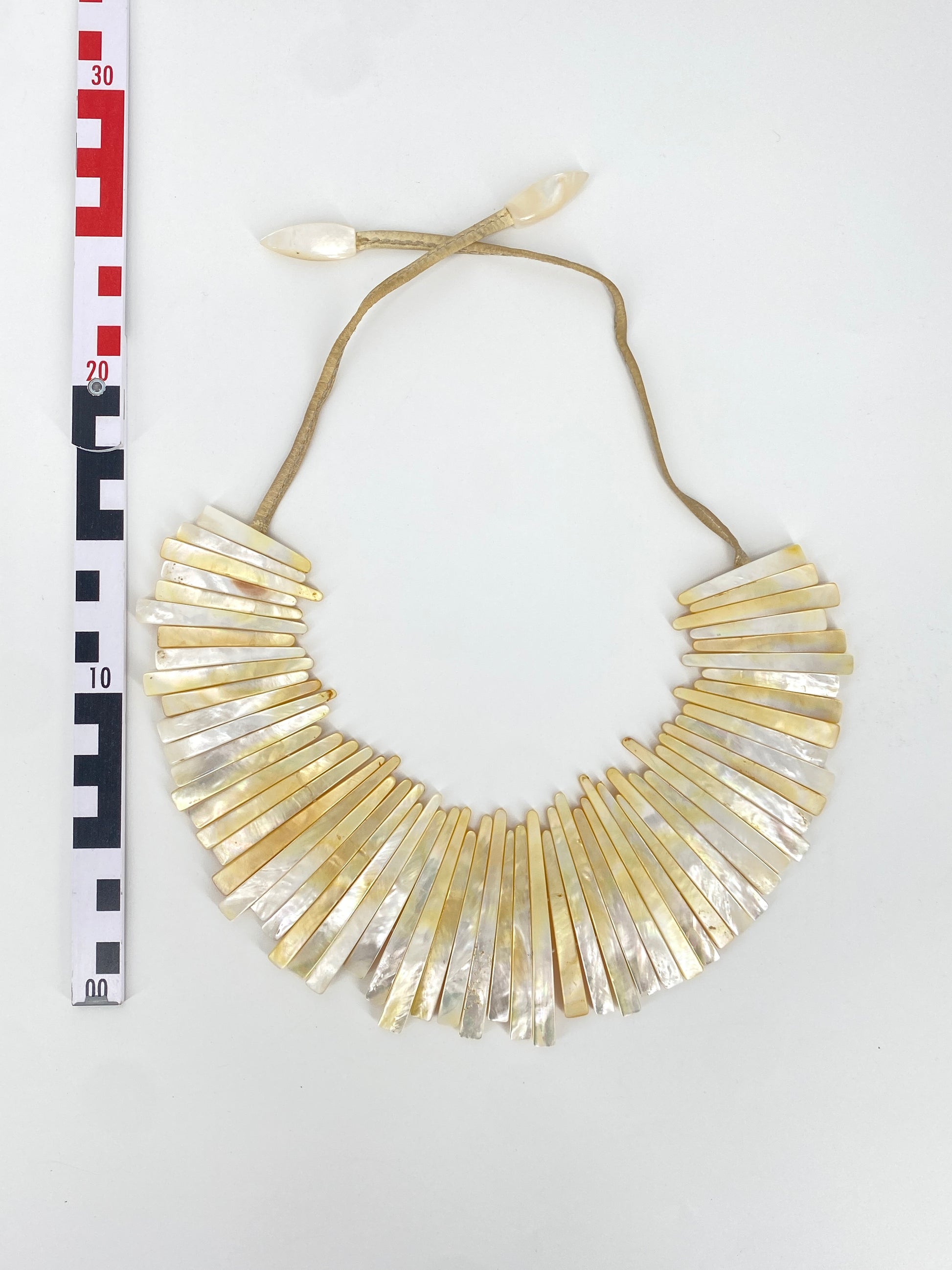 * Collier aus 59 leicht gebogenen Perlmutt Streifen mit einem beigen Lederband mit jeweils nochmal einem Perlmuttstück am Ende