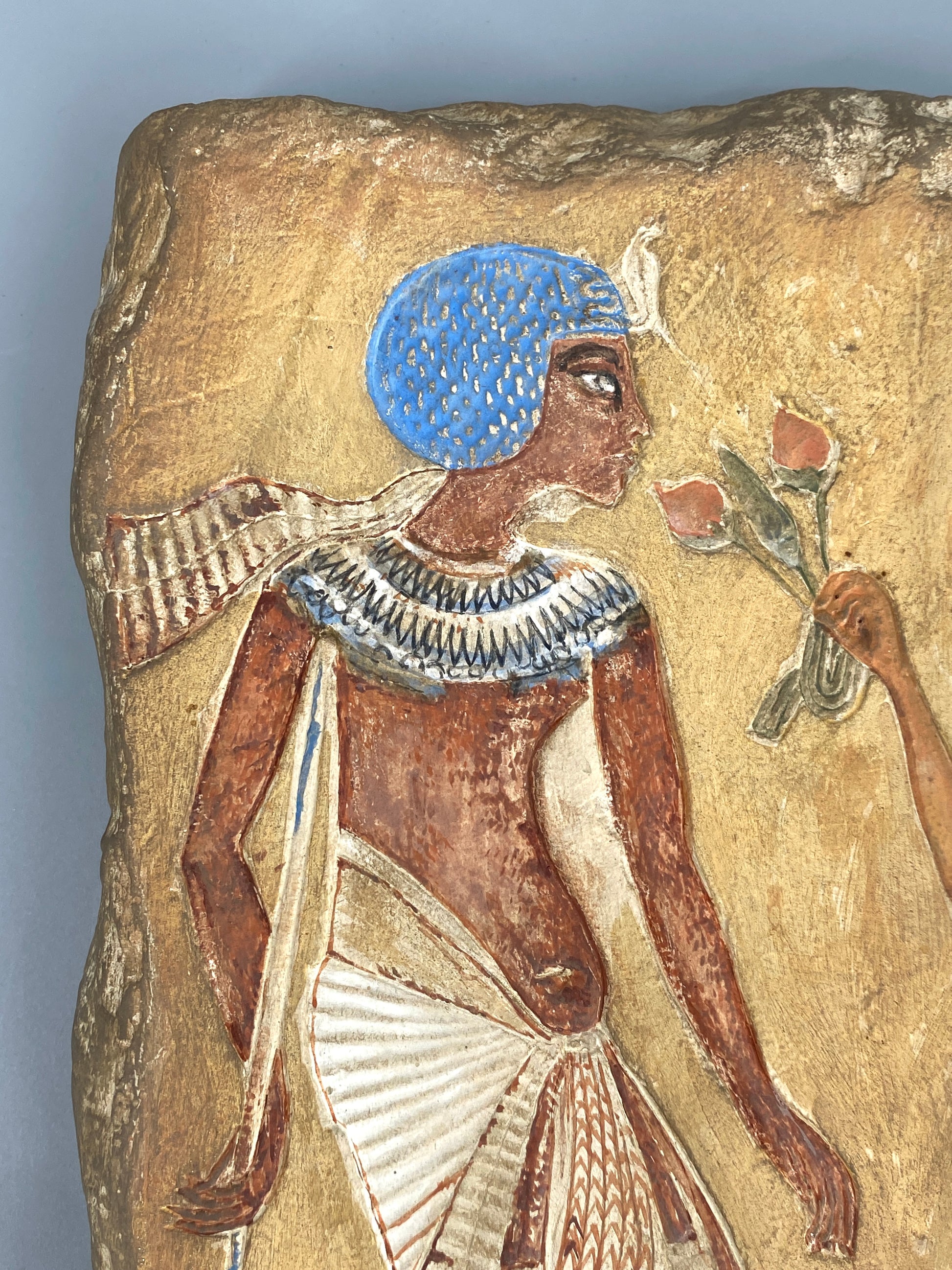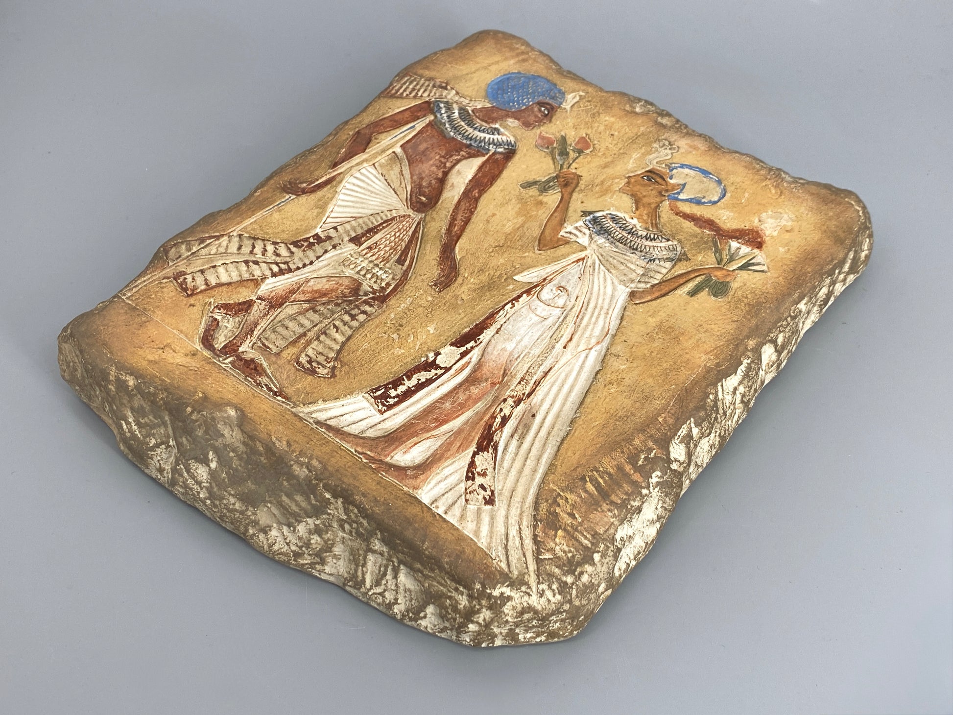 * RELIEFBILD GIPSFORMEREI BERLIN ÄGYPTISCH REPLIK ÄGYPTEN BEMALT NUMMERIERT 1982 KÖNIG KÖNIGIN SPAZIERGANG IM GARTEN