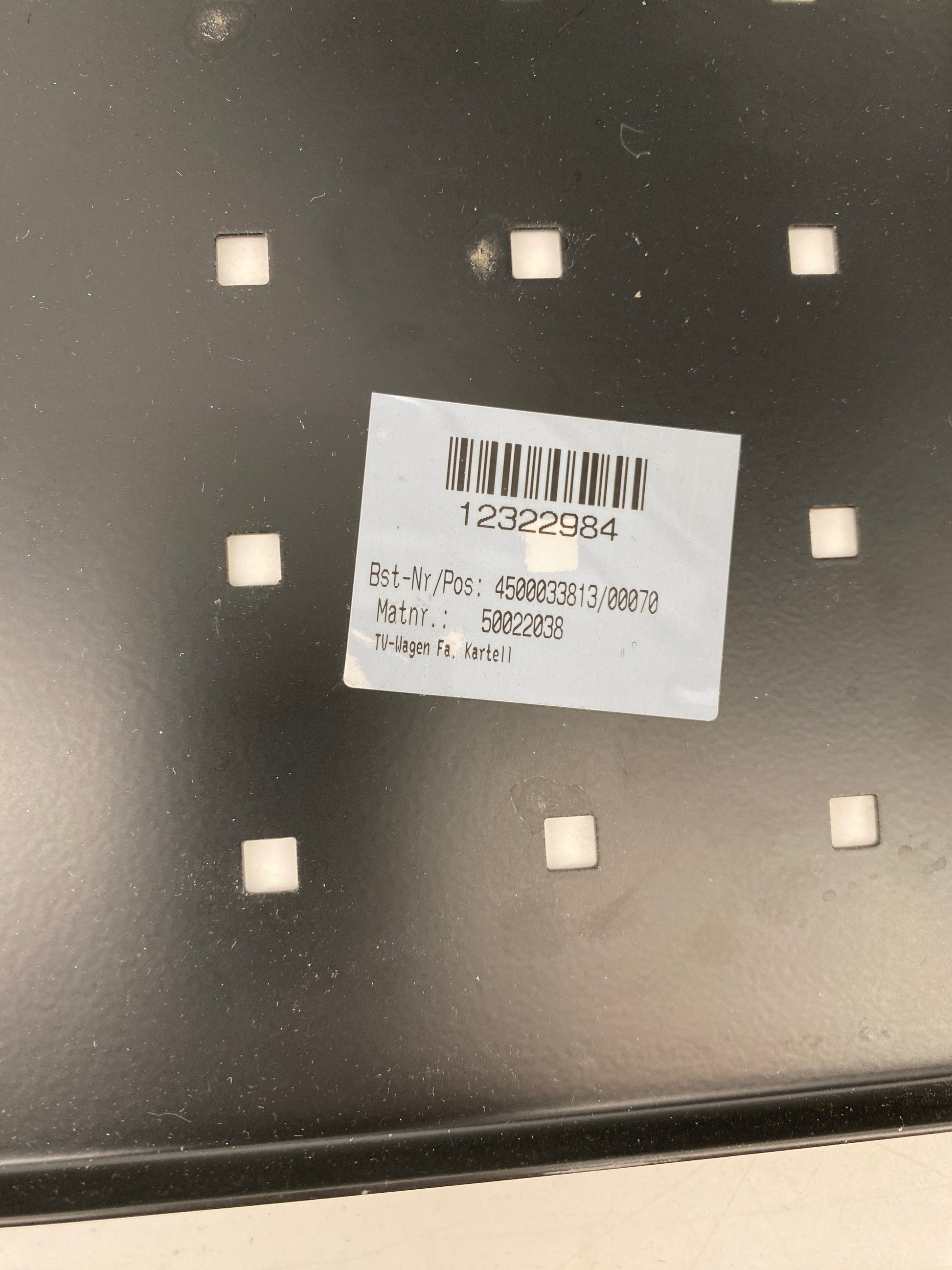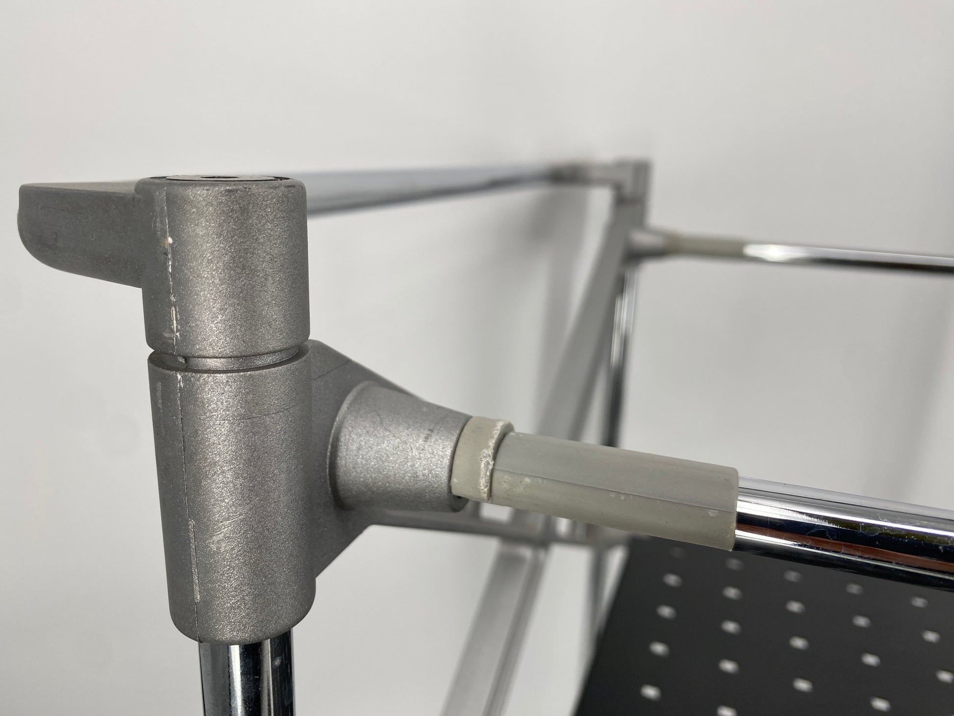 Die Struktur besteht aus Aluminiumgussteilen und verchromten Stahlrohren, die zwei Tabletts aus perforiertem, graphitgrau lackiertem Blech tragen.