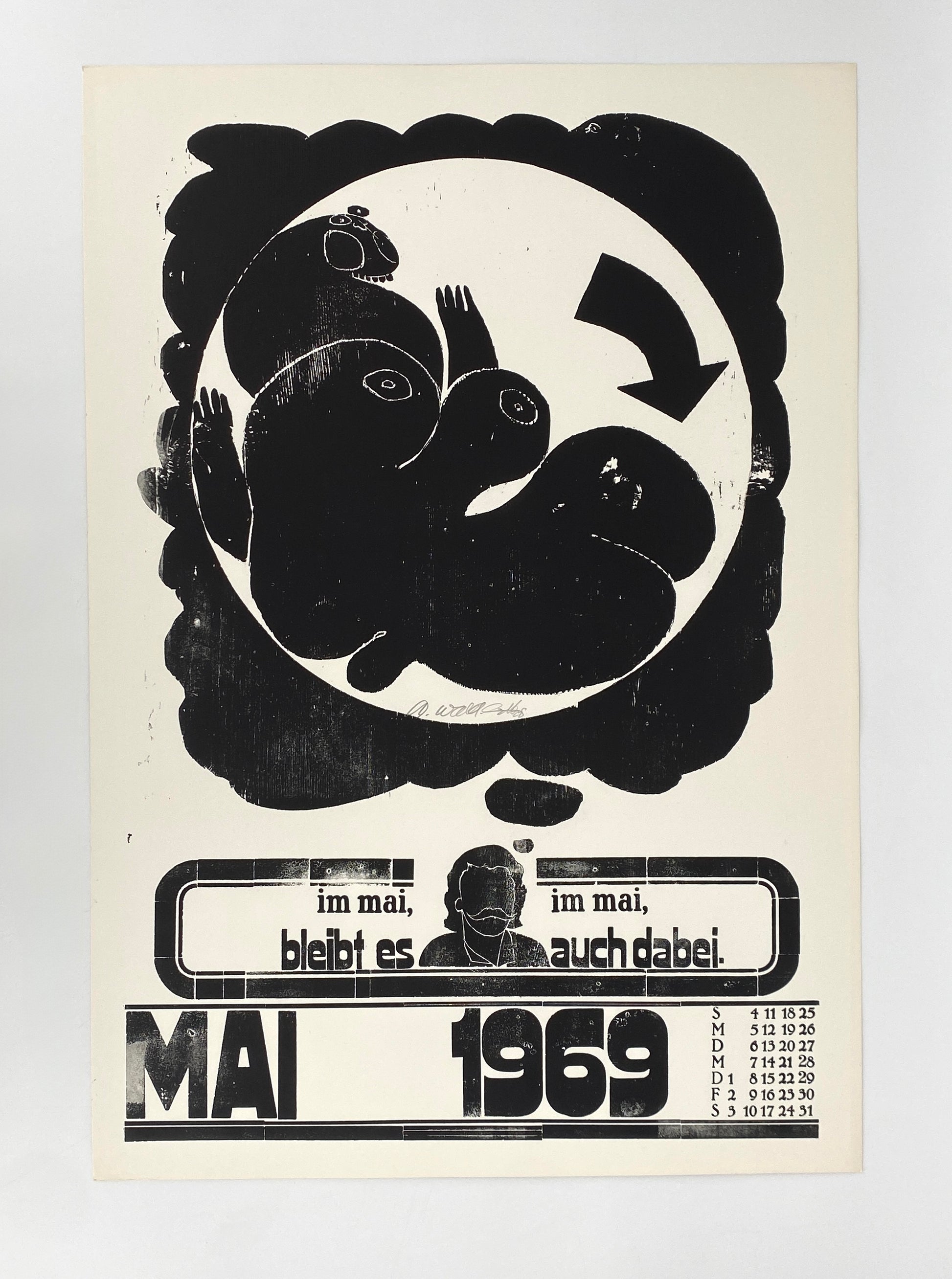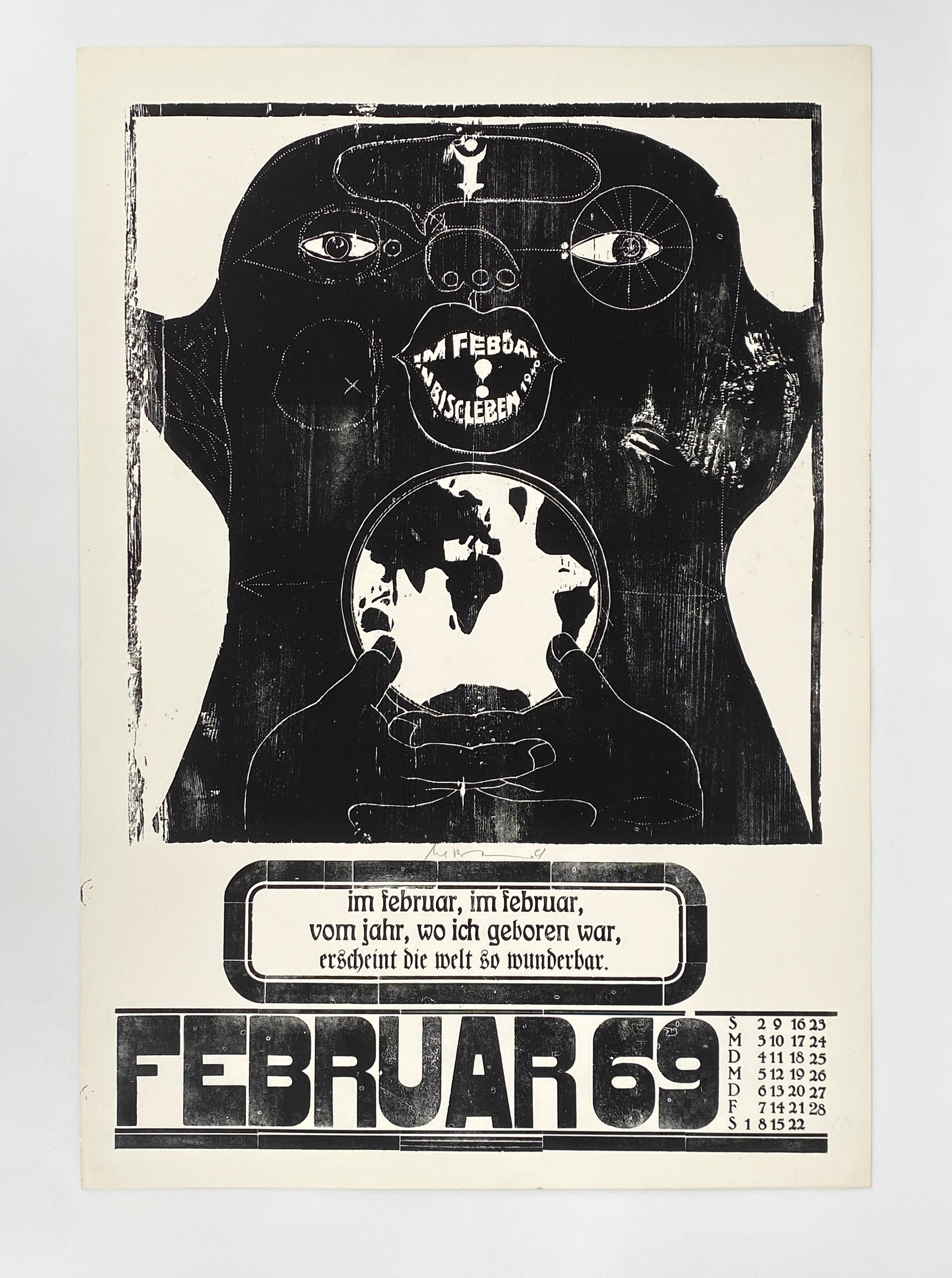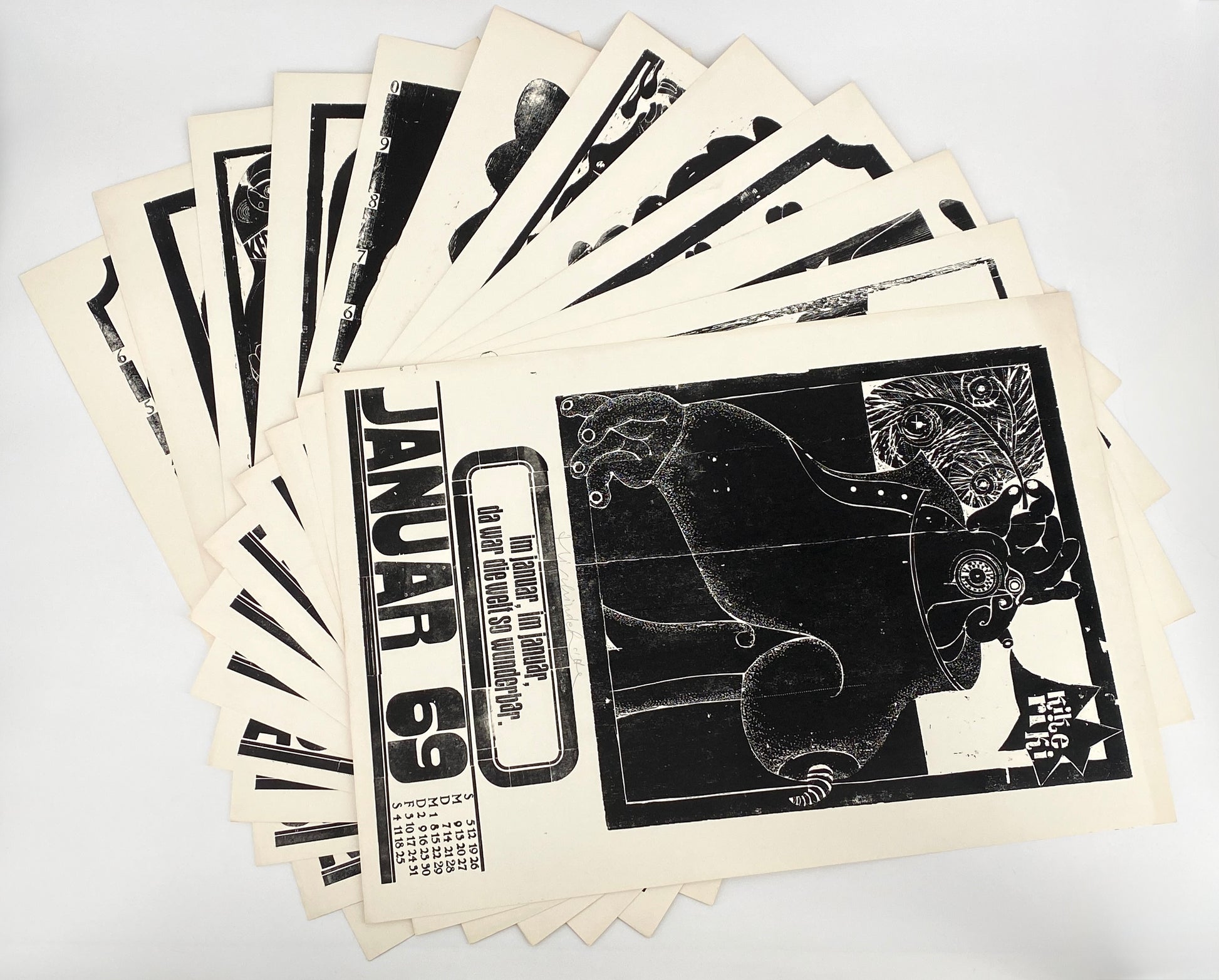 Signierte Holzschnittblätter des Bilderkalenders 1969 von Werkstatt Rixdorfer Drucke, Berlin