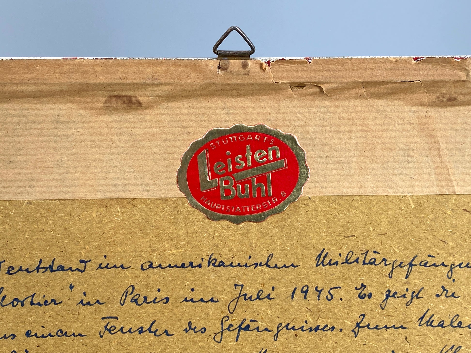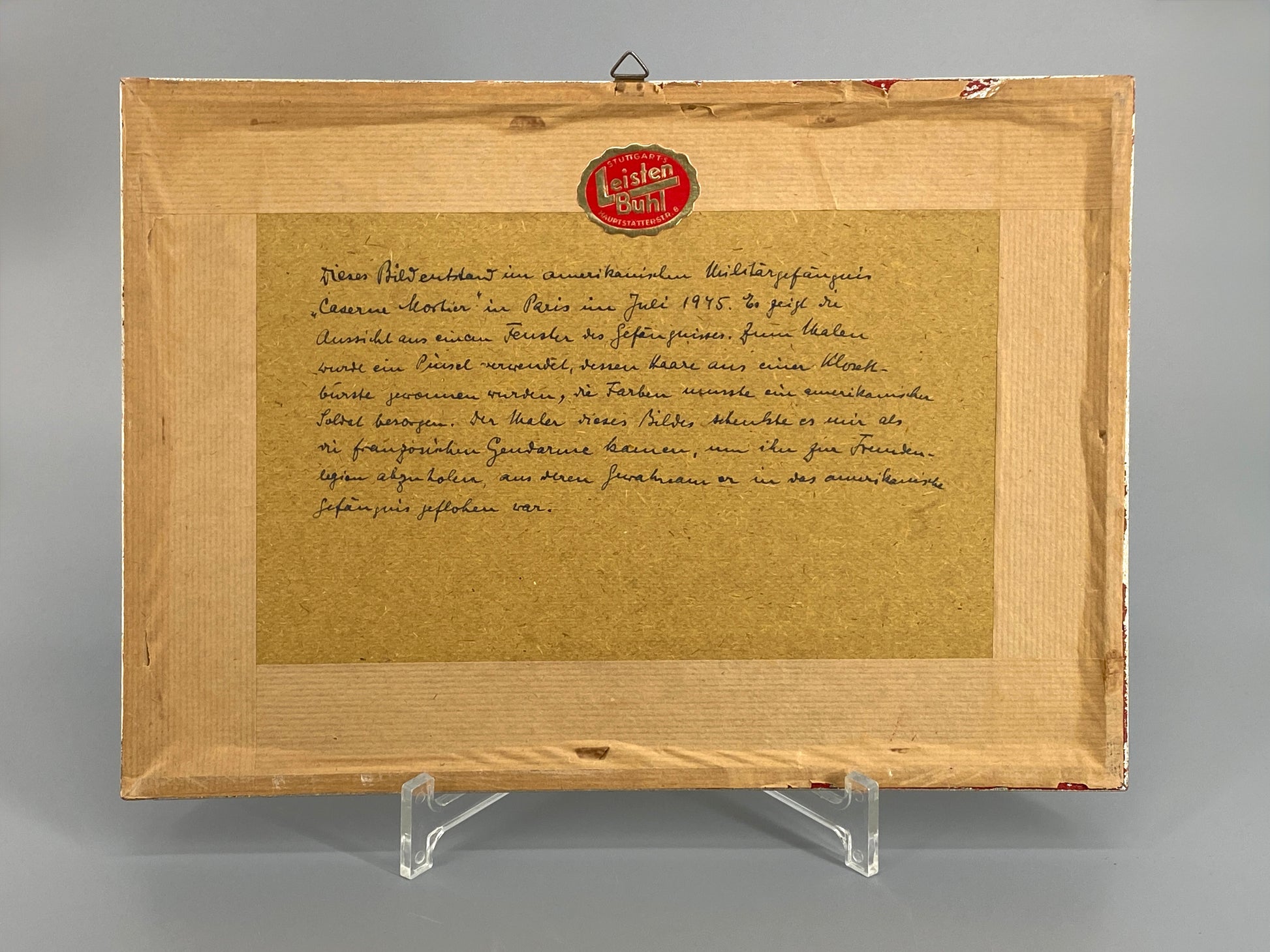 * auf der Rückseite eine Notiz von dem Eigentümer: „Dieses Bild entsatnd im amerikanischen Militärgefängnis „Caserne Mortier“ im Paris im Juli 1945. Es zeigt die Aussicht aus einem Fenster des Gefängnisses. Zum Malen wurde ein Pinsel verwendet, dessen Haare aus einer Klosettbürste genommen wurden, die Farben musste ein amerikanischer Soldat besorgen. Der Maler dieses Bildes schenkte es mir als die französischen Gendarme kamen, um ihn zur Fremdenlegion abzuholen, aus deren Gewahrsam er in das amerikanische Gefängnis geholfen war.“