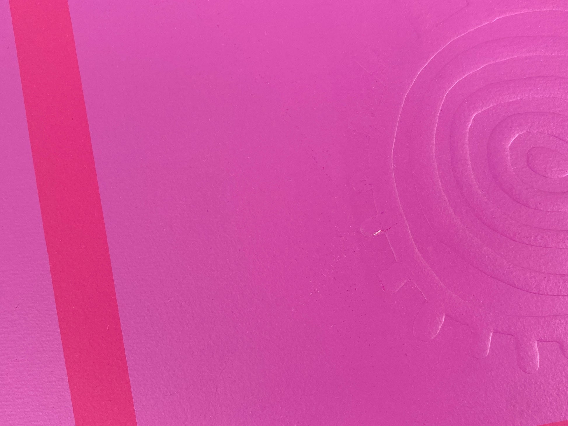 * ein Siebdruck in Malvenfarbe und Violett mit einem Prägedruck im Blatt