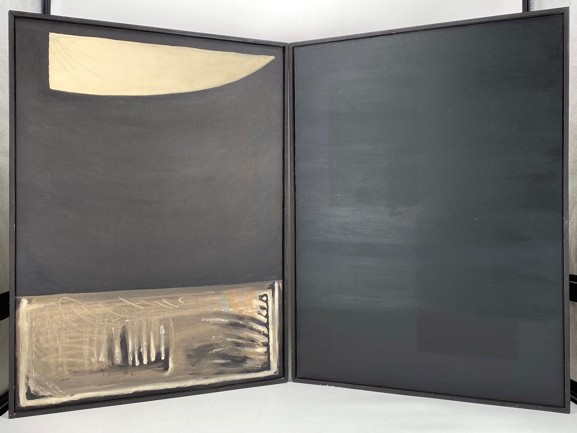 * 2x ACRYLGEMÄLDE ABSTRAKT SCHWARZ 1985 LEINWAND GERAHMT DIPTYCHON MONOCHROM
